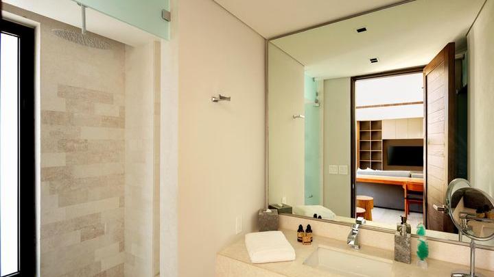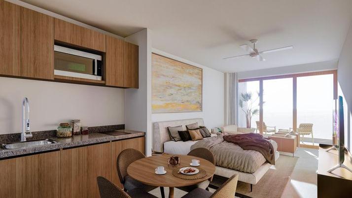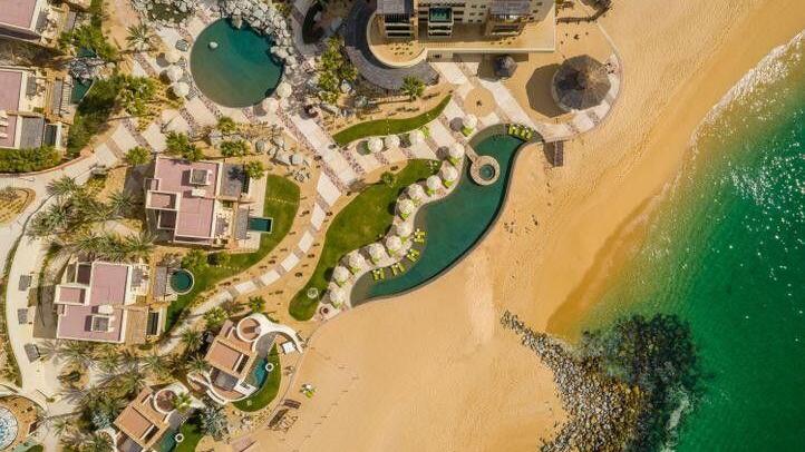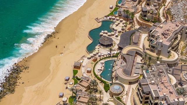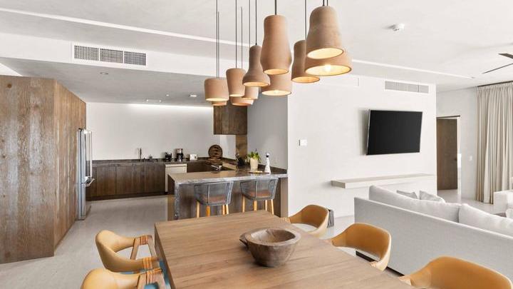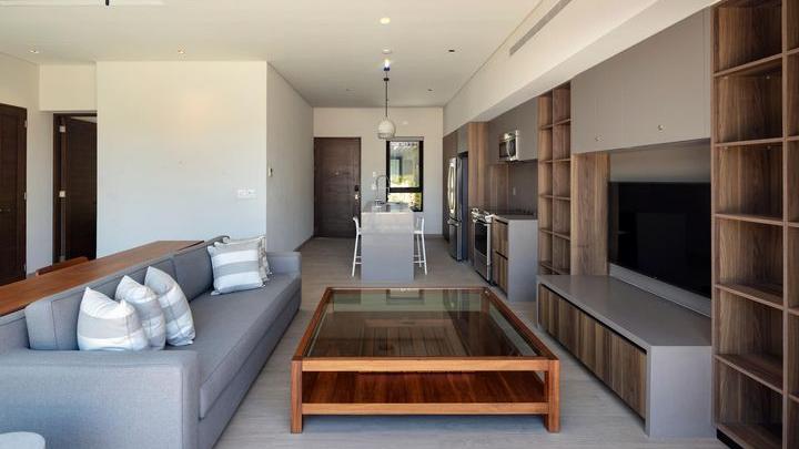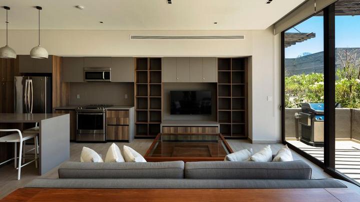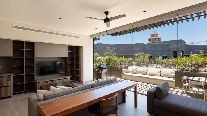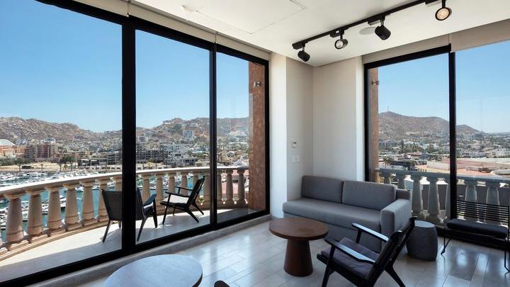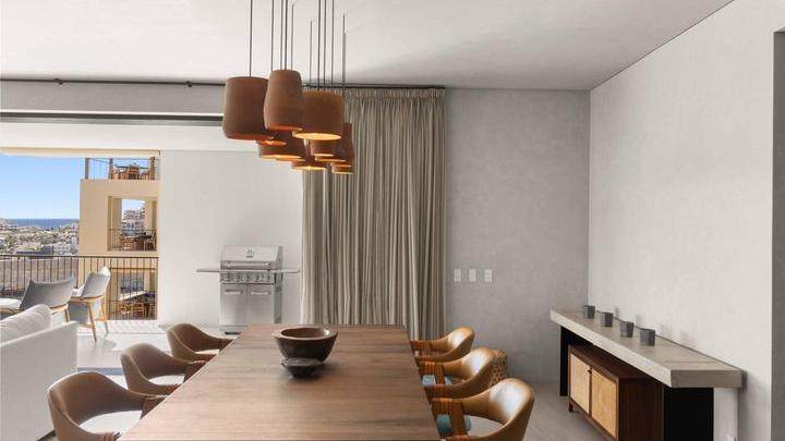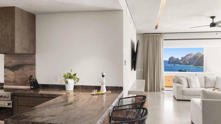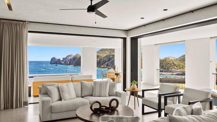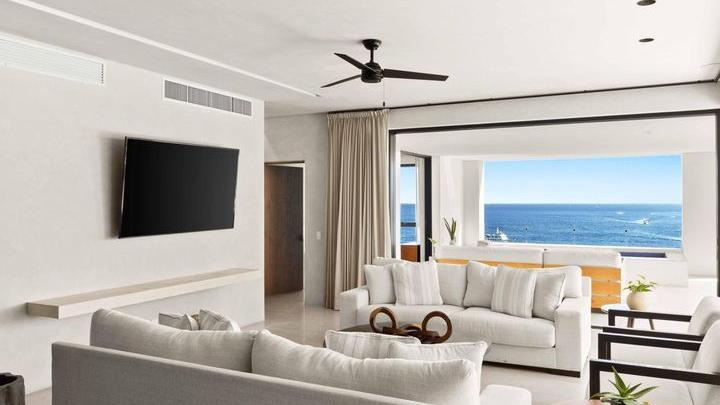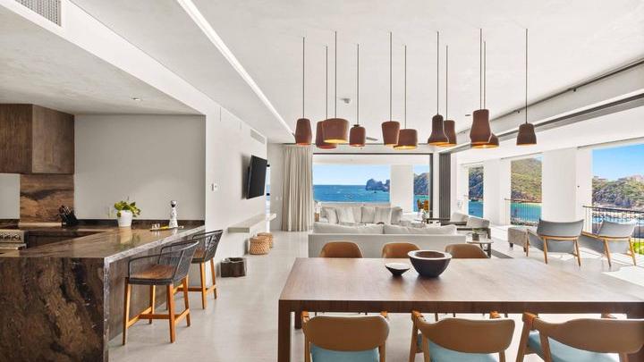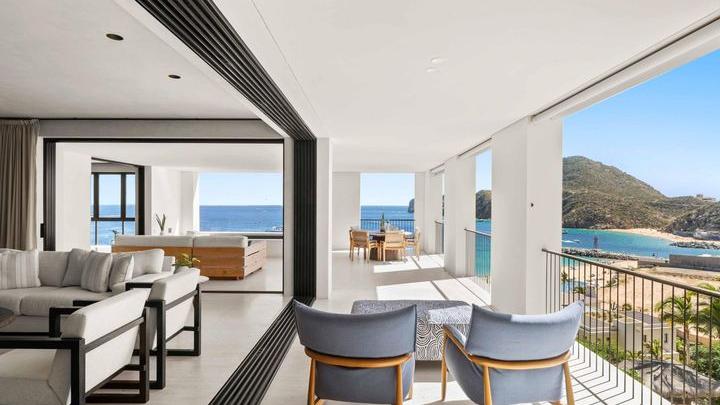 Perched on the 5th floor, this stunning 2-bedroom residence with a den at 1 Homes Cabo offers breathtaking views of Land...