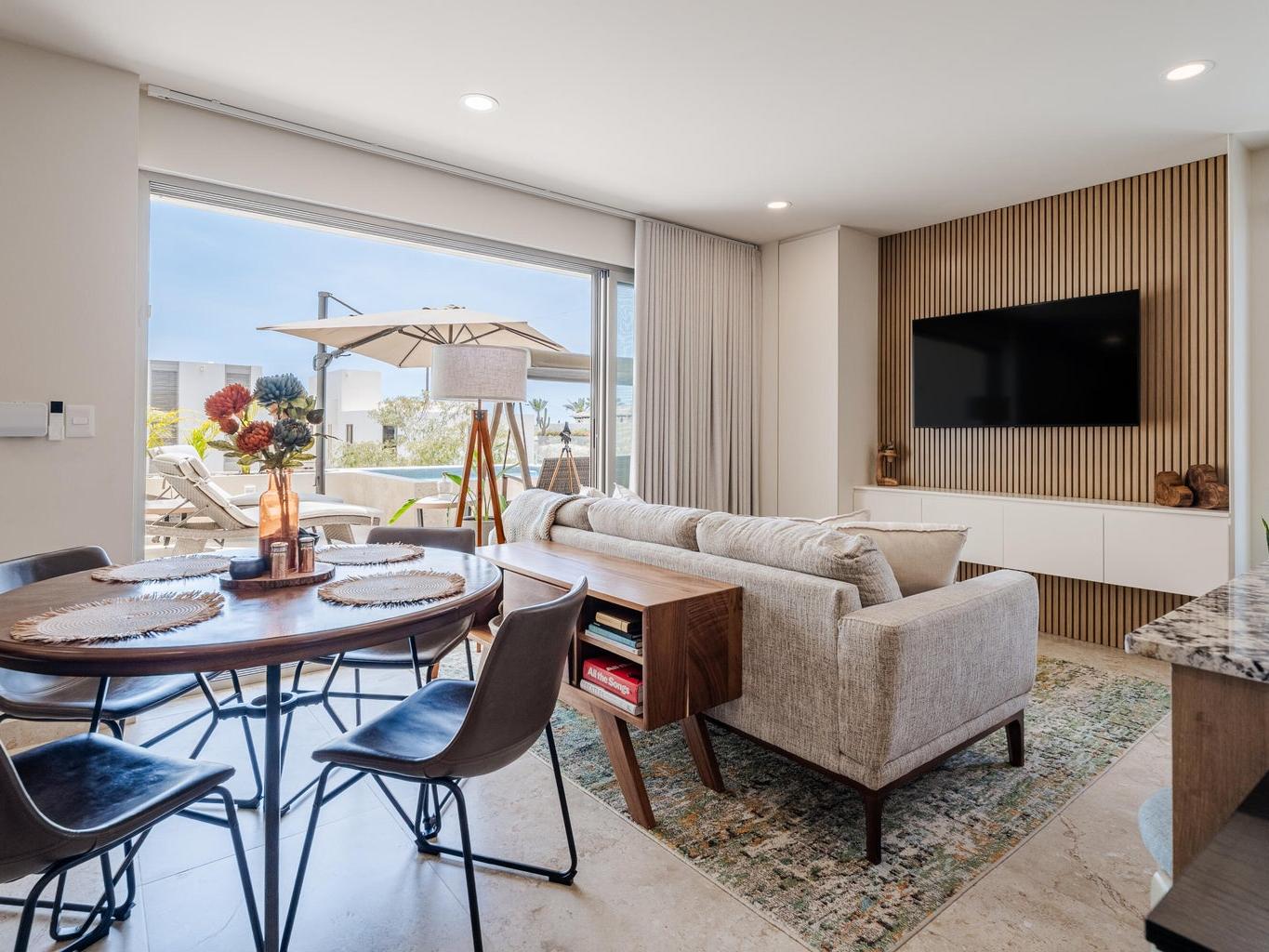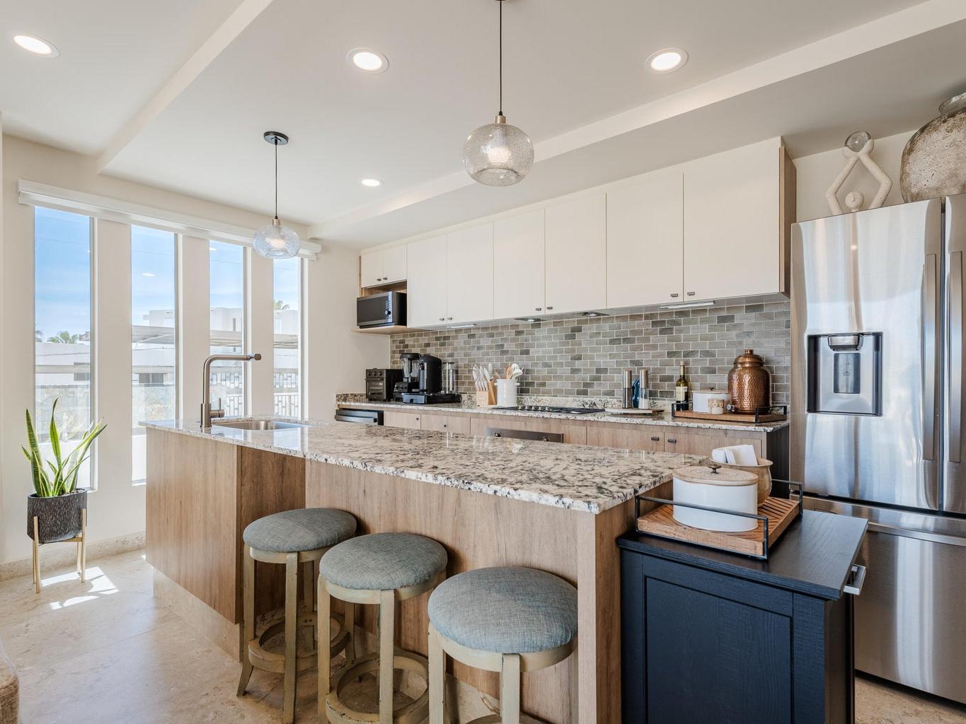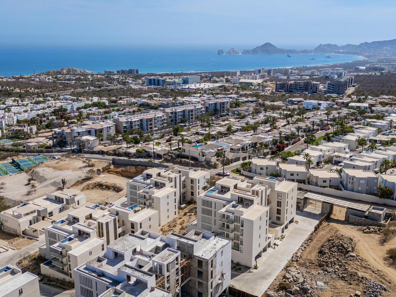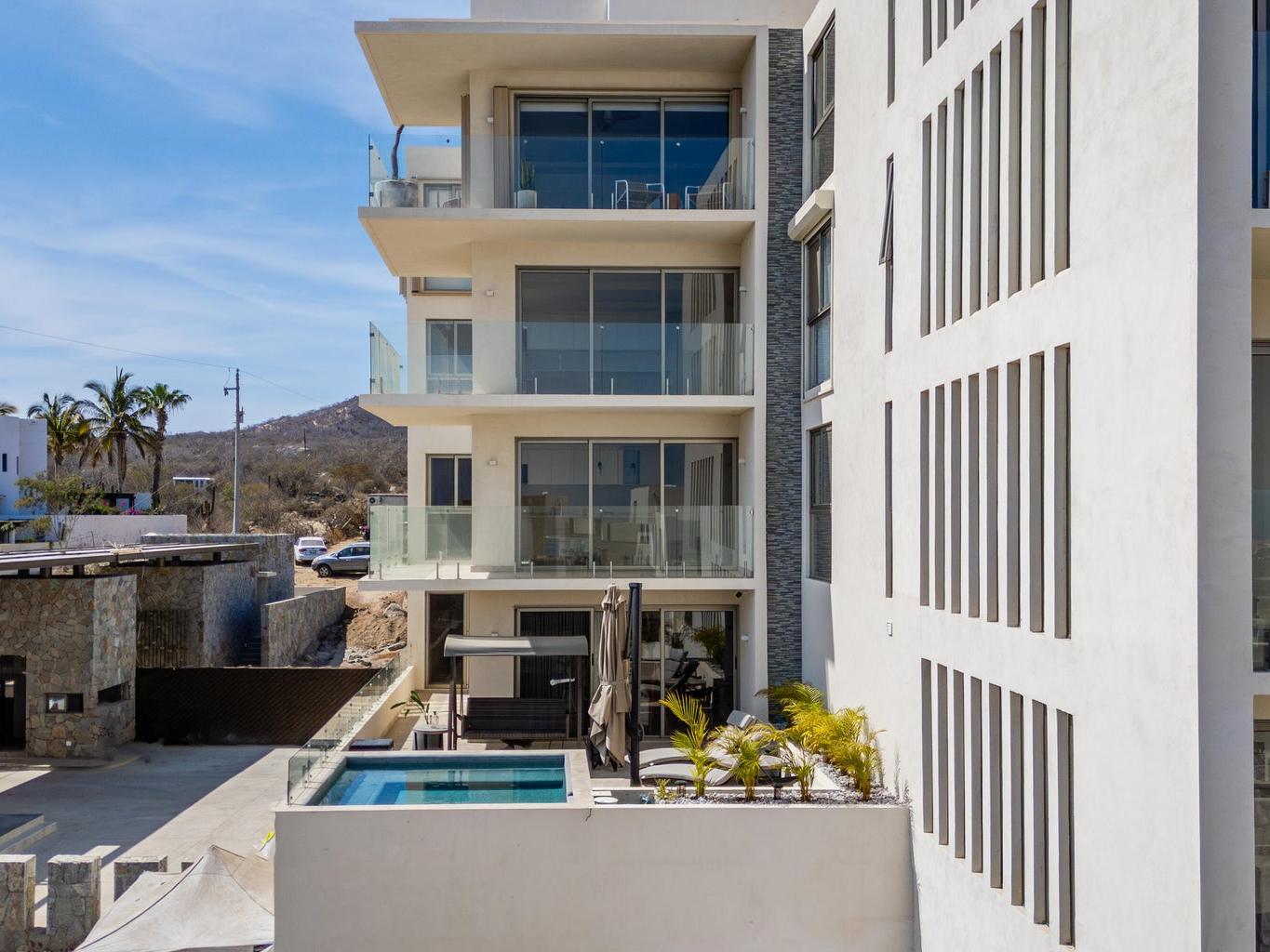 Gorgeous Contemporary 2 Bedroom Turn Key Pent Garden with Private Pool in Cabo San Lucas! Located in the brand new and modern community of Cabo Costa, this professionally furnished and beautifully decorated, 1,635 Sqft condo offers a great functional layout that includes 2 bedrooms with ensuite bathrooms, a half bath with laundry room and an amazing private terrace with pool, sun deck and lounge area. Offered as you see in pictures plus 2 covered parking spaces and large storage bodega. Gated and guarded 24/7, the community includes amenities such as Club House, infinity (heated) pool, gym, sundeck, snackbar, office work space with incredible views and more. Located 5 to 10 minutes from superstores, restaurants, swimmable beaches and Downtown Cabo. Great rental income generating property!