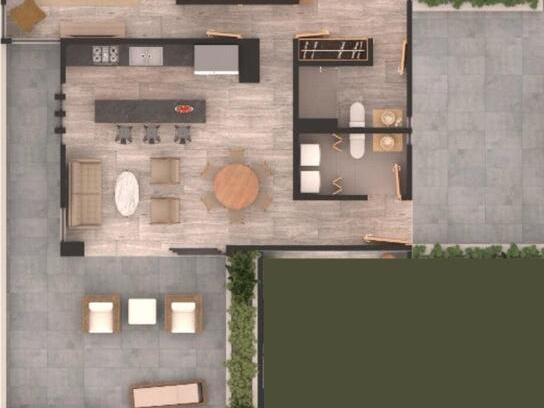 This unit features a private plunge pool, ideal for cooling off or enjoying quiet evenings. The open-concept layout flows seamlessly into a sleek modern kitchen and spacious living area, designed for both relaxation and entertaining.