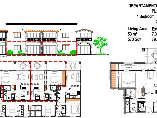 The ground floor has a rear patio, and the second-floor studios have individual roof terraces for each apartment.