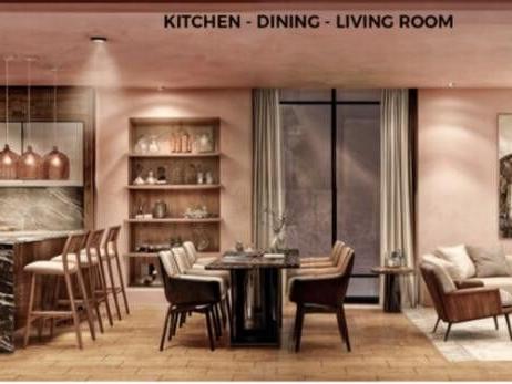 2 bedrooms,2 full bathrooms + 1 half bath, Open-concept kitchen, living, and dining area.