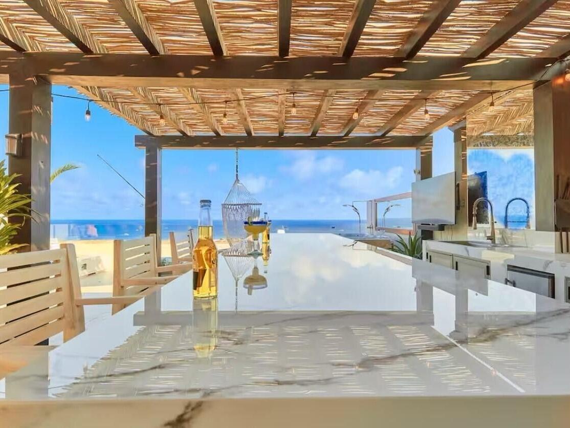 The rooftop space features built-in couches for ultimate relaxation, an eight-person round table for dining and entertaining, and a top-of-the-line porcelain bar for enjoying every sunset with a cocktail in hand.