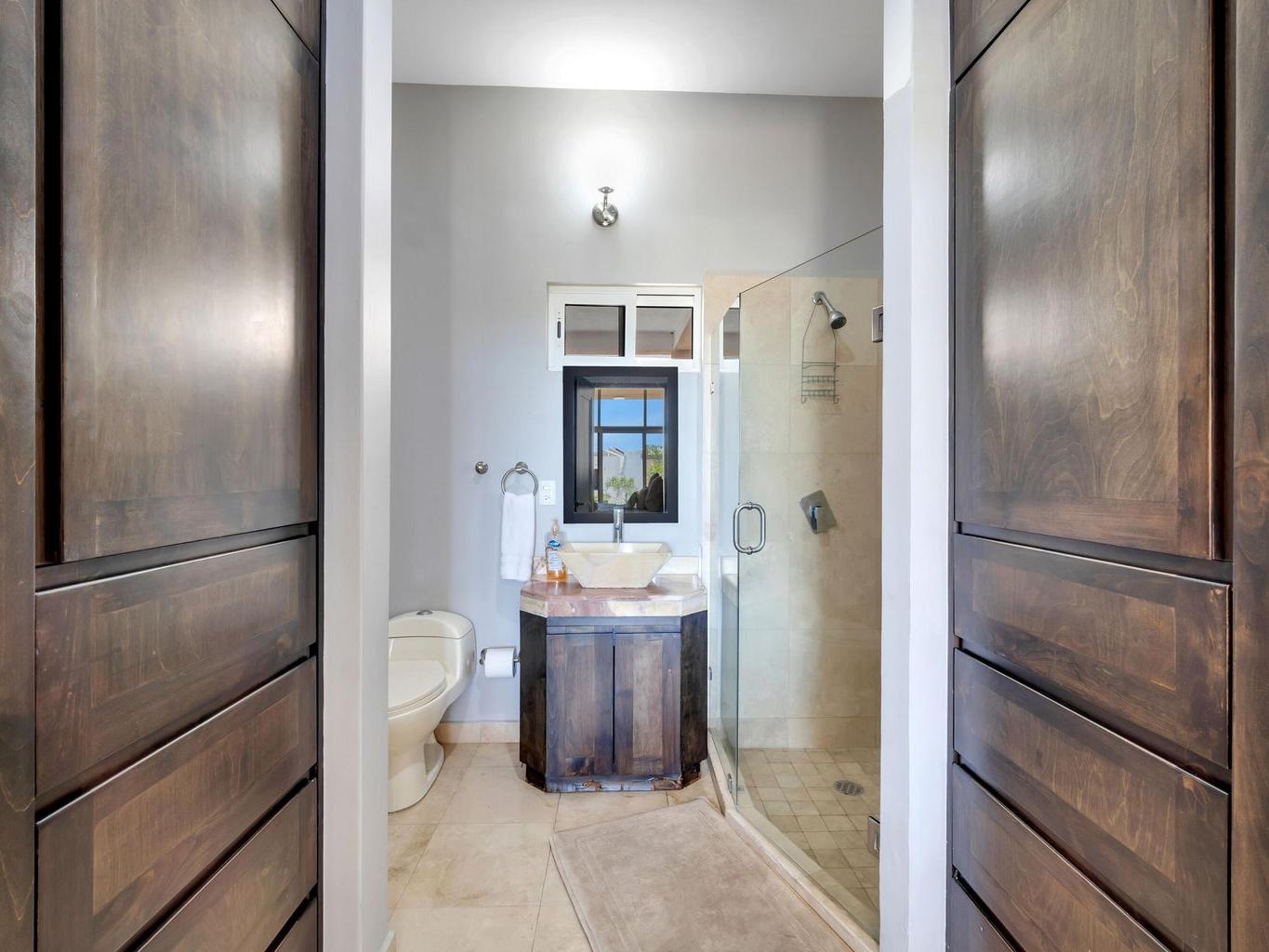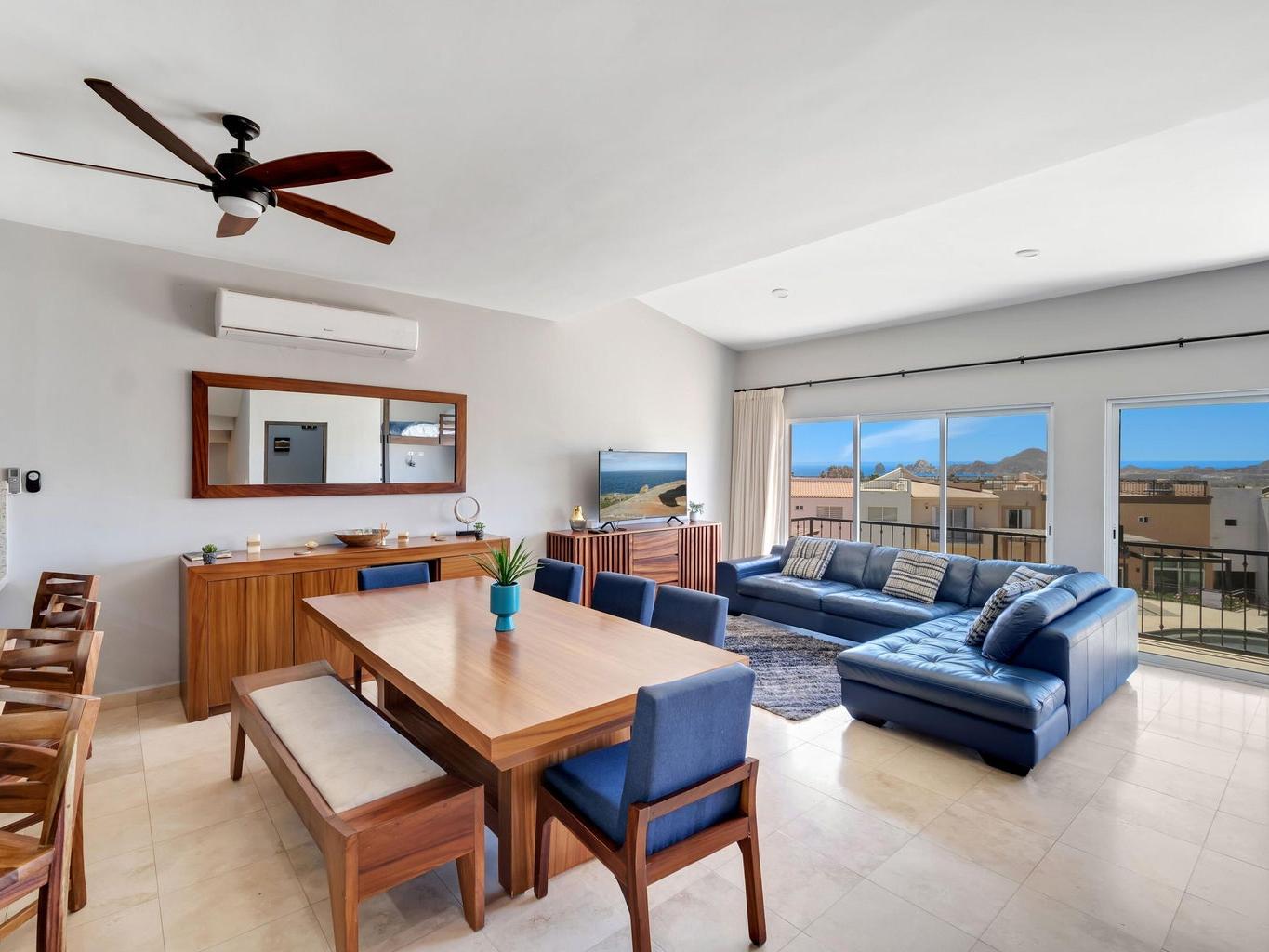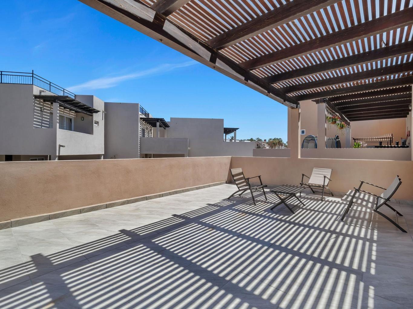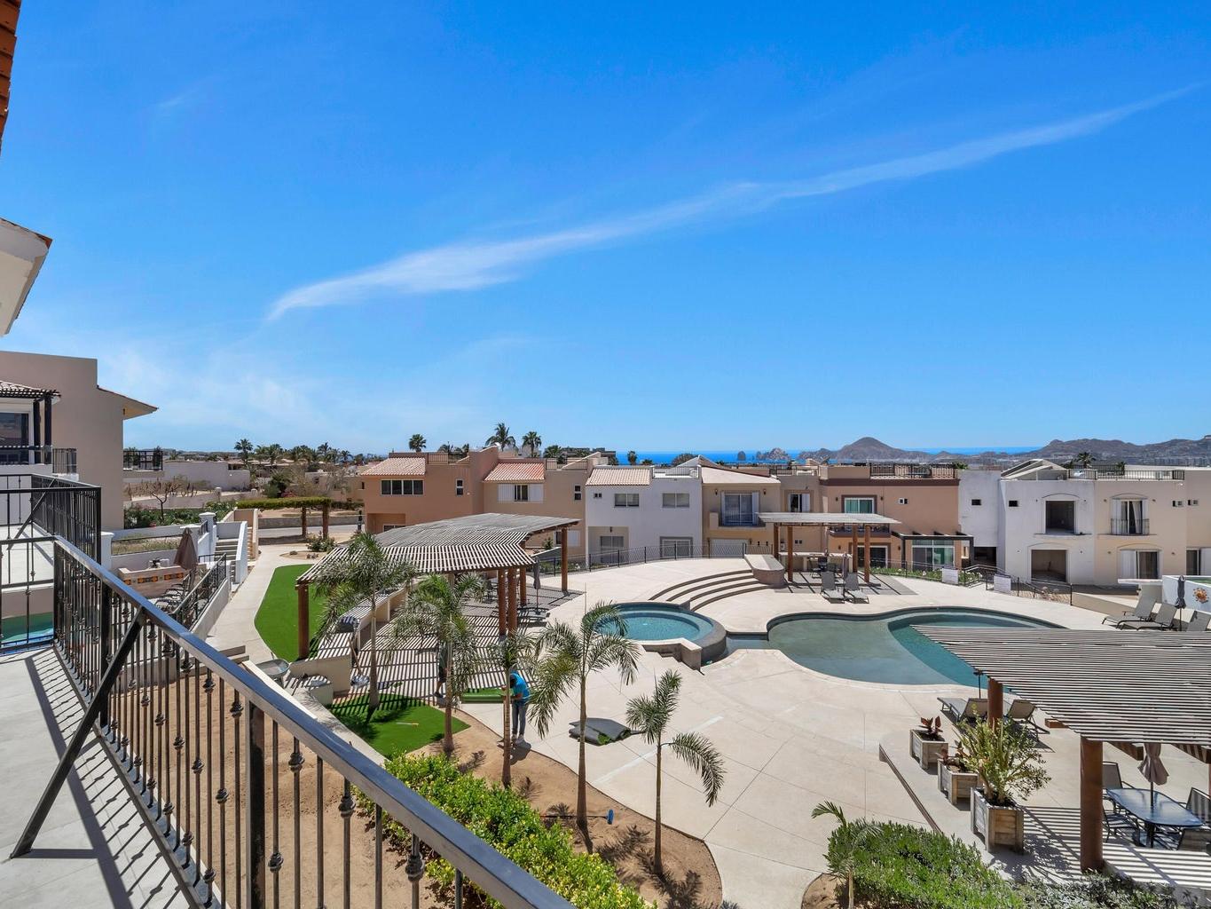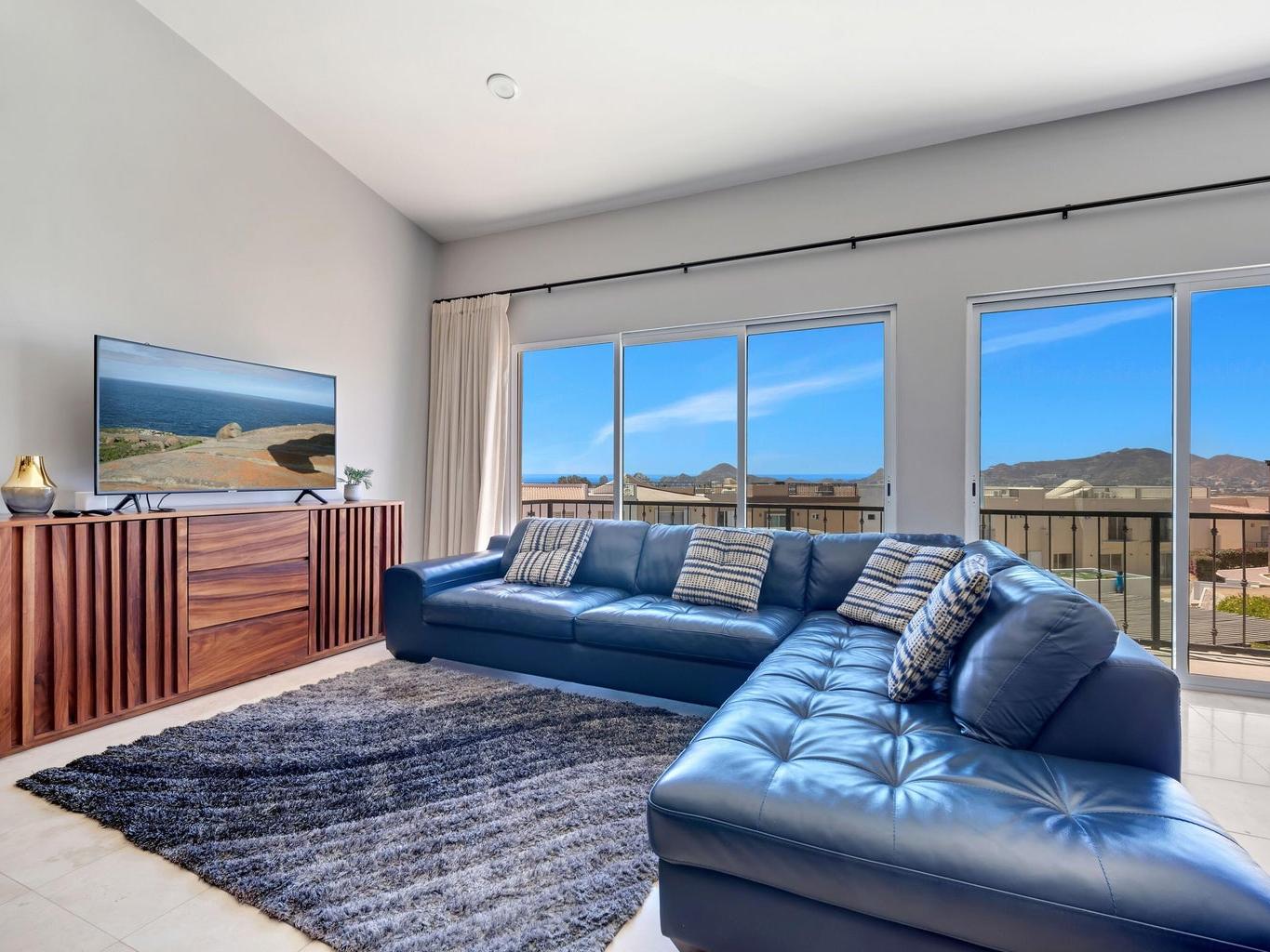 Beautiful modern home in Villas del Tezal phase 2. Inside the home you will find a very large fully equipped Kitchen. The open floor plan leads to the living and dining room areas offering unobstructed lands end, ocean and city views. A large terrace is located off the back of the home on top of the covered parking, This large area is equipped with outdoor furniture, decor and BBQ. This area can be easily converted to a large 4th bedroom or master suite on the 2nd level. A half bath is also located on this floor. Heading up the stairs to the rooftop there is a large entertaining area with Jacuzzi and outdoor furniture to enjoy a panoramic view of all Cabo has to offer.