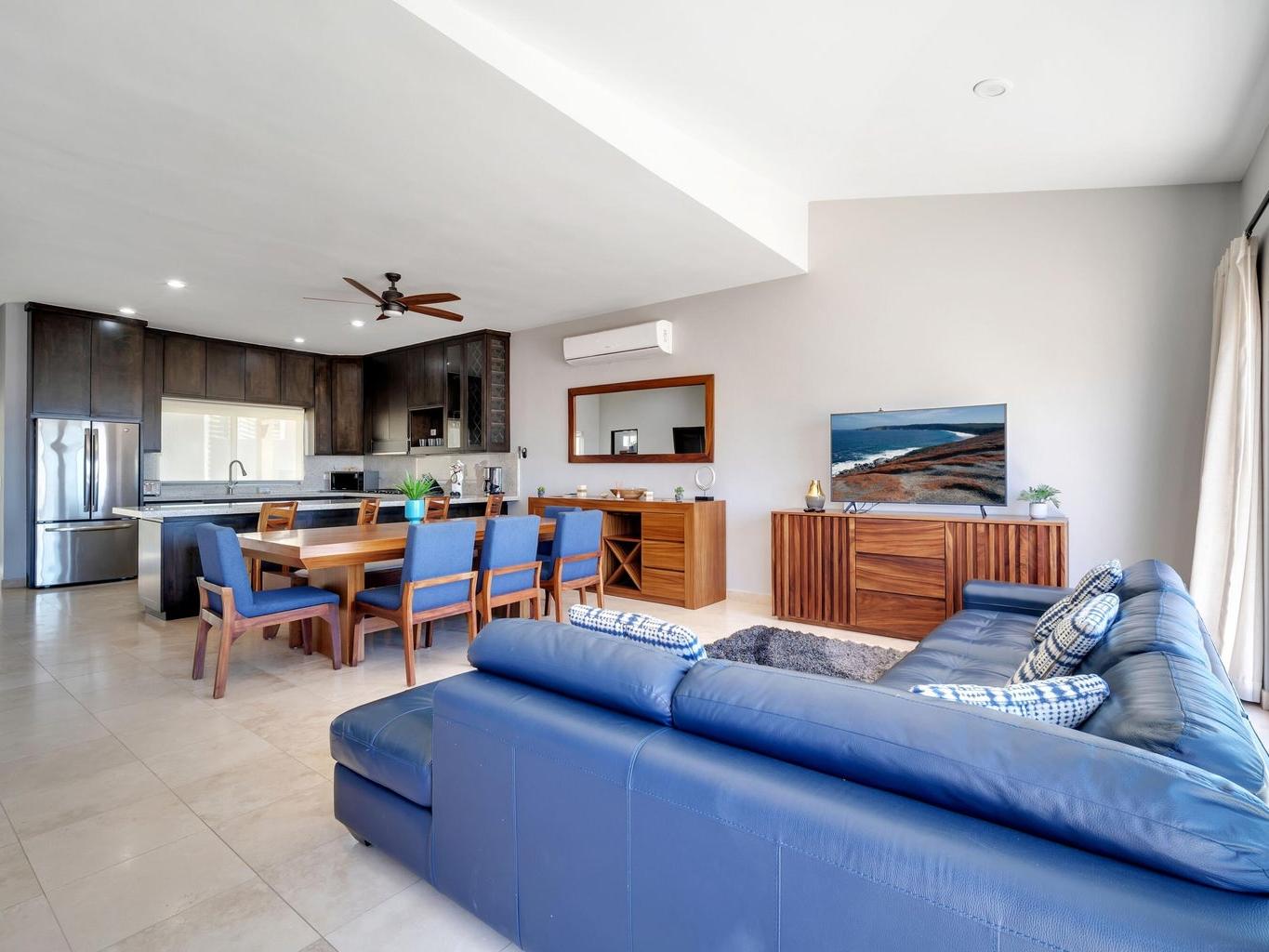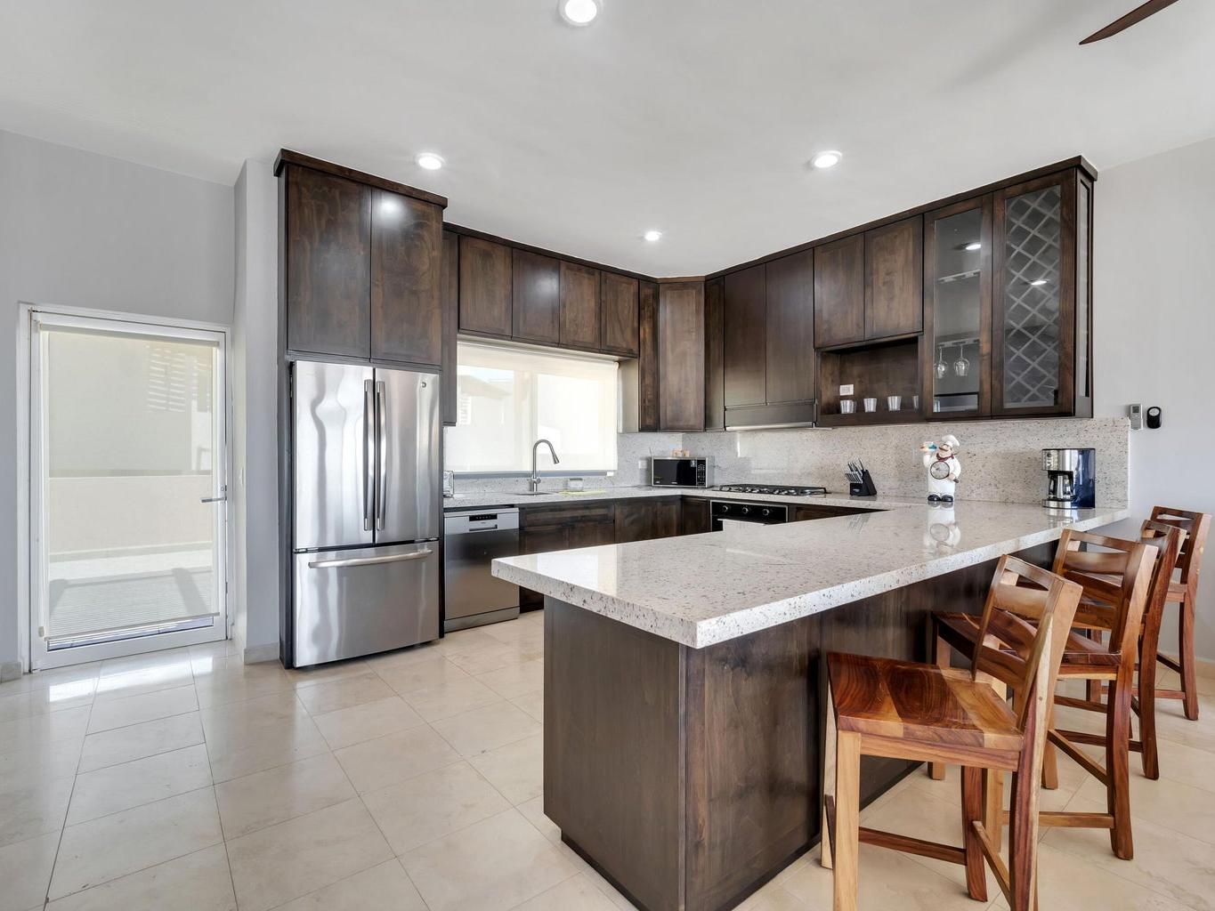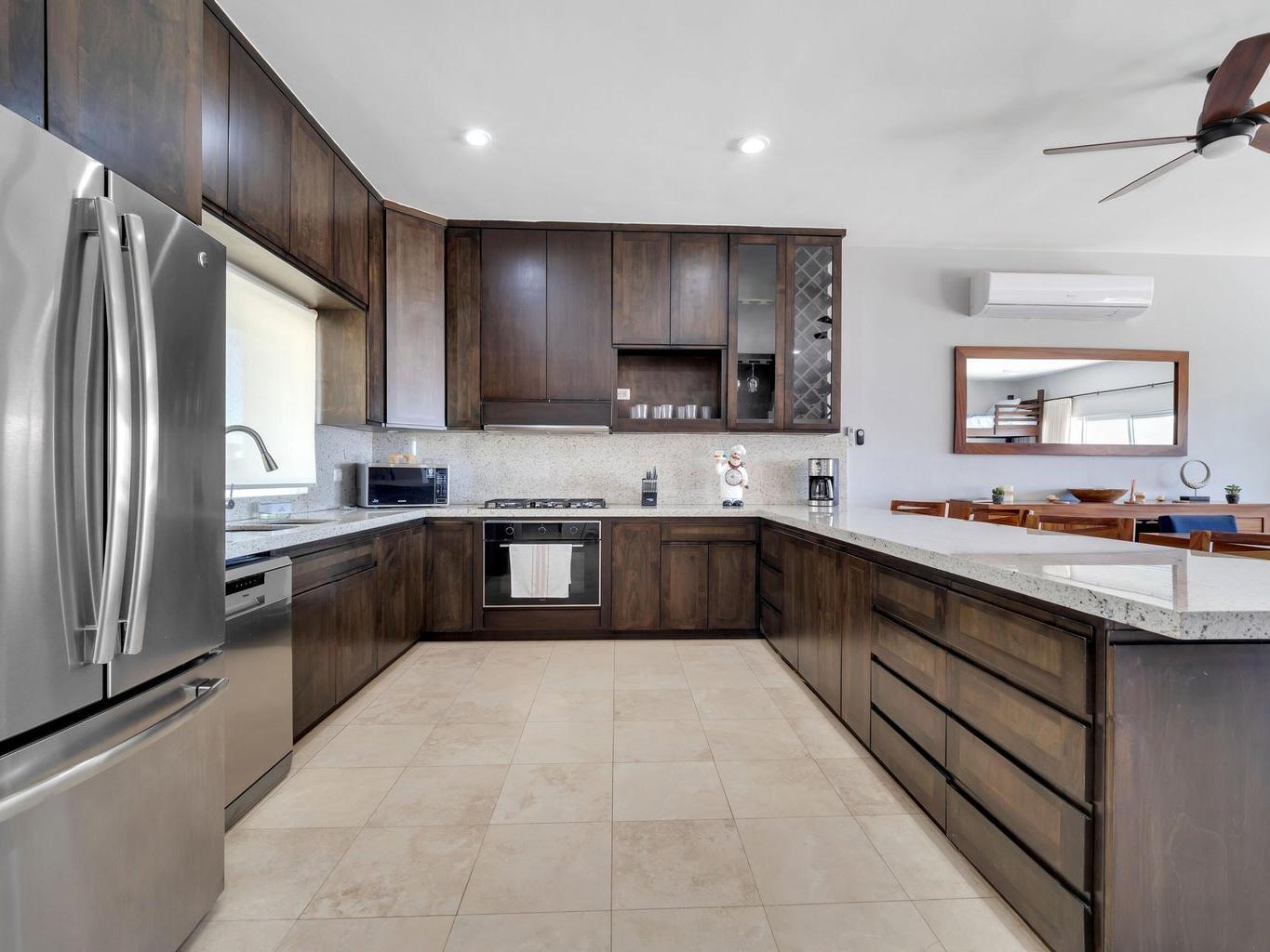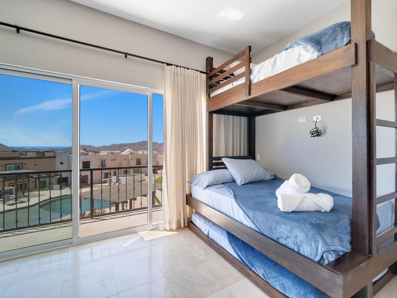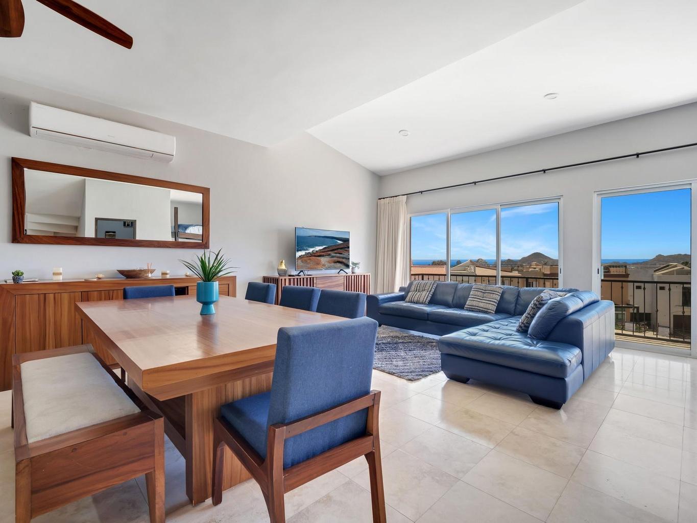 Beautiful modern home in Villas del Tezal phase 2. Inside the home you will find a very large fully equipped Kitchen. The open floor plan leads to the living and dining room areas offering unobstructed lands end, ocean and city views. A large terrace is located off the back of the home on top of the covered parking, This large area is equipped with outdoor furniture, decor and BBQ. This area can be easily converted to a large 4th bedroom or master suite on the 2nd level. A half bath is also located on this floor. Heading up the stairs to the rooftop there is a large entertaining area with Jacuzzi and outdoor furniture to enjoy a panoramic view of all Cabo has to offer.