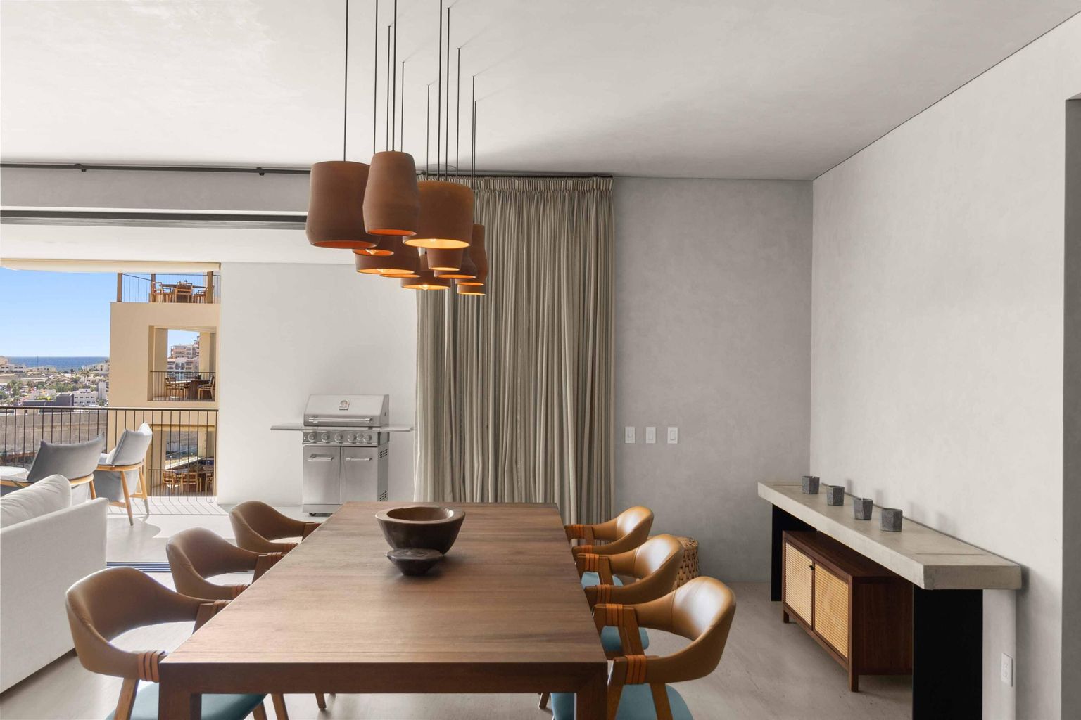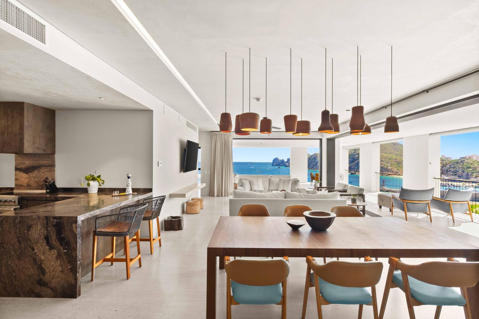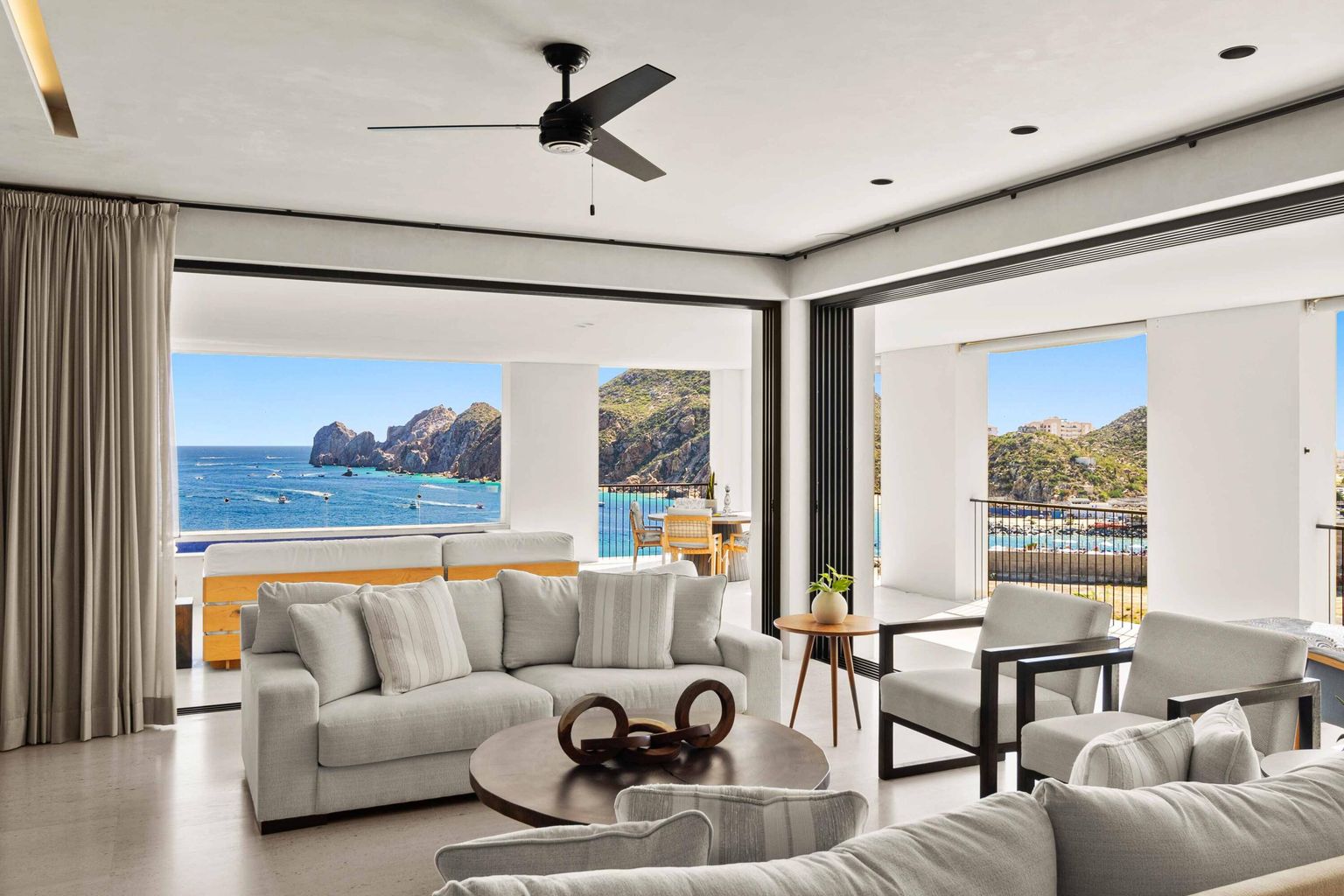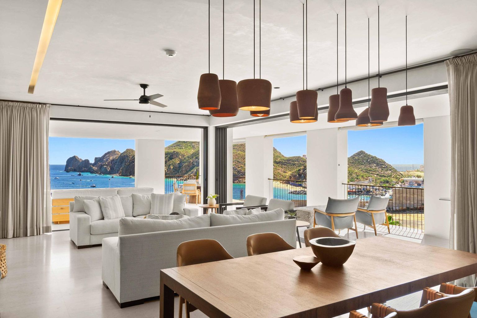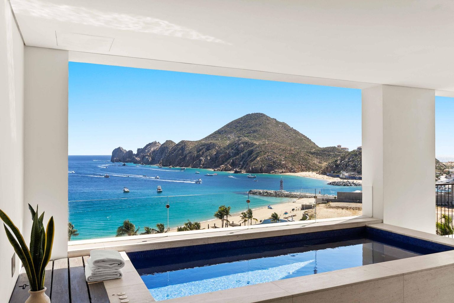 Perched on the 5th floor, this stunning 2-bedroom residence with a den at 1 Homes Cabo offers breathtaking views of Land's End and the sparkling Sea of Cortez. The L-shaped balcony, complete with a private plunge pool, invites you to embrace Cabo's natural beauty. Sliding pocket doors seamlessly connect the indoor and outdoor spaces, filling the home with light and a refreshing coastal breeze. For added privacy, shades have been installed on one side of the terrace.