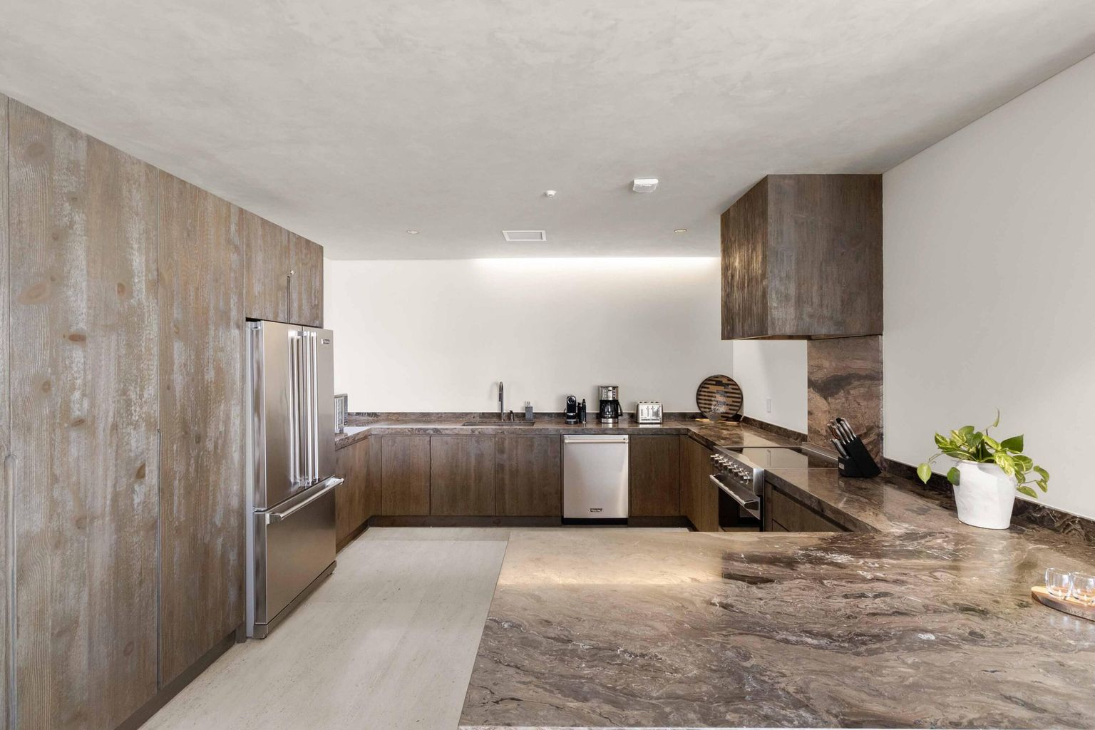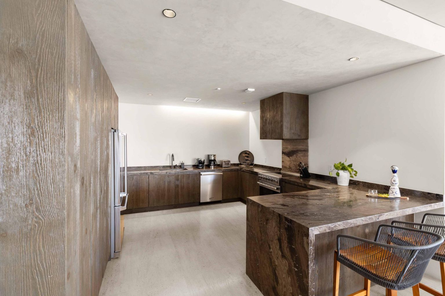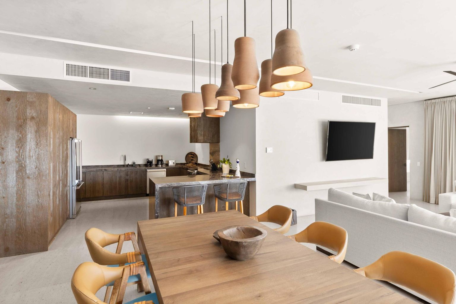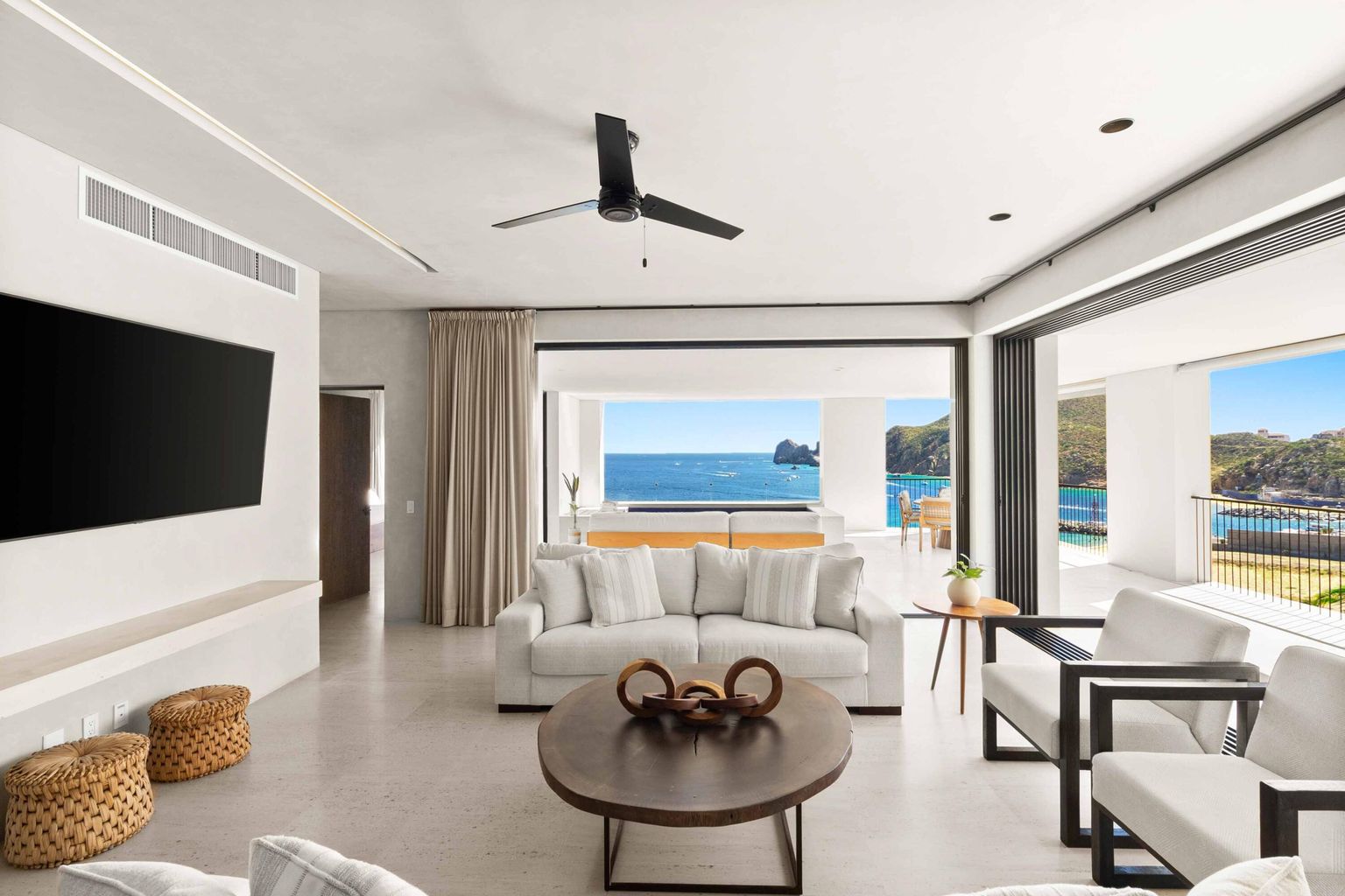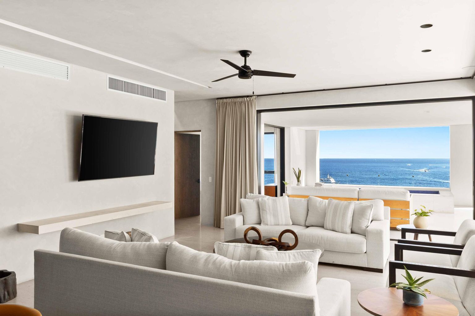 Perched on the 5th floor, this stunning 2-bedroom residence with a den at 1 Homes Cabo offers breathtaking views of Land's End and the sparkling Sea of Cortez. The L-shaped balcony, complete with a private plunge pool, invites you to embrace Cabo's natural beauty. Sliding pocket doors seamlessly connect the indoor and outdoor spaces, filling the home with light and a refreshing coastal breeze. For added privacy, shades have been installed on one side of the terrace.