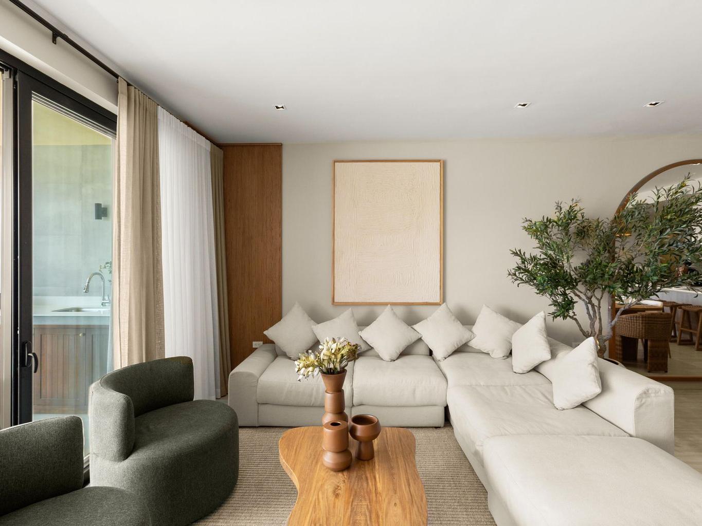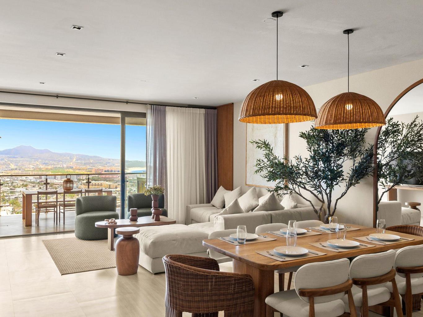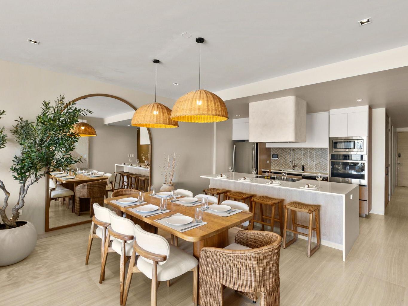 Enjoy sweeping ocean views from this fifth-floor condo with 3 bedrooms and 3.5 bathrooms. The open layout is filled with natural light and styled in a modern bohemian look with clean lines and soft neutral tones. A private terrace hot tub and bbq are perfect for relaxing or entertaining. The kitchen has elegant quartz countertops, and the building features solar panels, filtered drinking water, and A/C with air purification. Amenities include a heated pool, jacuzzi, sauna, gym, clubhouse, courts, beach access, farmers market, and K-12 school.