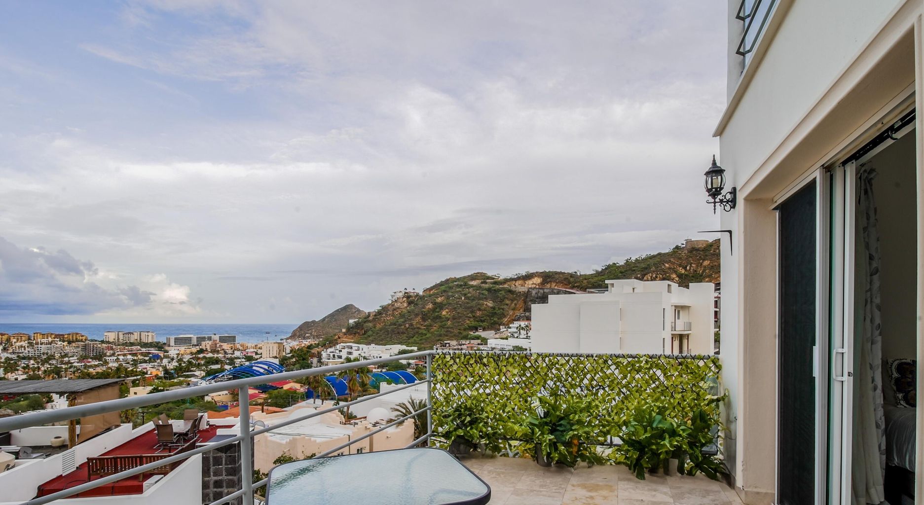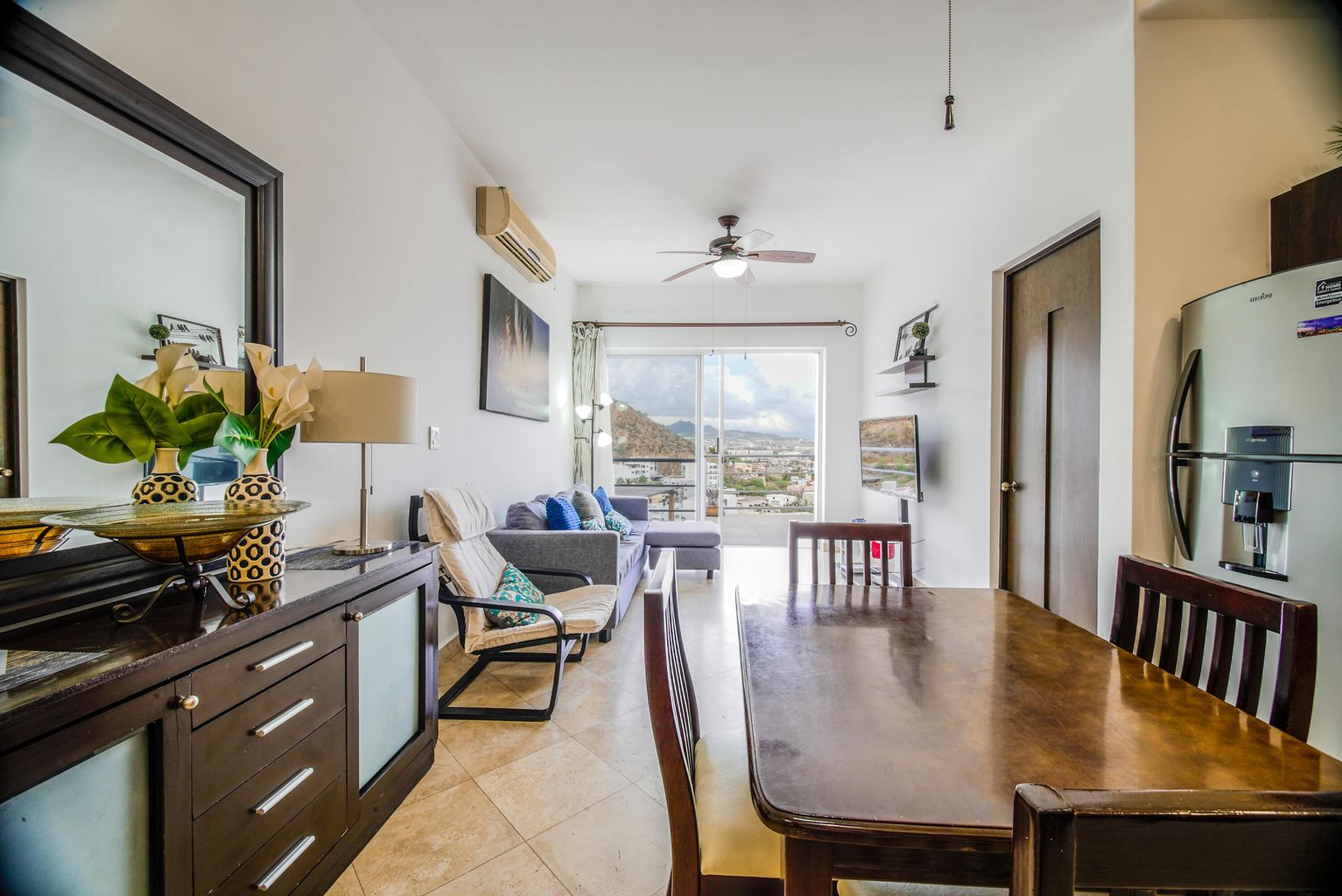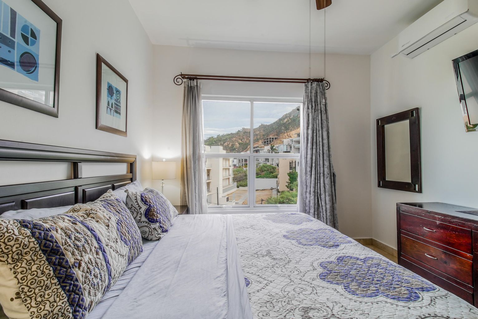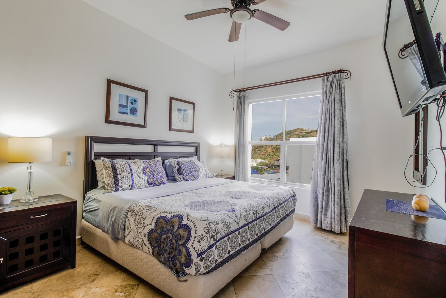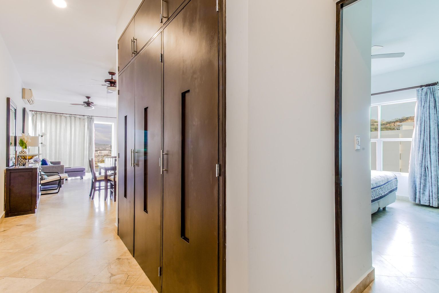 Priced to sell fast!!! Oceanview two bedroom two bathroom condo at San Charbel Cabo San Lucas. The condo is located on the second floor of the complex southern building, giving great panoramic ocean and city views from both bedrooms and from the ample terrace. The condo has beautiful marble floors throughout the condo, wooden cabinets, closets and doors, AC mini splits and fans in each room. Primary bedroom with direct access to terrace, king size bed, tv, enclosed bathroom with closet and marble tiles finishes; the spacious living/kitchen area with access to terrace through sliding window doors, living with tv and couch, the L shape kitchen is equipped with granite countertops, marble splash tiles, 4 seat dine table, buffet with mirror plus, fridge, range, hood, microwave, ...