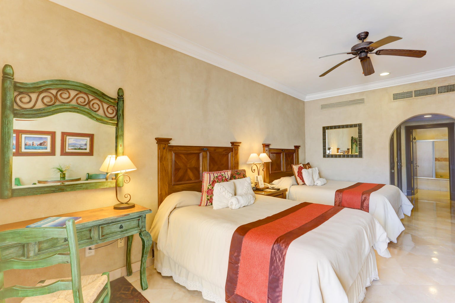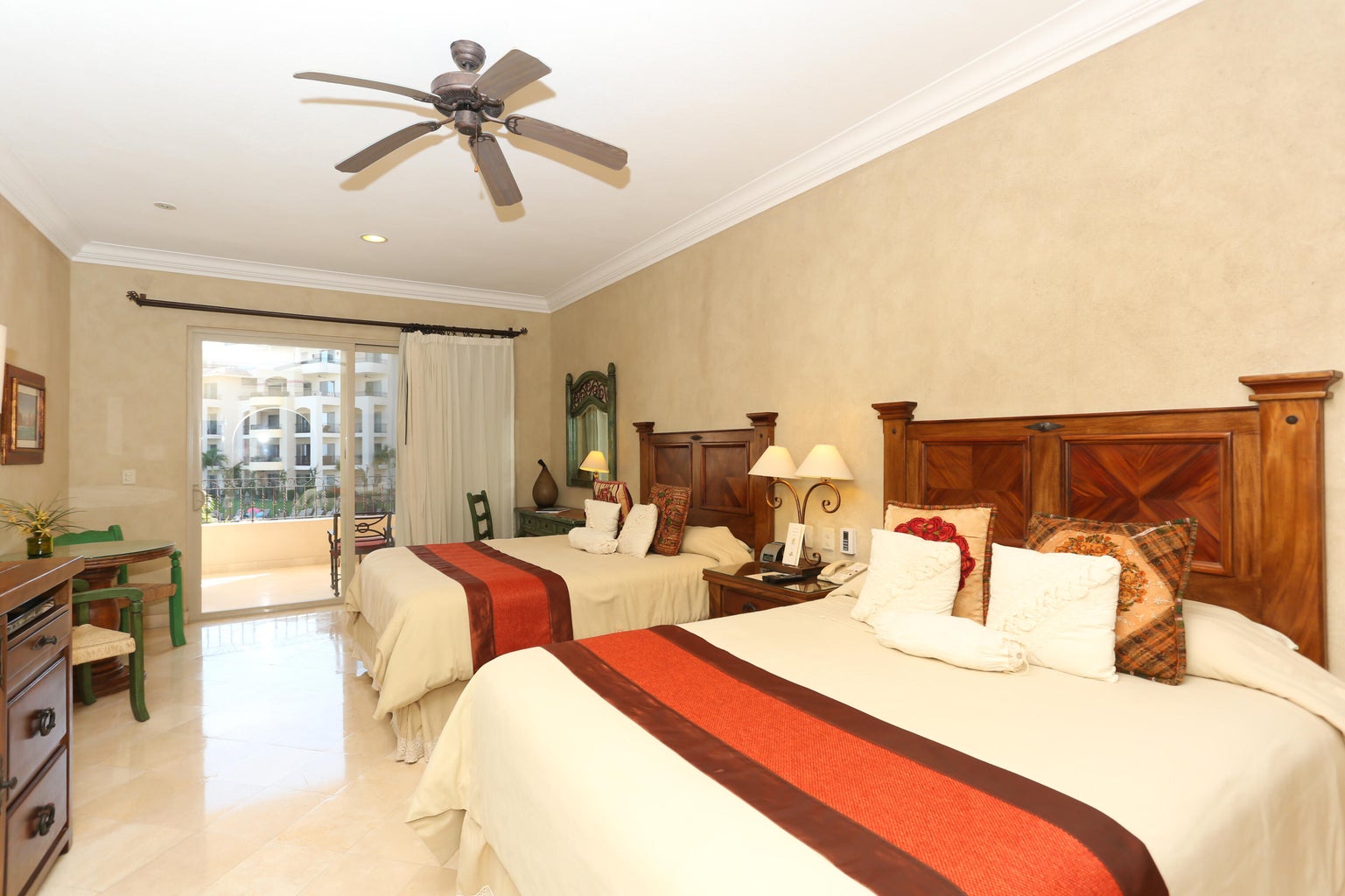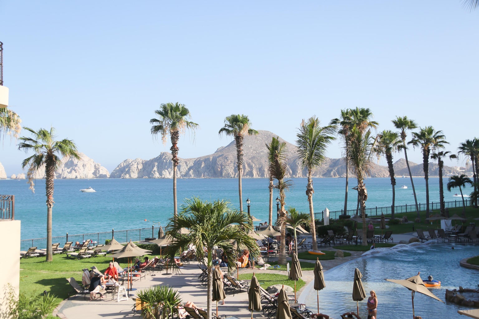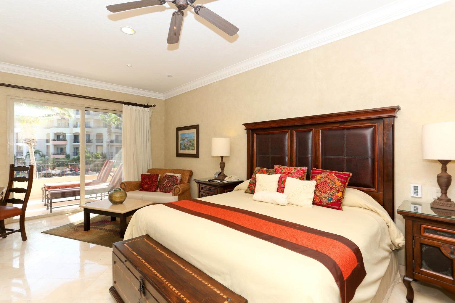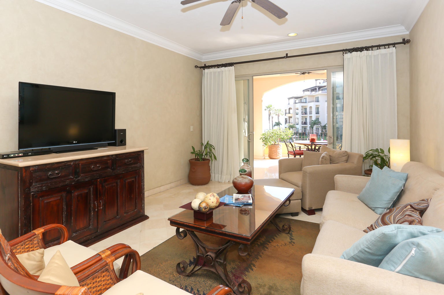 Located in Cabo San Lucas, this two-bedroom, three-bathroom oceanfront condominium is part of the Villa La Estancia resort. Villa 1202 is situated on the second floor of the first phase of the second building, offering 1,678.56 square feet of living space and a 484.20 square foot terrace. The terrace provides views of the Sea of Cortez and Land's End.