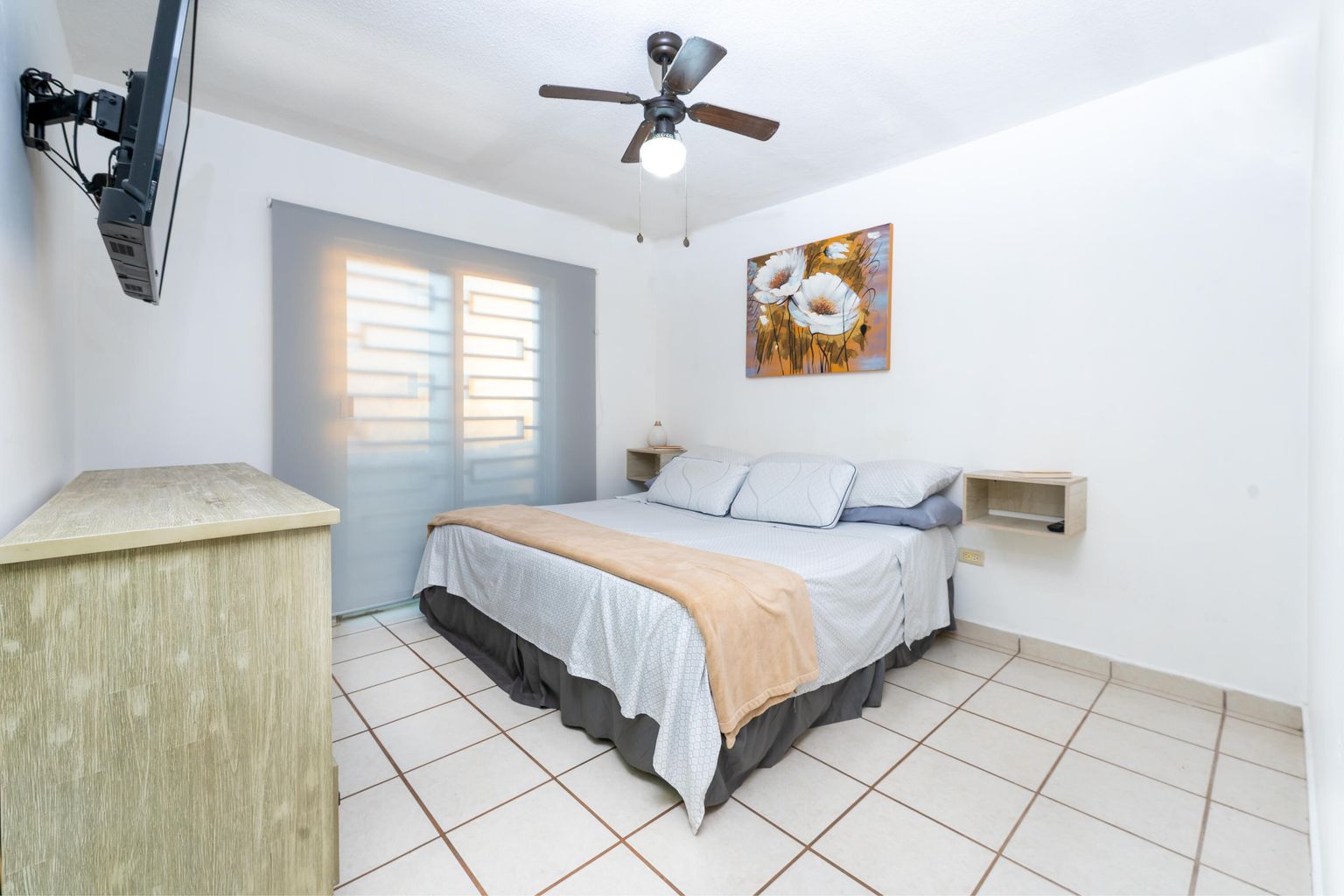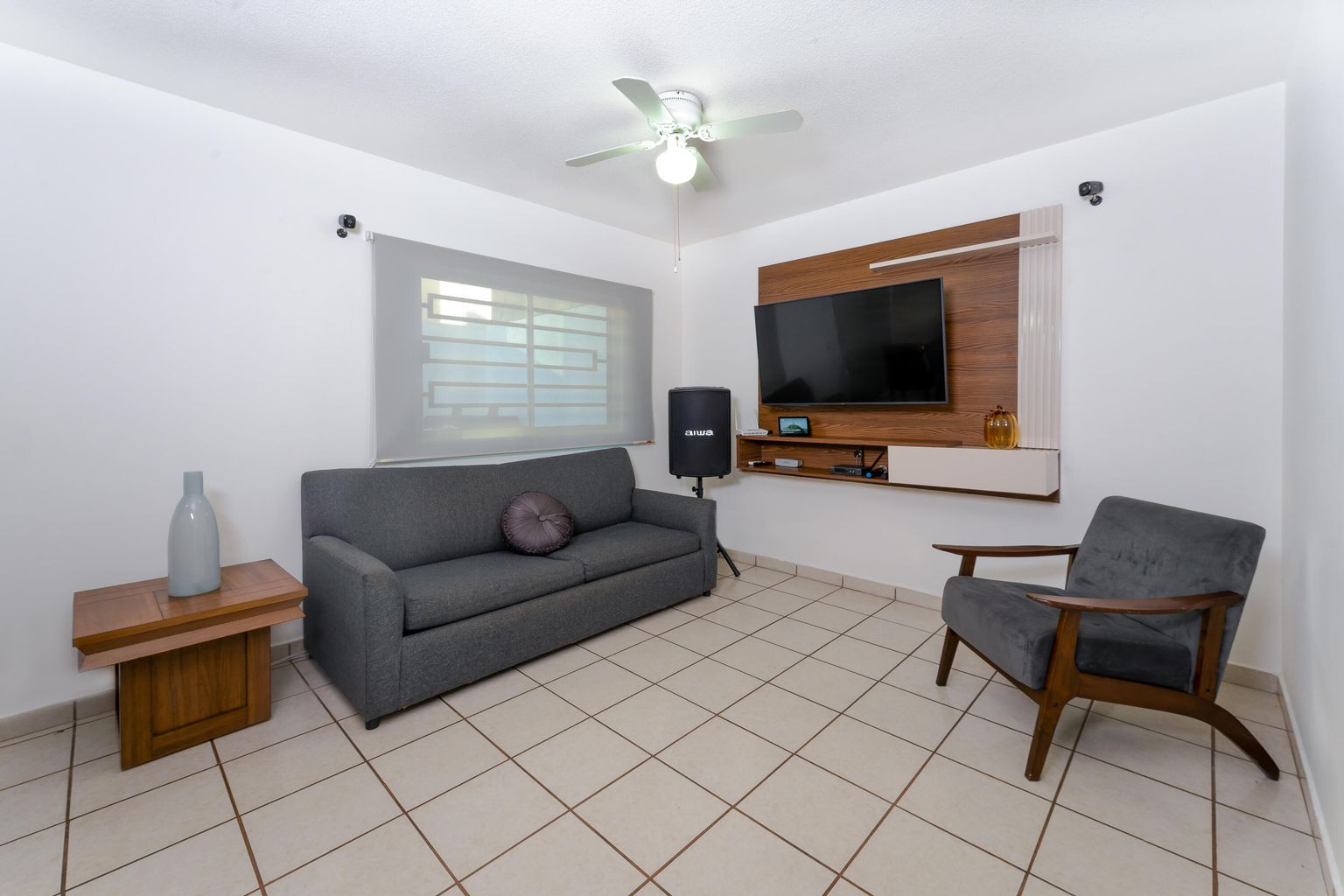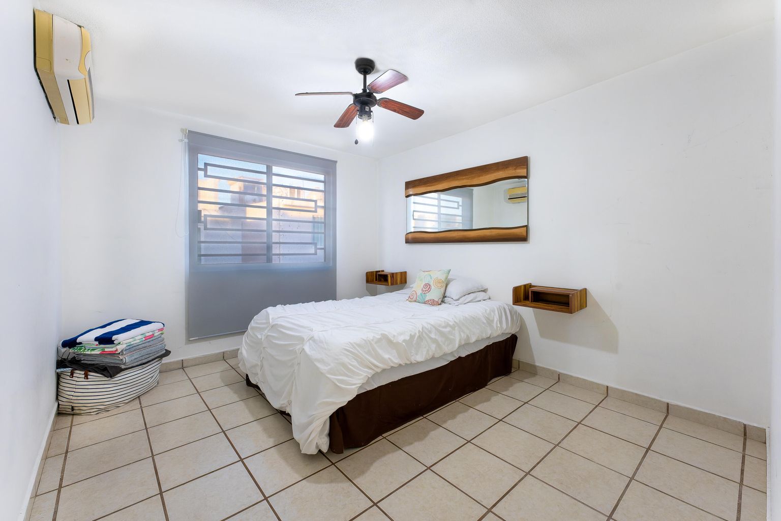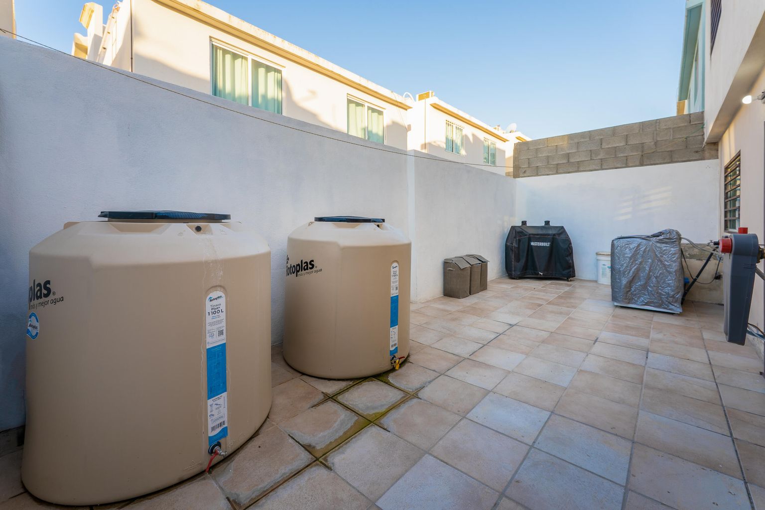 3 bedrooms, 2 full bathrooms, one half bathroom, a 5,000-liter cistern plus 5,300 liters in water tanks, 5 ceiling fans, 4 air conditioning units, a stationary gas tank, and a water heater.