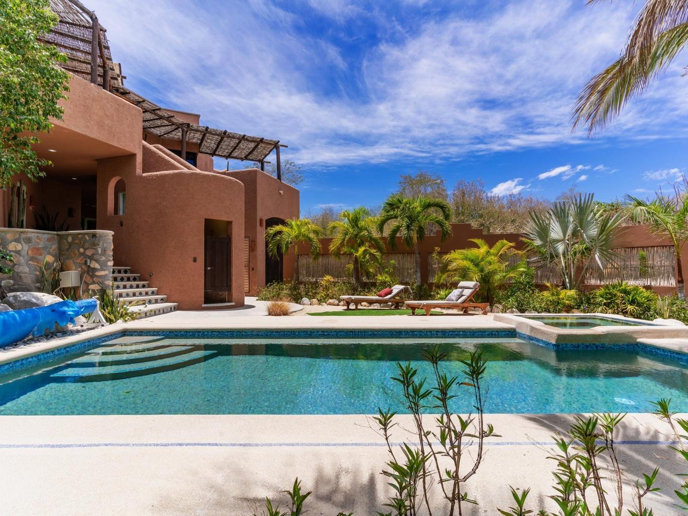Casa Silverado is located in the Popular Palo Blanco neighbourhood. Five minutes to Los Barriles, restaurants and amazing beaches. The main floor offers one level living. The kitchen includes a gas range and large pantry. Master bedroom with ensuite bath has access to the covered patio area. Outdoor deck wraps around the living area with dining and sitting areas. Steps lead to a roof deck with ocean, mountain views and new pergola. Downstairs are two bedrooms with shared full bath. There is a huge covered patio area with water feature. The beautifully landscaped yard includes a heated pool and hot tub with privacy feature wall. A one car garage, half bath and laundry room complete this home. This home needs nothing, it is complete and ready for you