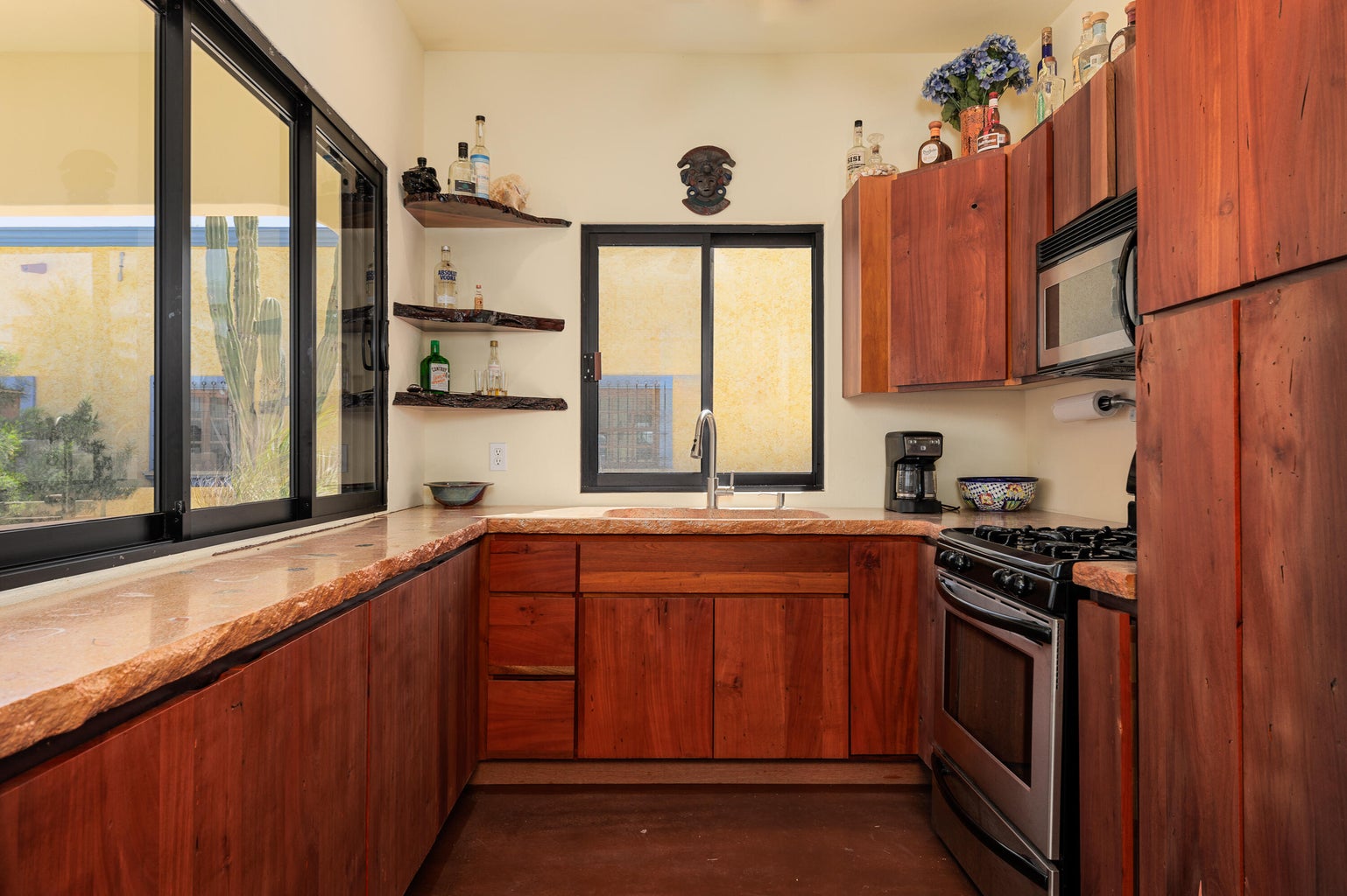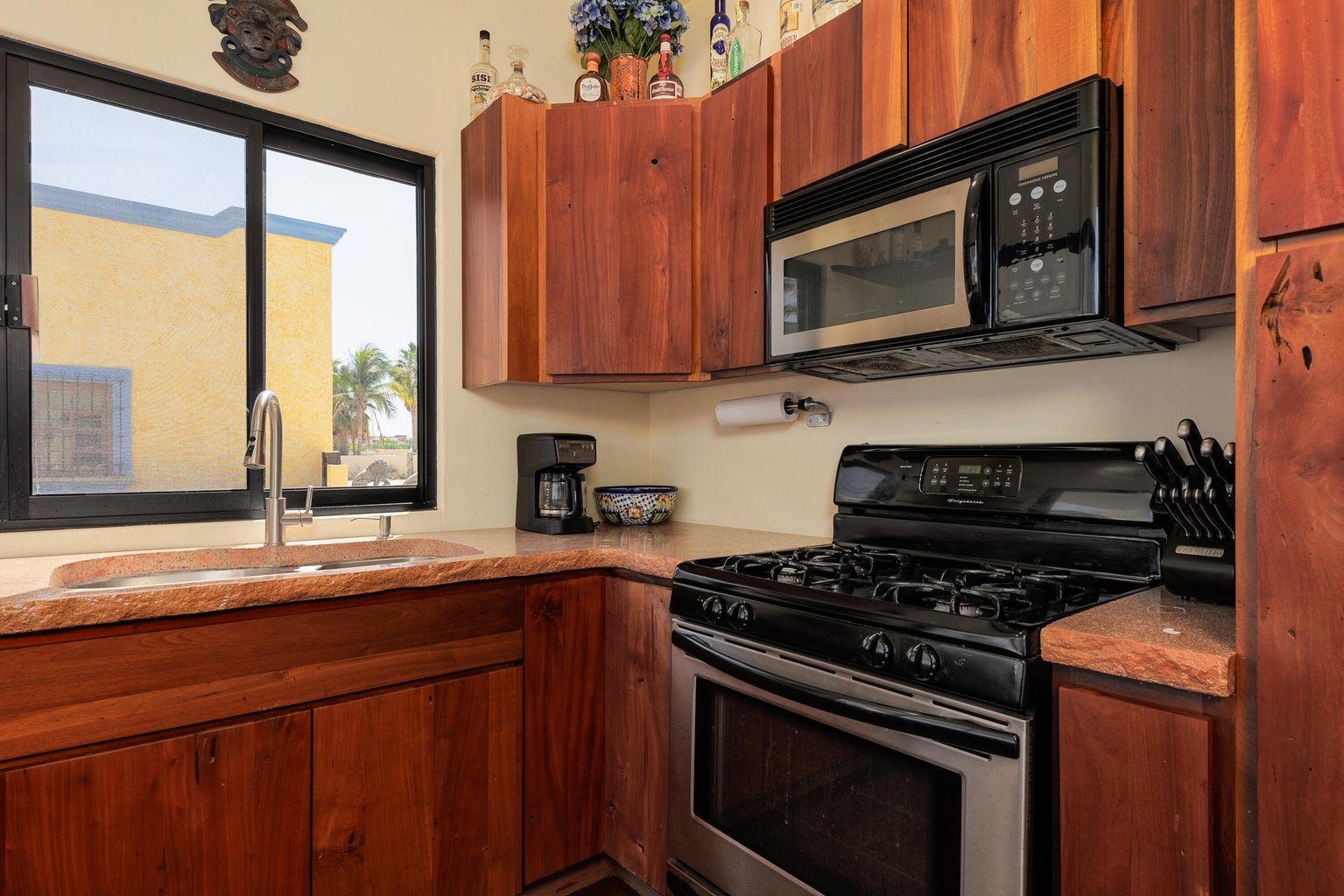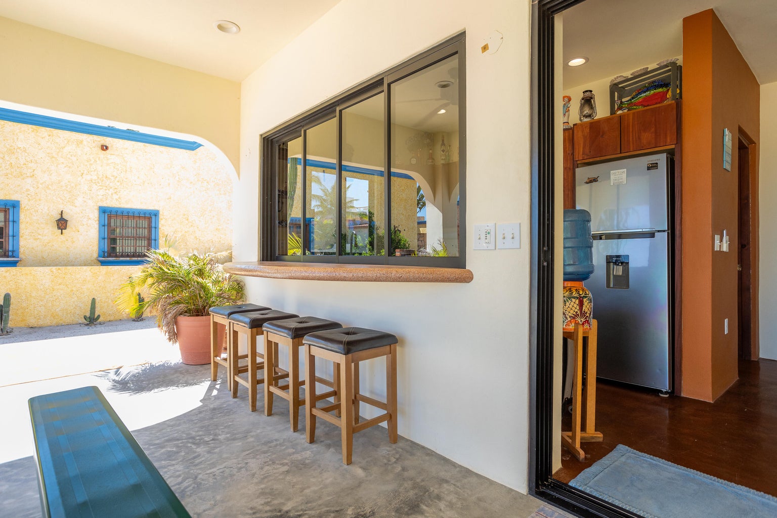 This bungalow is a one bedroom one bathroom, kitchen, living room. 2 car garage, beautiful outdoor seating area facing the Sea of Cortez.