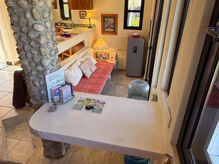 The main house features one bedroom and one bath, designed for relaxed indoor-outdoor living. A separate guest suite with its own private entrance offers added privacy—ideal for visitors or an office. The beautifully landscaped grounds are filled with lush native plants, inviting shaded patios, and traditional palapas, all enhancing the peaceful atmosphere.
