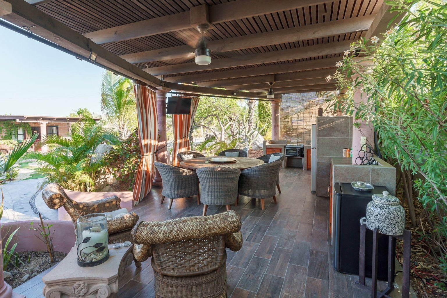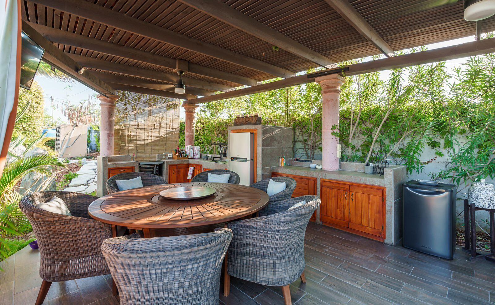 The enchanting outdoor kitchen, thoughtfully designed for culinary enthusiasts. Surrounded by lush greenery, vibrant plants, and the soothing sound of ocean breezes, this space is a haven for creating meals while embracing the outdoors.