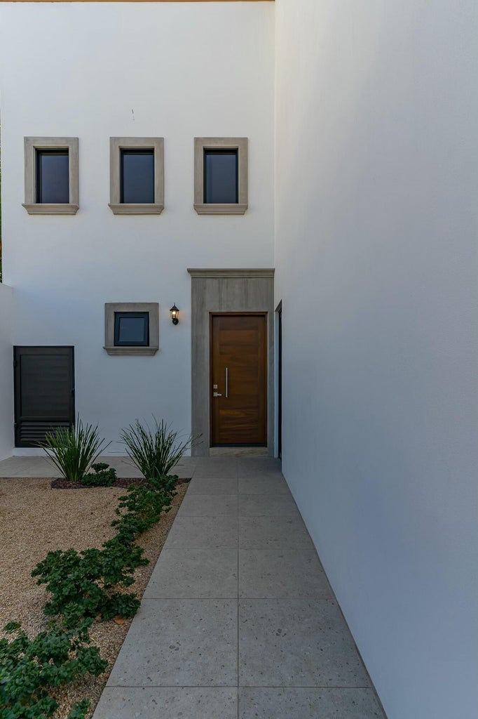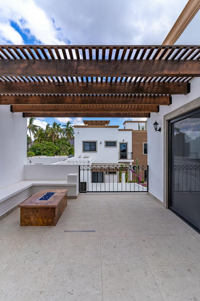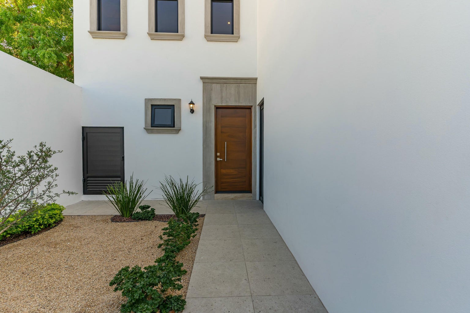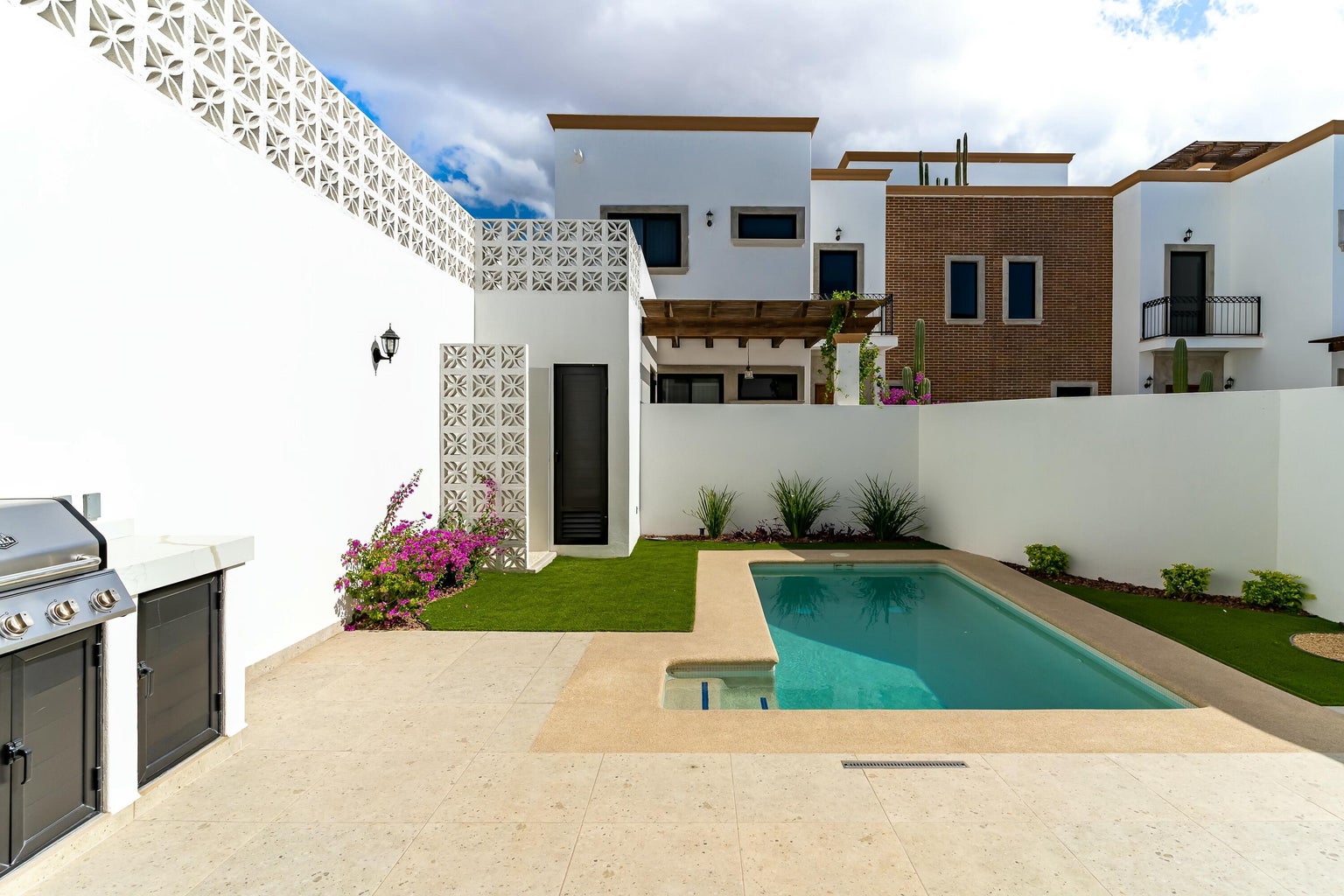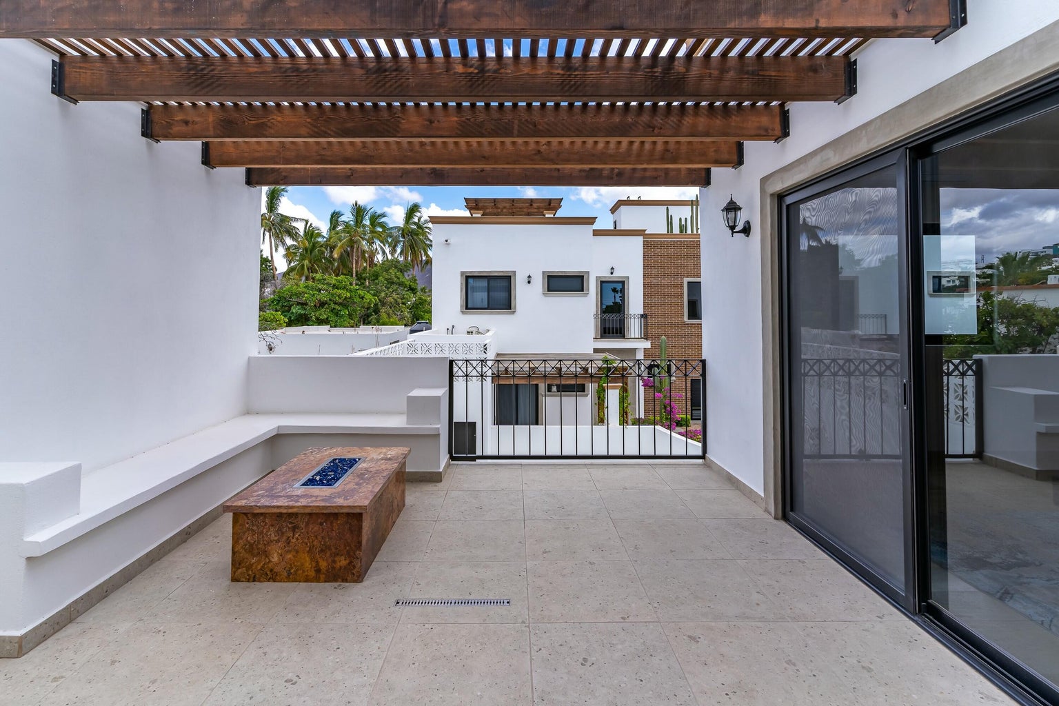 Elegant, newly built two-story home just steps from the La Paz Waterfront boardwalk. Set in the vibrant Esterito area, this residence features three bedroom suites each with its own bathroom and built-in parota closets plus an additional half bathroom. The home showcases modern colonial finishes seamlessly blending with La Paz's unique architecture and entire marble floors thorough the whole the layout features an L-shaped kitchen with an island, pantry, and laundry room, as well as a living and dining area that opens to a patio, pool, outdoor shower, and barbecue area. The first floor hosts a bedroom suite, while the second floor offers a master suite with a walk-in closet, a third bedroom suite, a family area, and an outdoor terrace with a fire pit lounge and leading to roof pergola.