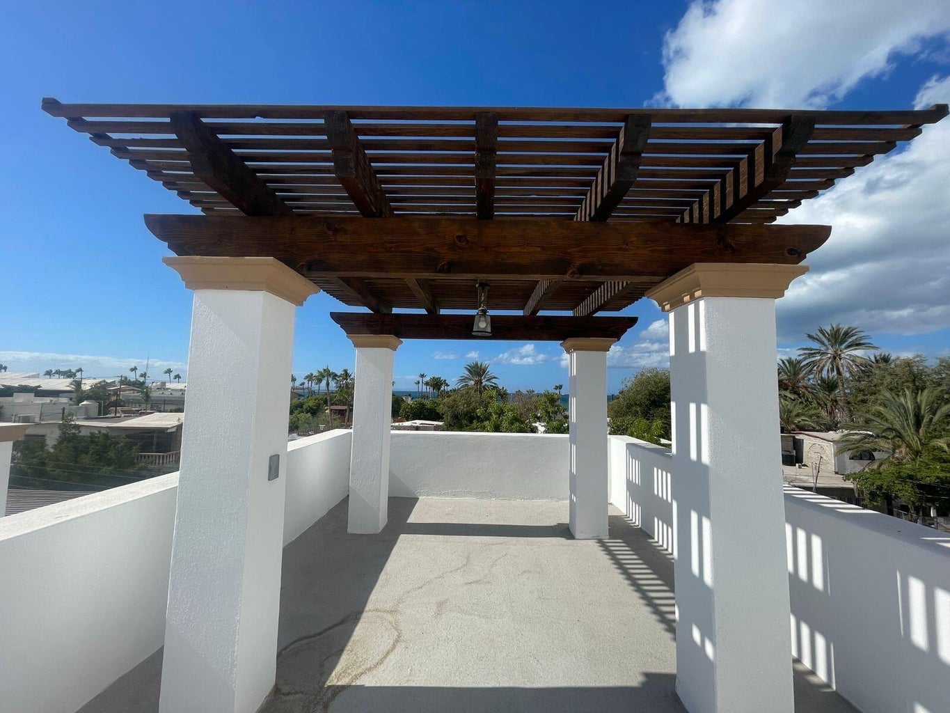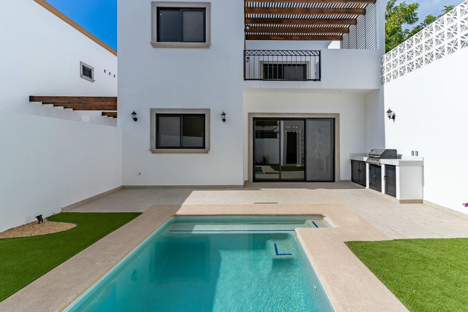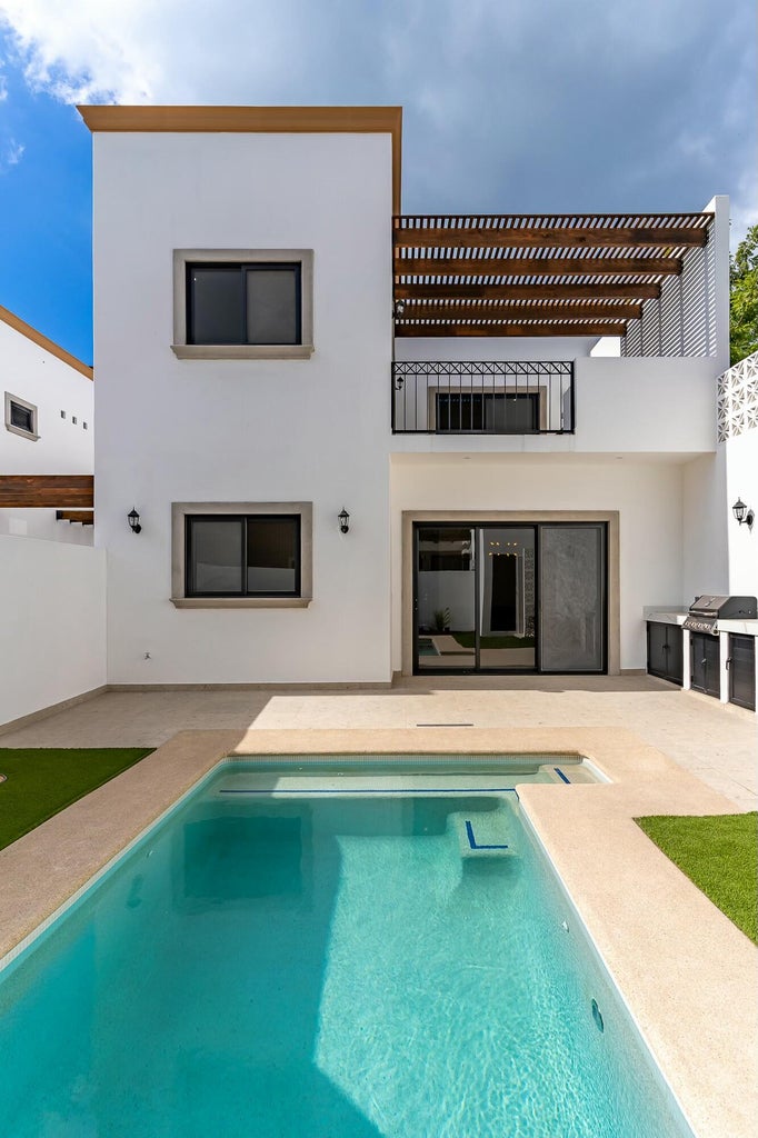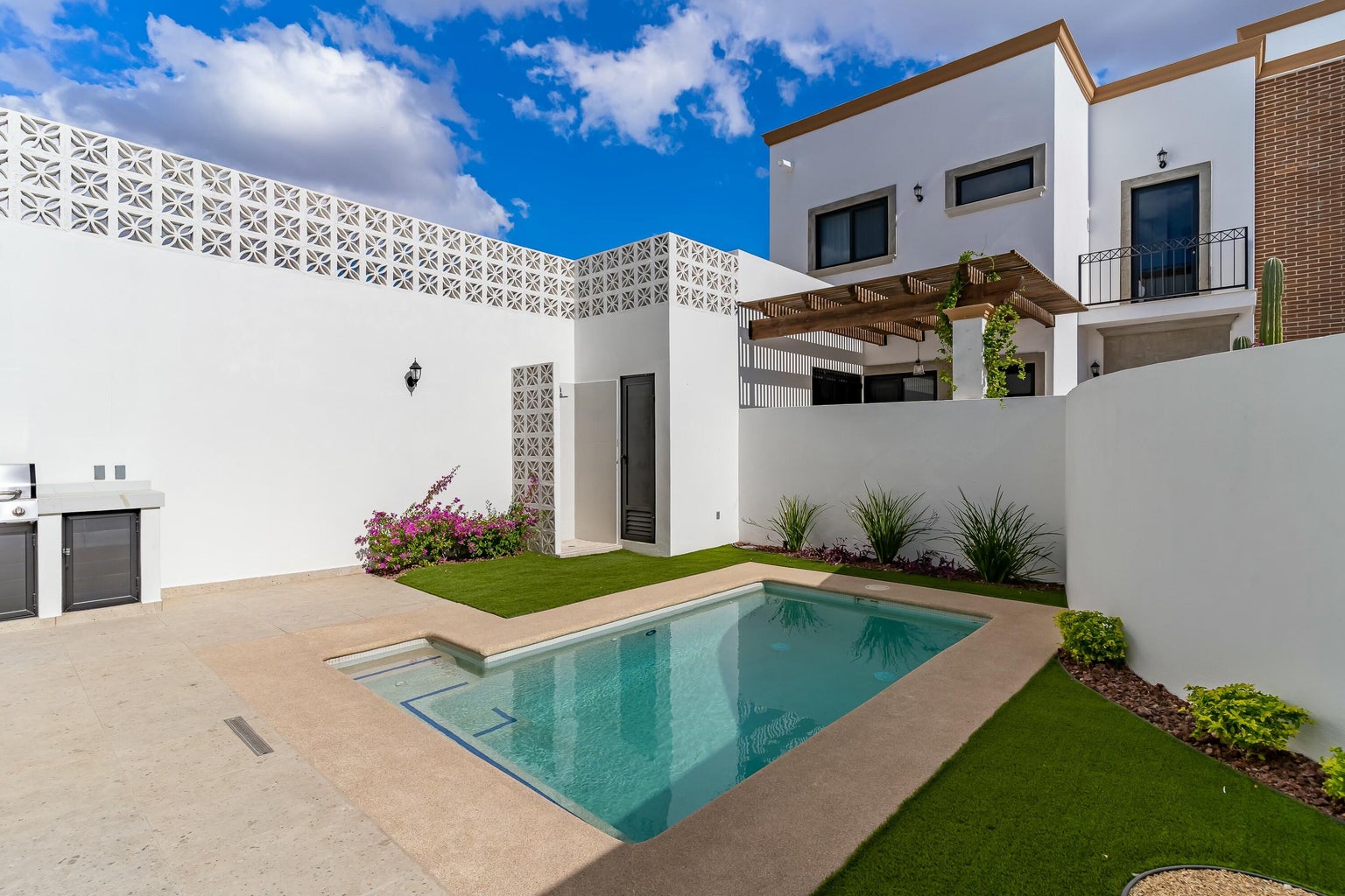 Elegant, newly built two-story home just steps from the La Paz Waterfront boardwalk. Set in the vibrant Esterito area, this residence features three bedroom suites each with its own bathroom and built-in parota closets plus an additional half bathroom. The home showcases modern colonial finishes seamlessly blending with La Paz's unique architecture and entire marble floors thorough the whole the layout features an L-shaped kitchen with an island, pantry, and laundry room, as well as a living and dining area that opens to a patio, pool, outdoor shower, and barbecue area. The first floor hosts a bedroom suite, while the second floor offers a master suite with a walk-in closet, a third bedroom suite, a family area, and an outdoor terrace with a fire pit lounge and leading to roof pergola.