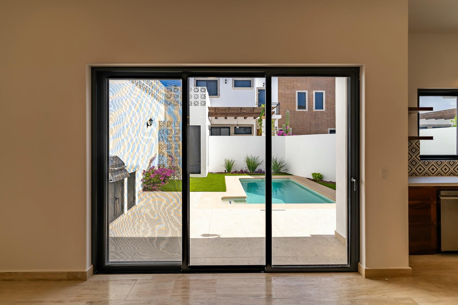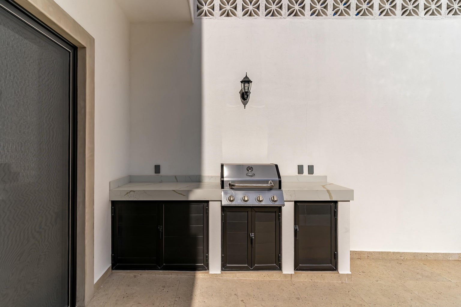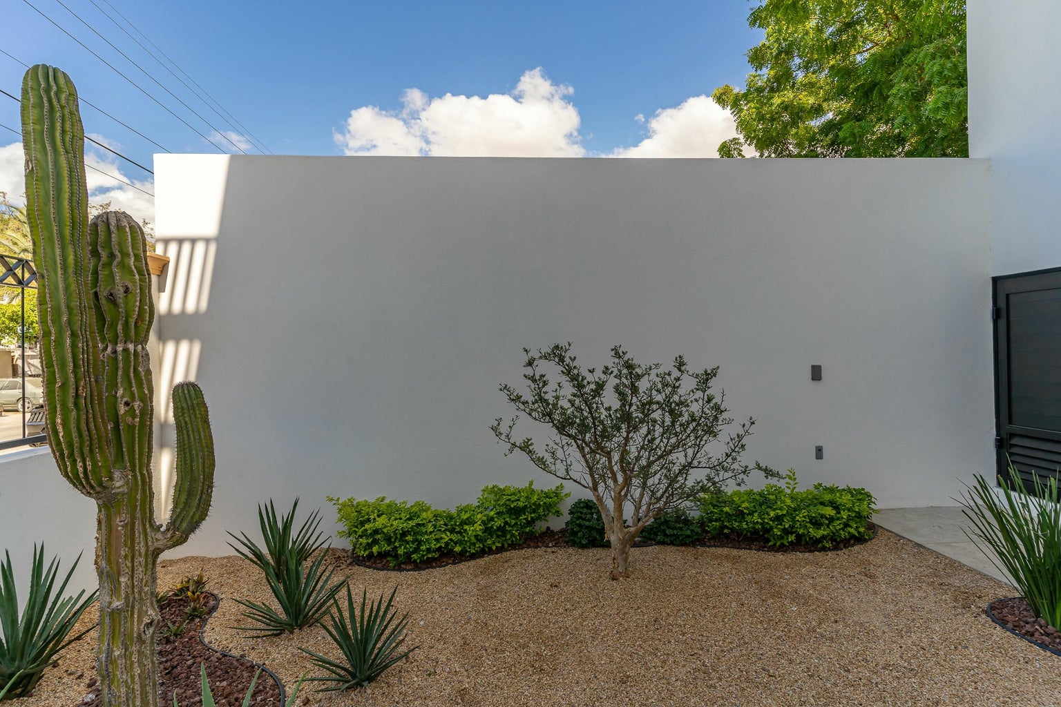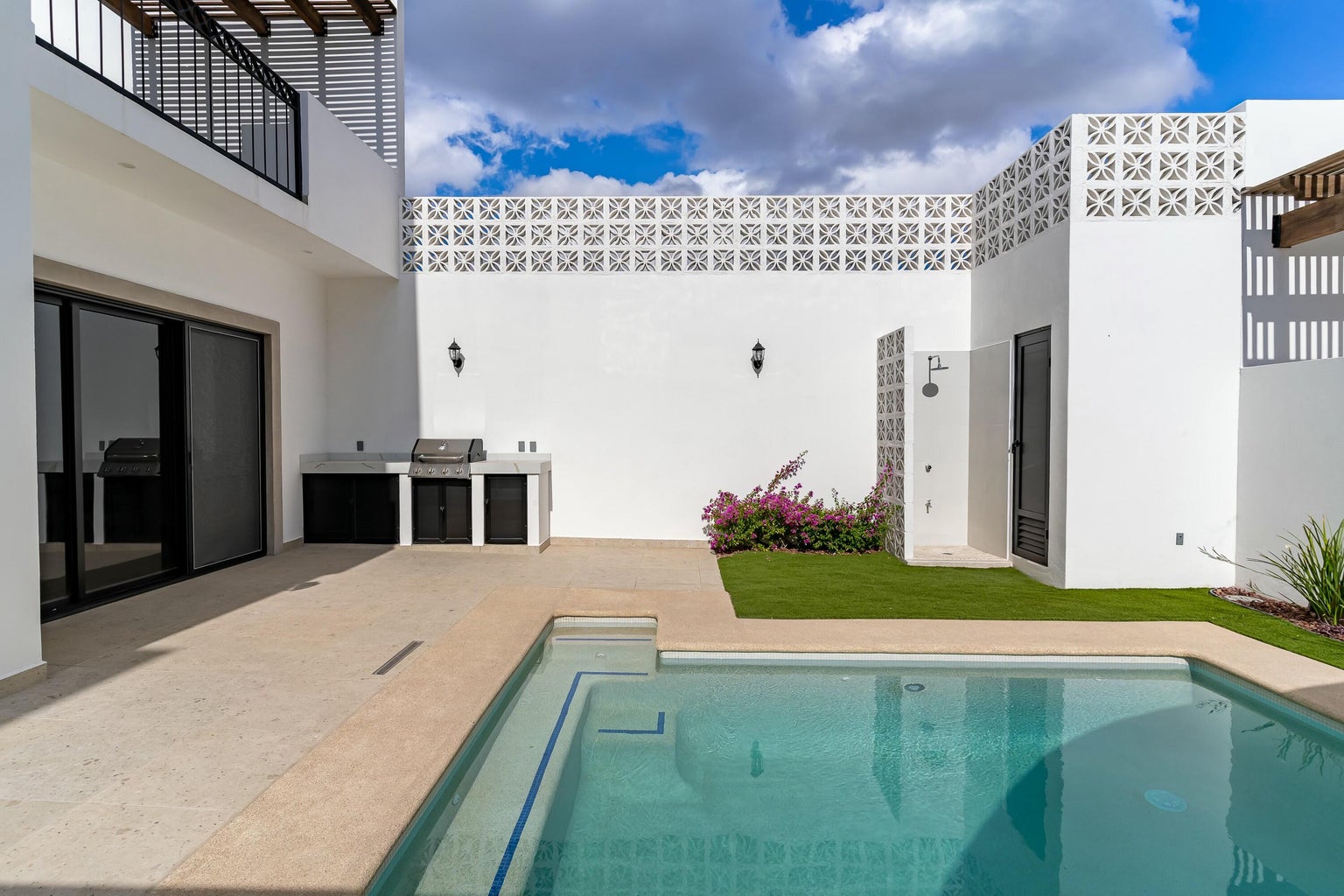 Elegant, newly built two-story home just steps from the La Paz Waterfront boardwalk. Set in the vibrant Esterito area, this residence features three bedroom suites each with its own bathroom and built-in parota closets plus an additional half bathroom. The home showcases modern colonial finishes seamlessly blending with La Paz's unique architecture and entire marble floors thorough the whole the layout features an L-shaped kitchen with an island, pantry, and laundry room, as well as a living and dining area that opens to a patio, pool, outdoor shower, and barbecue area. The first floor hosts a bedroom suite, while the second floor offers a master suite with a walk-in closet, a third bedroom suite, a family area, and an outdoor terrace with a fire pit lounge and leading to roof pergola.