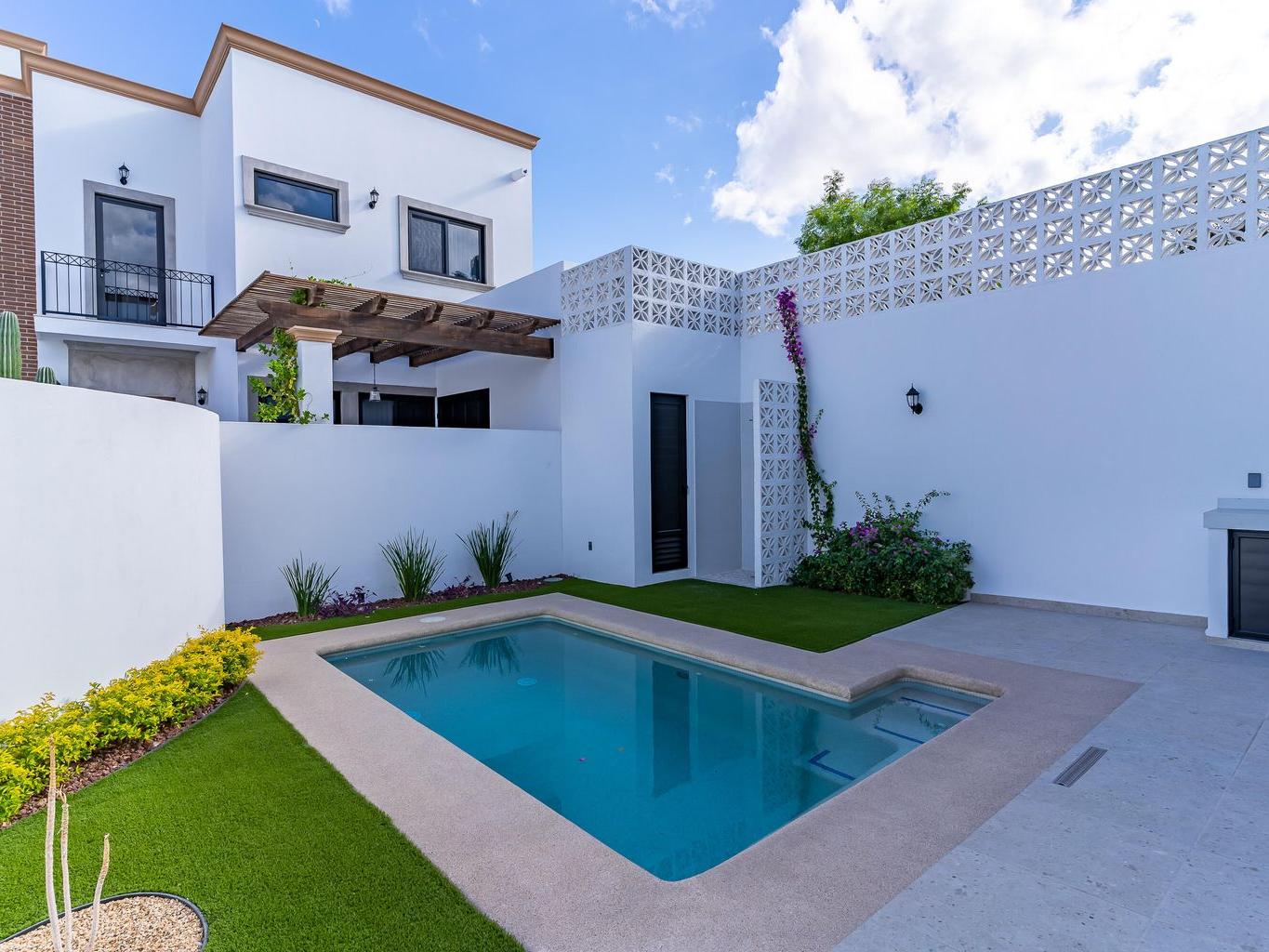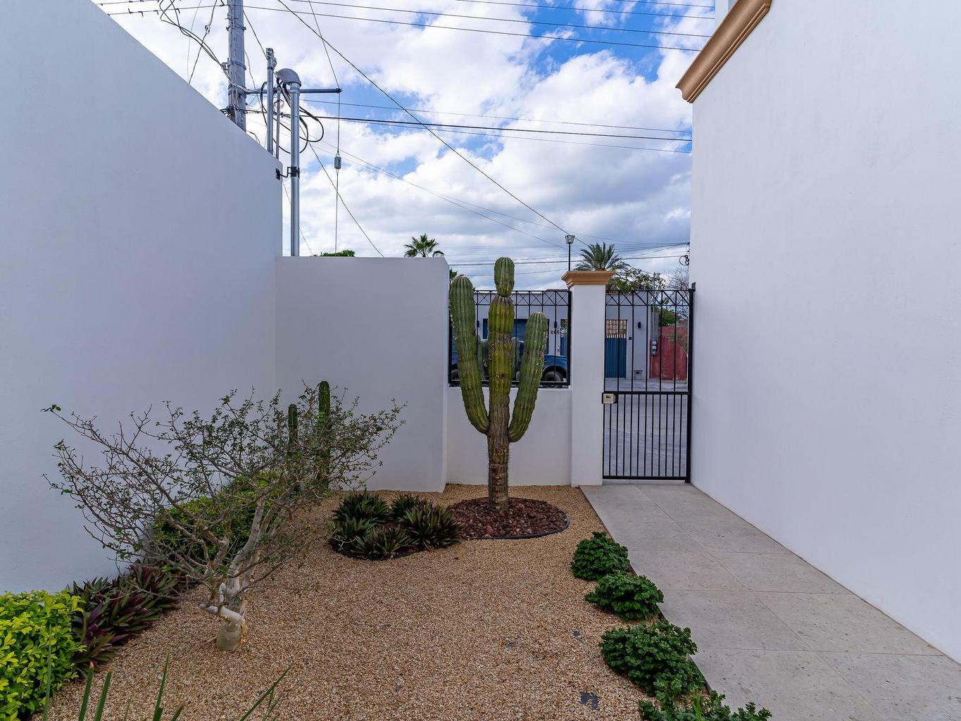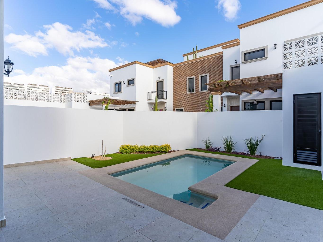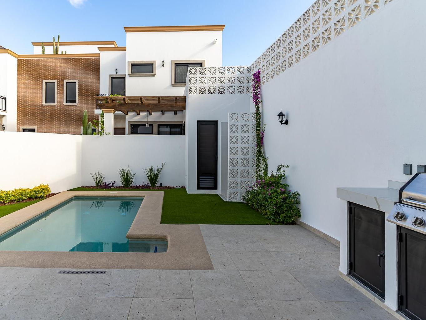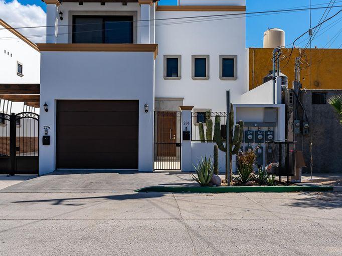 Elegant, newly built two-story home just steps from the La Paz Waterfront boardwalk. Set in the vibrant Esterito area, this residence features three bedroom suites each with its own bathroom and built-in parota closets plus an additional half bathroom. The home showcases modern colonial finishes seamlessly blending with La Paz's unique architecture and entire marble floors thorough the whole the layout features an L-shaped kitchen with an island, pantry, and laundry room, as well as a living and dining area that opens to a patio, pool, outdoor shower, and barbecue area. The first floor hosts a bedroom suite, while the second floor offers a master suite with a walk-in closet, a third bedroom suite, a family area, and an outdoor terrace with a fire pit lounge and leading to roof pergola.