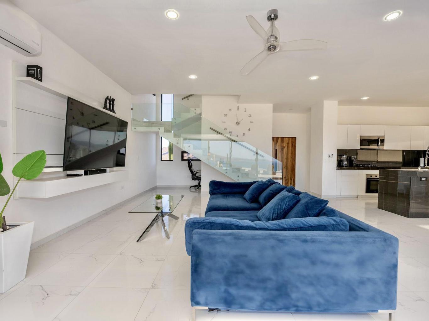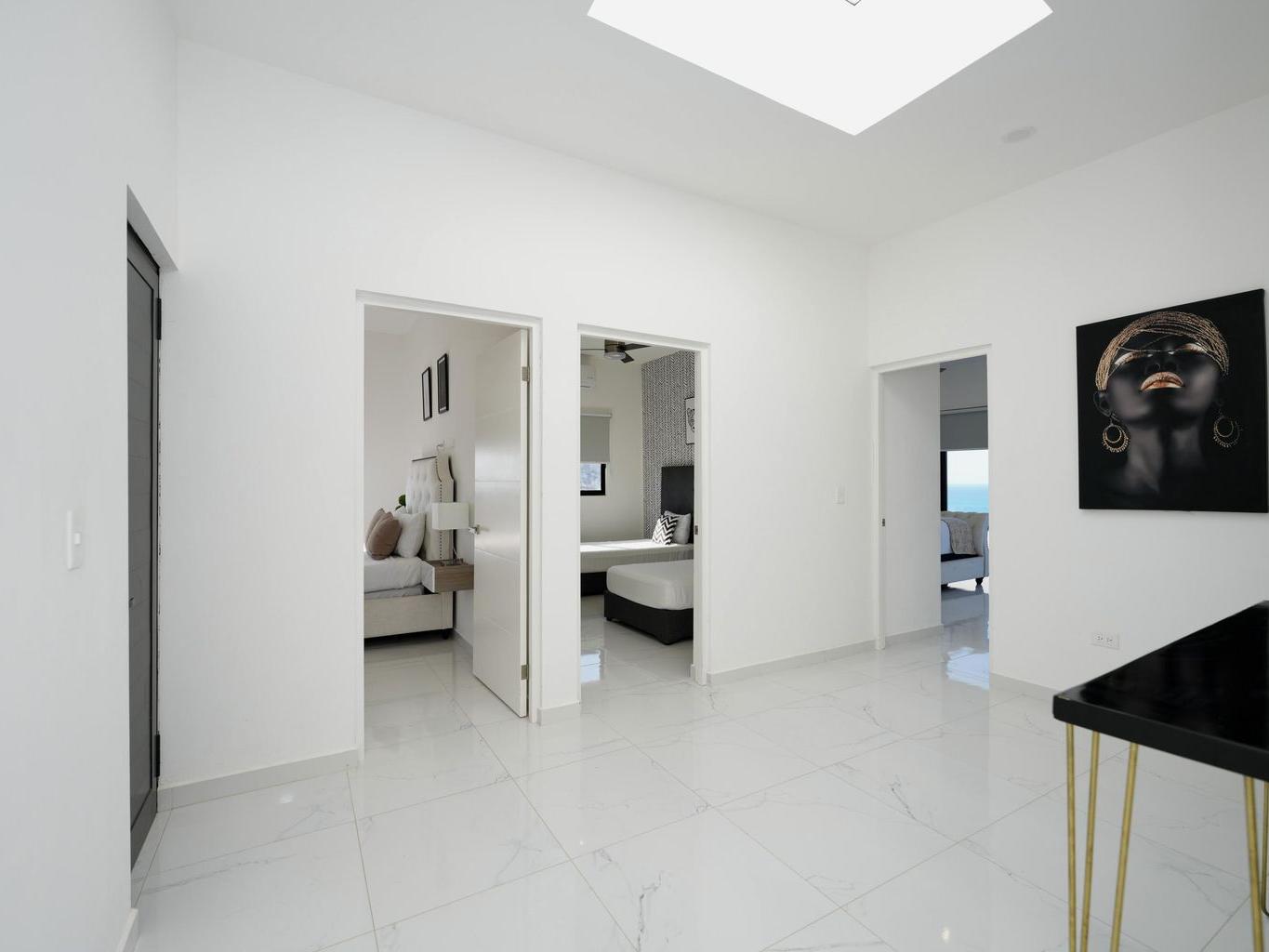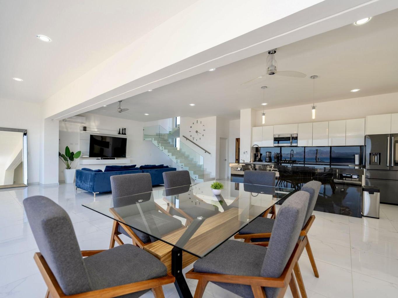The main residence's open-concept design invites you to relax by an infinity pool with an attached fire pit, surrounded by stunning ocean vistas. Two independent studio units, ideal for vacation guests, share a private plunge pool and offer a secluded space for relaxation, while a rooftop jacuzzi crowns the property with panoramic view.