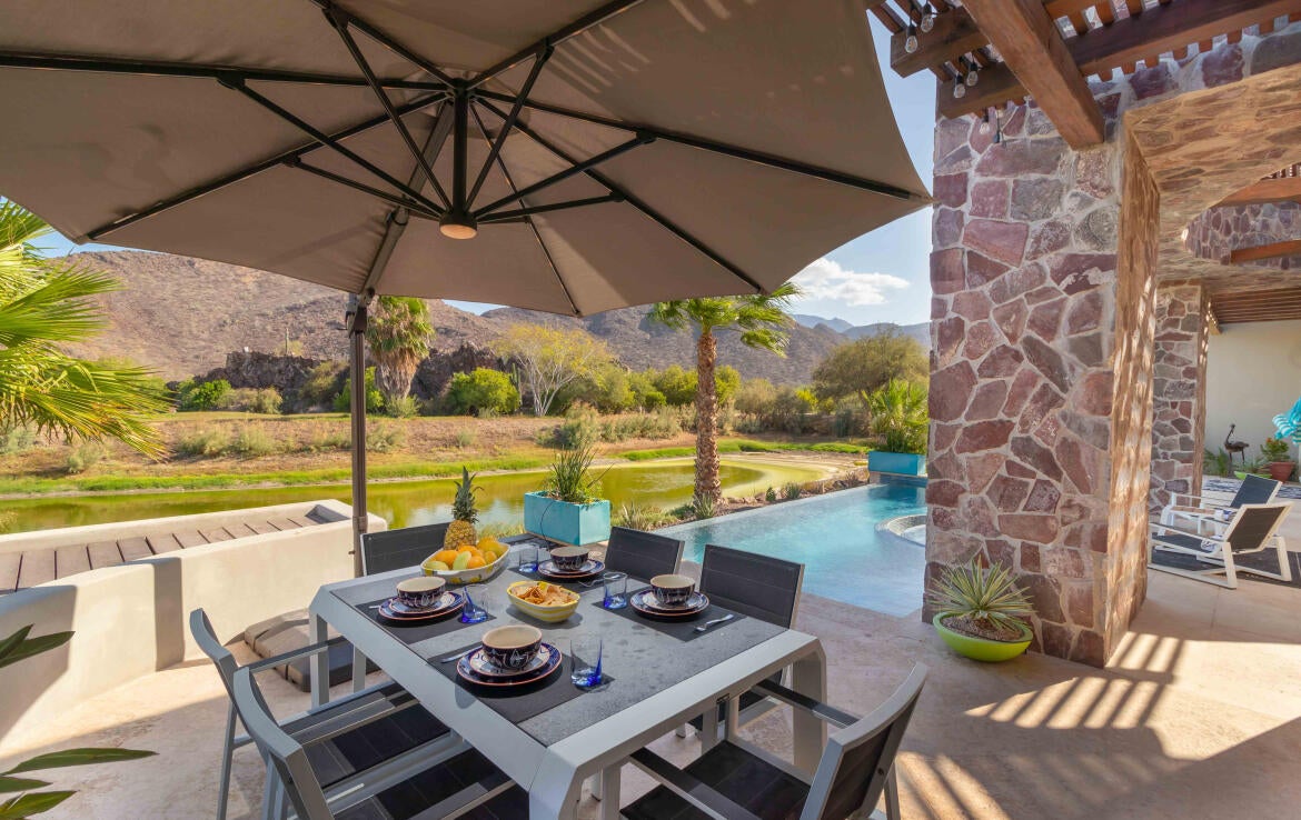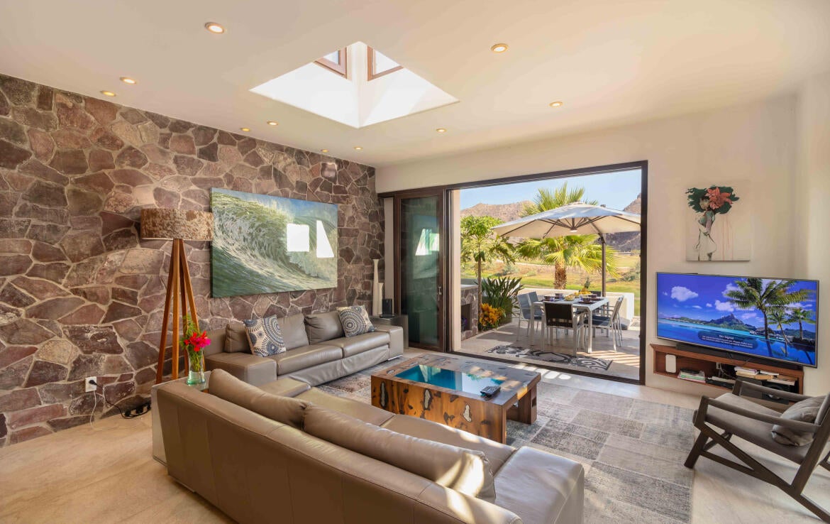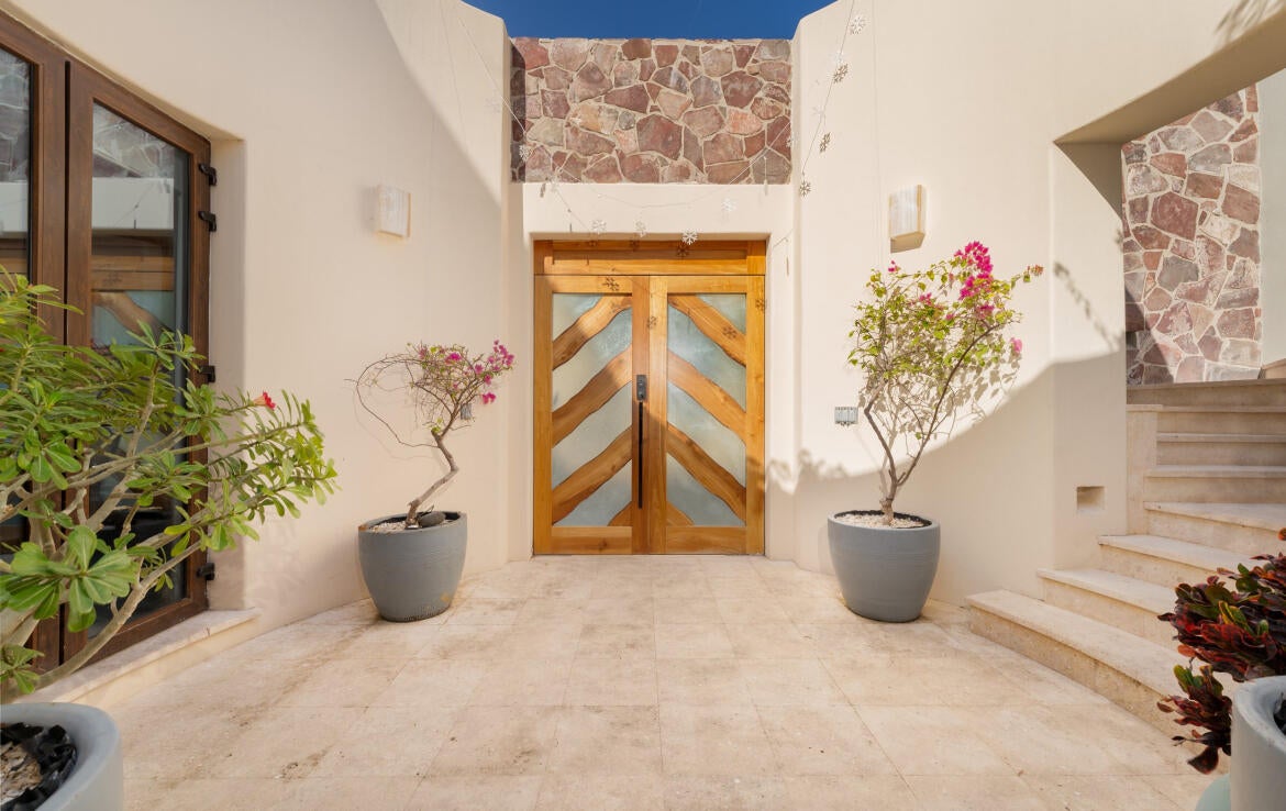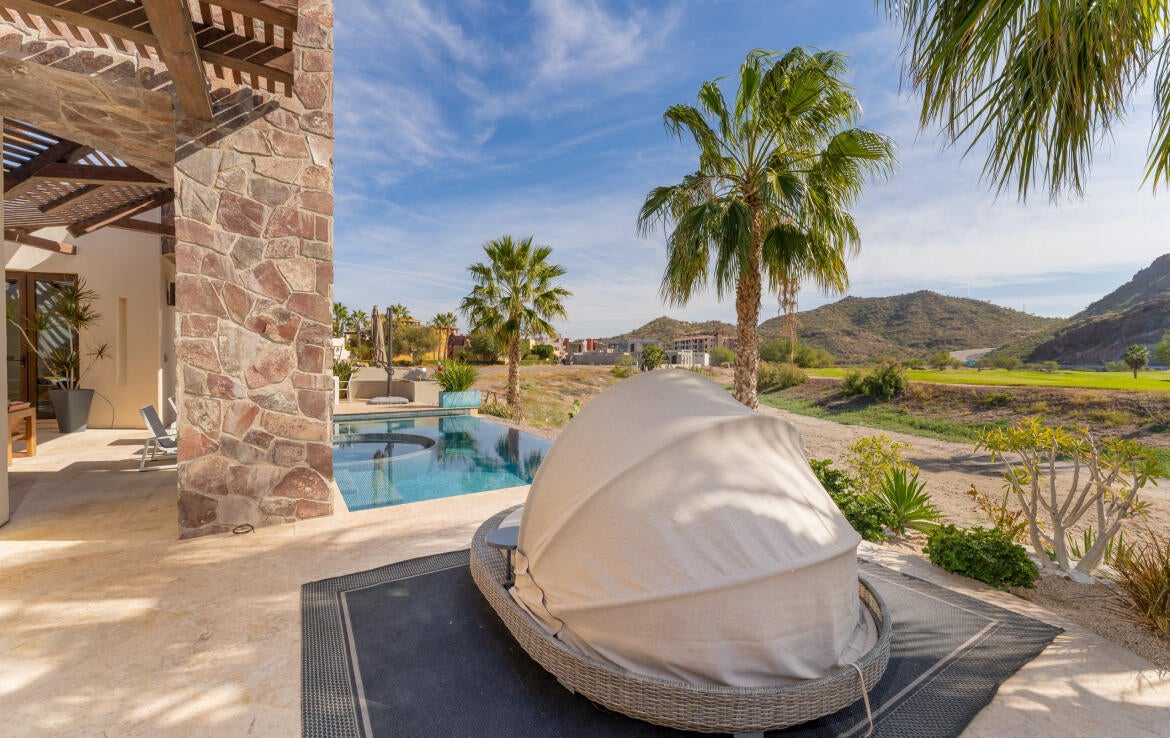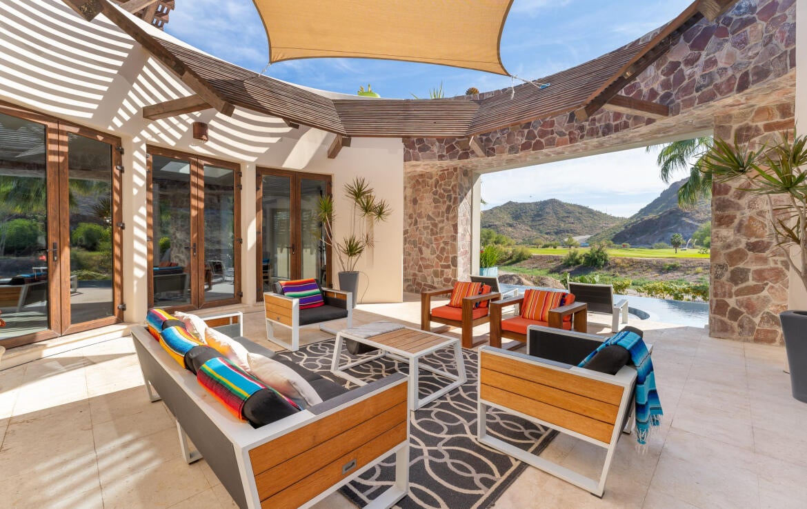 Experience luxury living on the 17th hole of the Loreto Bay Golf Course in this custom 4-bedroom, 5-bath masterpiece by acclaimed Beverly Hills architects Shubin and Donaldson. Enter through resin and wood French doors into a grand circular foyer framing stunning golf course views. The master suite features dual walk-in closets, a marble tub, and indoor/outdoor shower. Enjoy mountain and fairway vistas from the open-concept main level with bar, guest suite, and golf cart garage. Outdoor amenities include a kitchen, pool, spa, and sundeck. Two upper-level suites with private patios offer guest privacy. A rooftop deck crowns this architectural gem.