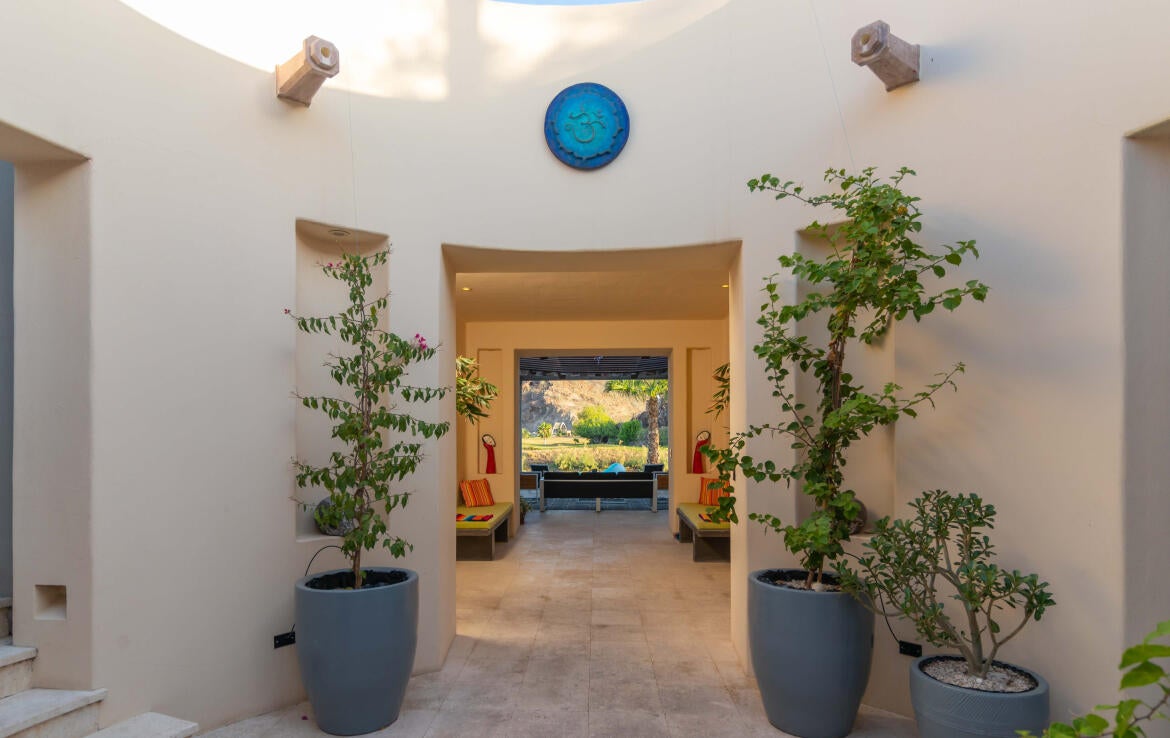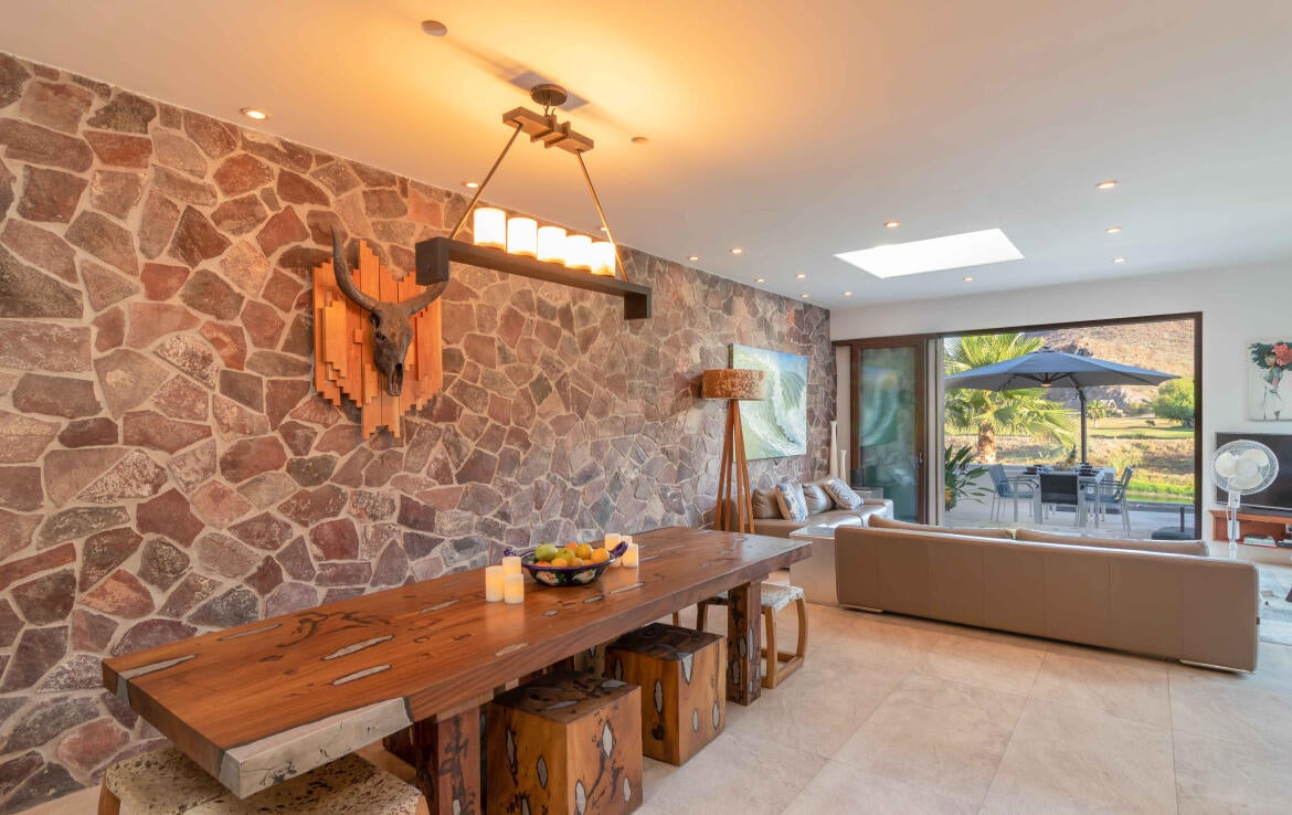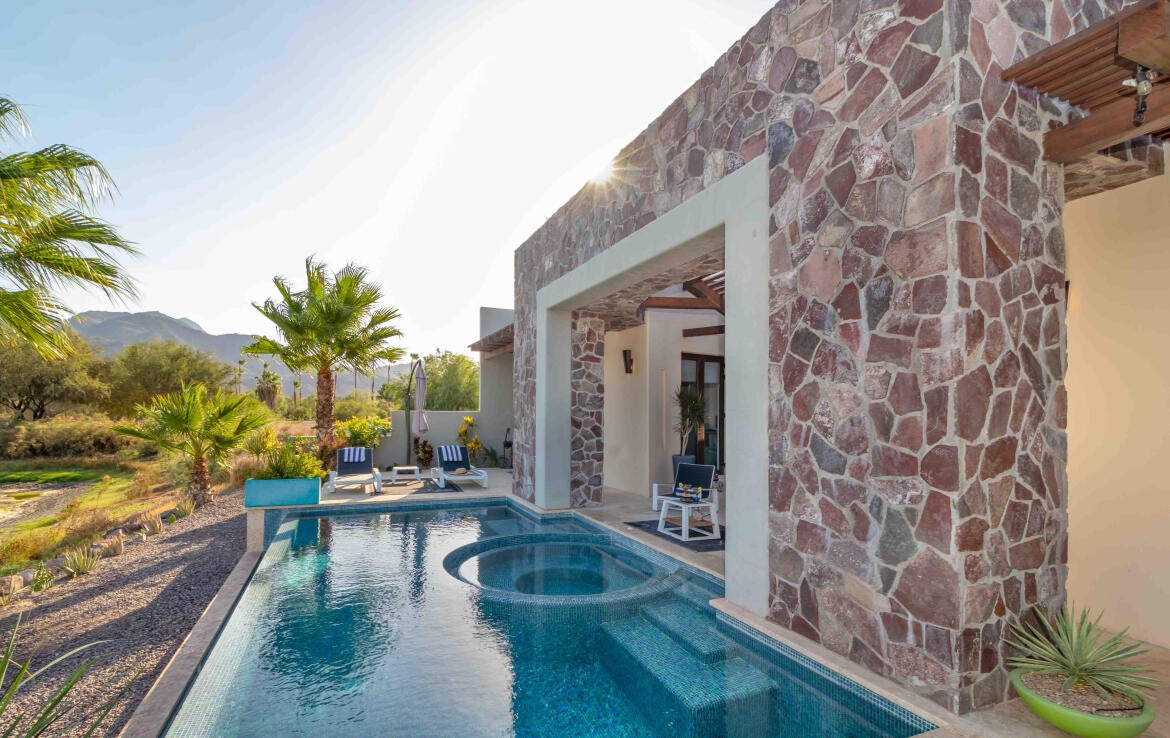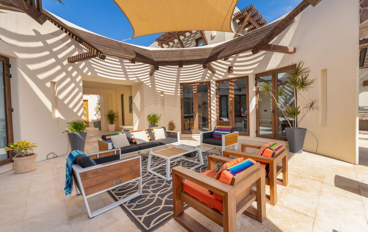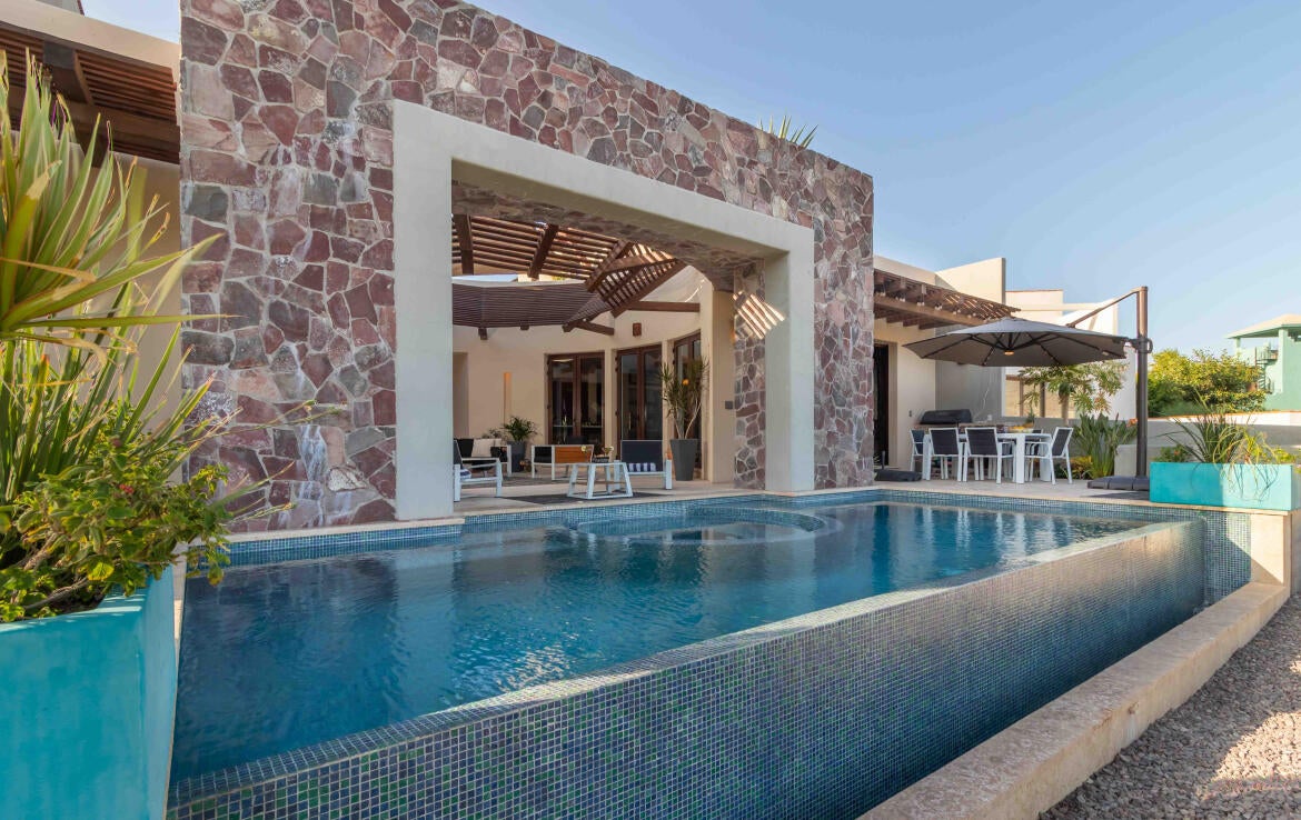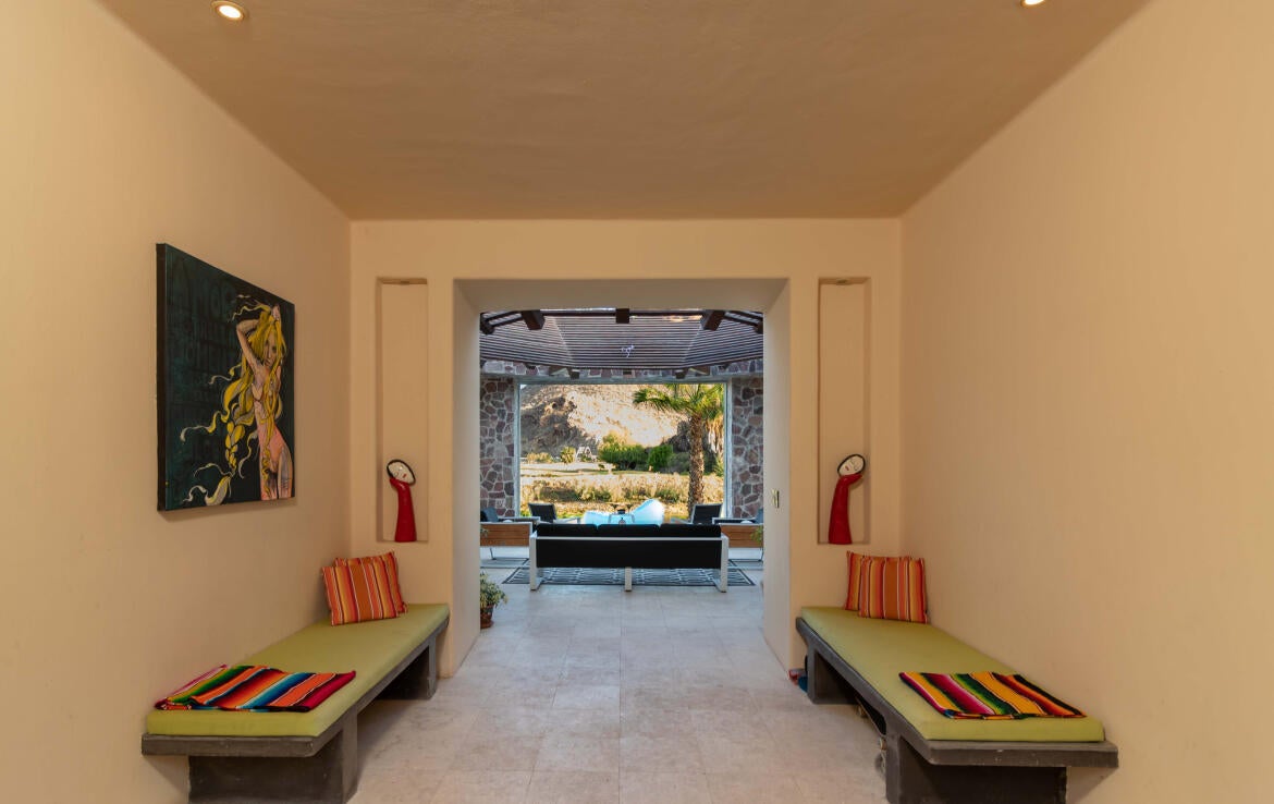 Experience luxury living on the 17th hole of the Loreto Bay Golf Course in this custom 4-bedroom, 5-bath masterpiece by acclaimed Beverly Hills architects Shubin and Donaldson. Enter through resin and wood French doors into a grand circular foyer framing stunning golf course views. The master suite features dual walk-in closets, a marble tub, and indoor/outdoor shower. Enjoy mountain and fairway vistas from the open-concept main level with bar, guest suite, and golf cart garage. Outdoor amenities include a kitchen, pool, spa, and sundeck. Two upper-level suites with private patios offer guest privacy. A rooftop deck crowns this architectural gem.