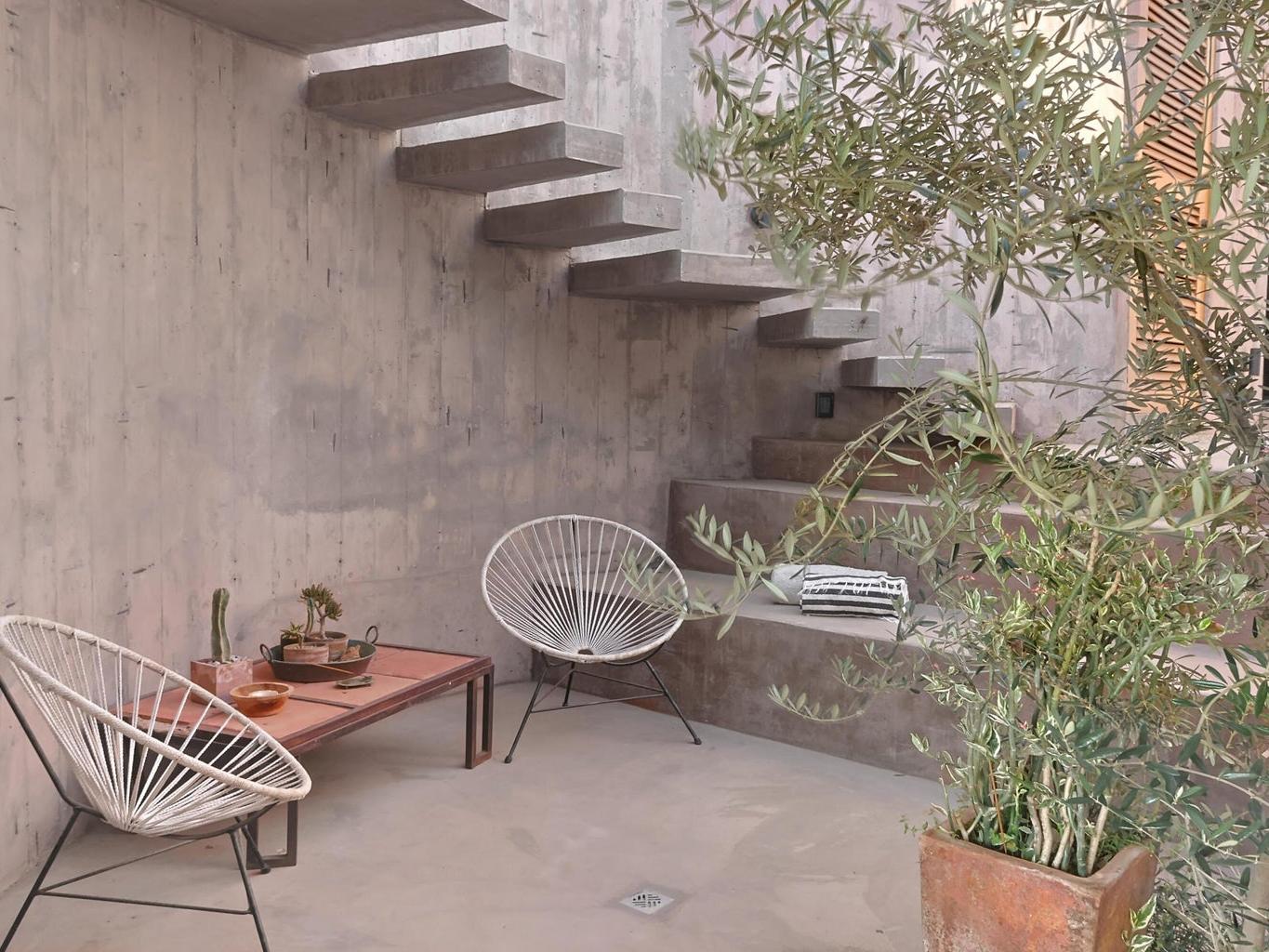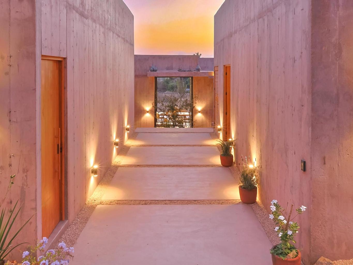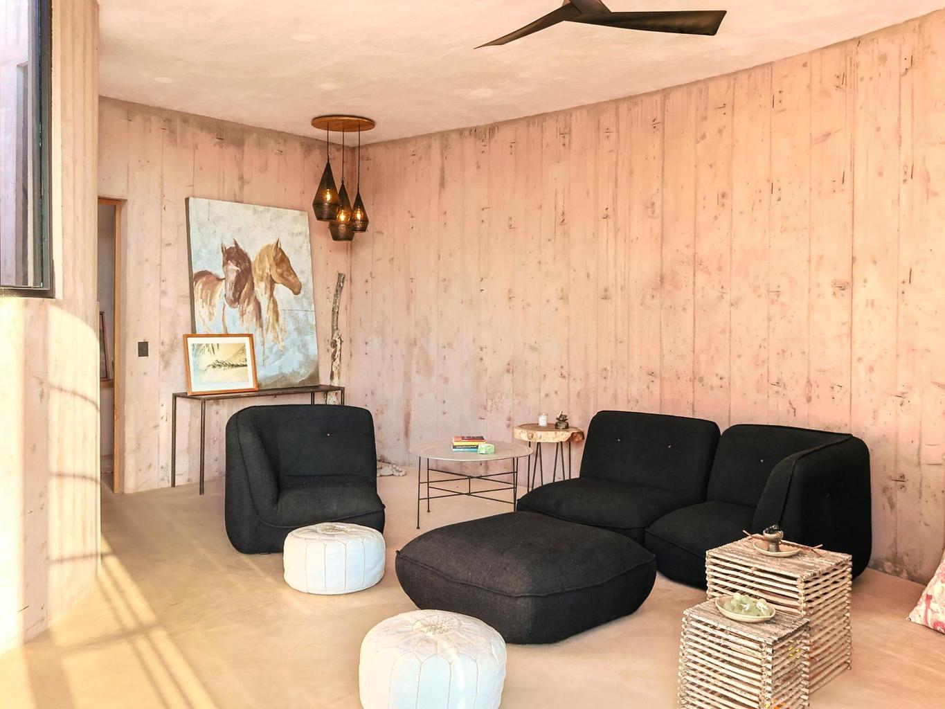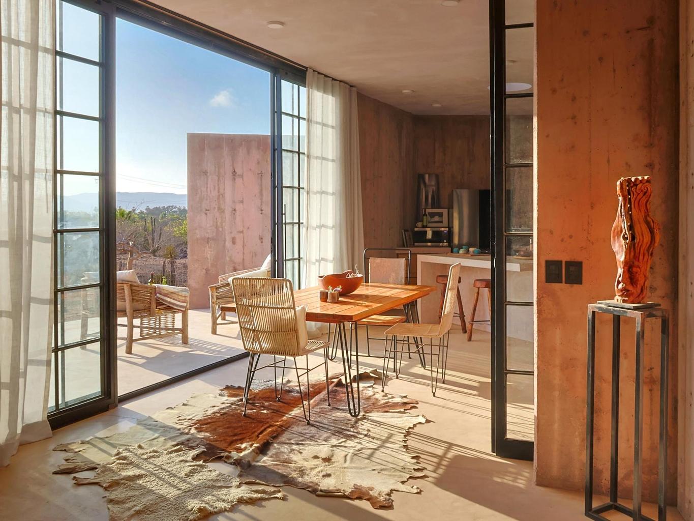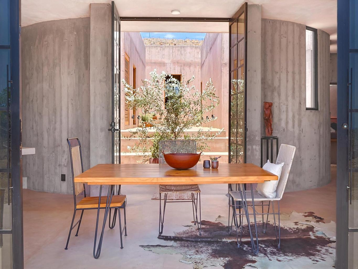 Rooted in brutalist design, Casa Anicca features clean geometric lines, sculptural concrete forms, and a minimalist aesthetic that highlights its connection to the surrounding landscape. The home's rose quartz-inspired tinted concrete walls add warmth and subtle colour, casting a soft blush tone that shifts beautifully with the changing desert light.