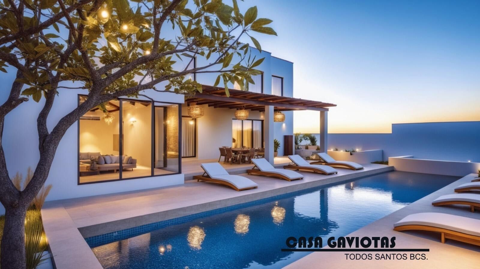This custom-built, pre-construction home boasts stunning contemporary architecture and spans 2,683 sq. ft. with 3 bedrooms and 3 bathrooms. It features 2 car spaces, a private pool, terrace, and BBQ area. Fully walled for maximum security and privacy, the home is situated in the desirable Punta Lobos area—just 2 minutes from downtown Todos Santos and 5 minutes from the beach. The Casa Gaviotas floor plan exemplifies exceptional craftsmanship, with thoughtful details throughout. The open indoor/outdoor layout is perfect for both entertaining and relaxing. Each guest bedroom includes its own bathroom, air conditioning, and built-in closet. The master suite offers sweeping ocean views, a spacious lounge area, air-conditioning, a large walk-in closet, and an elegant en-suite bathroom.