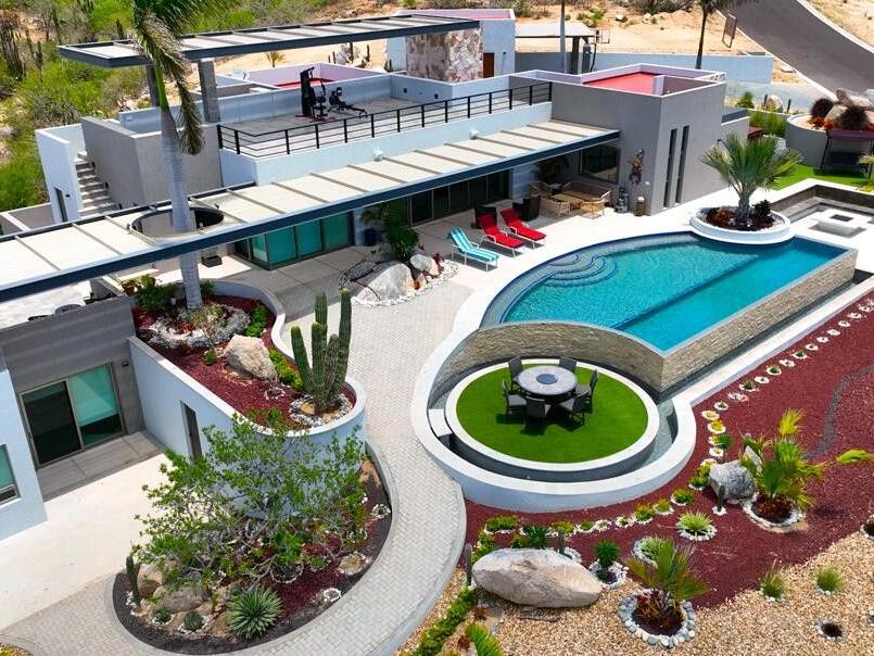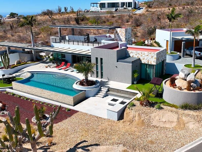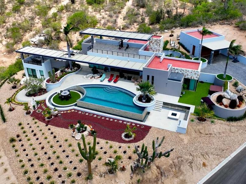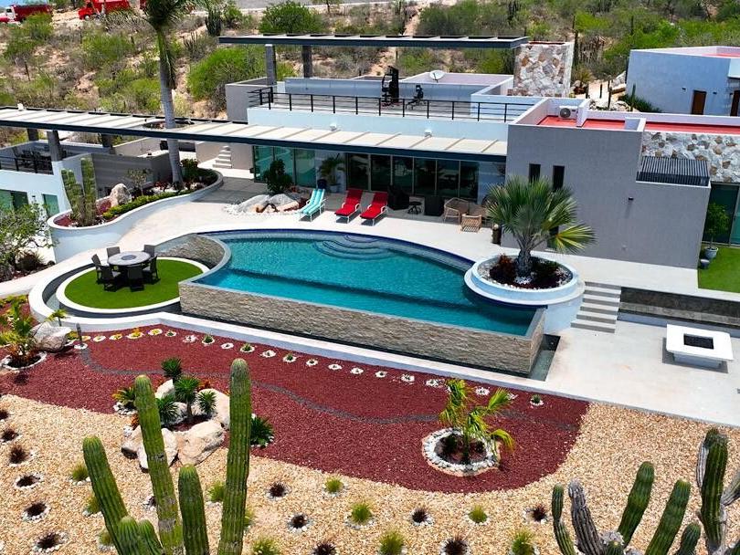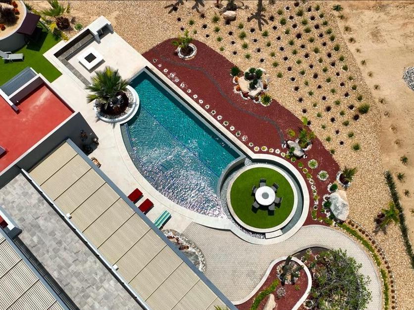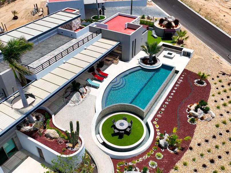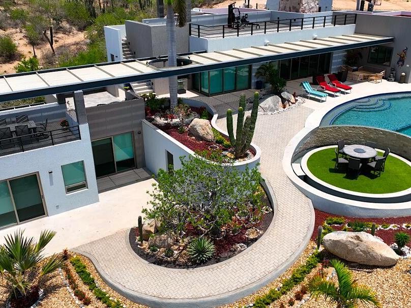 Outdoors, relax in your private paradise featuring a sparkling pool, hot tub, firepit, and lush landscaping. The home also offers a 2-car garage and a 20,000-liter cistern for added convenience.