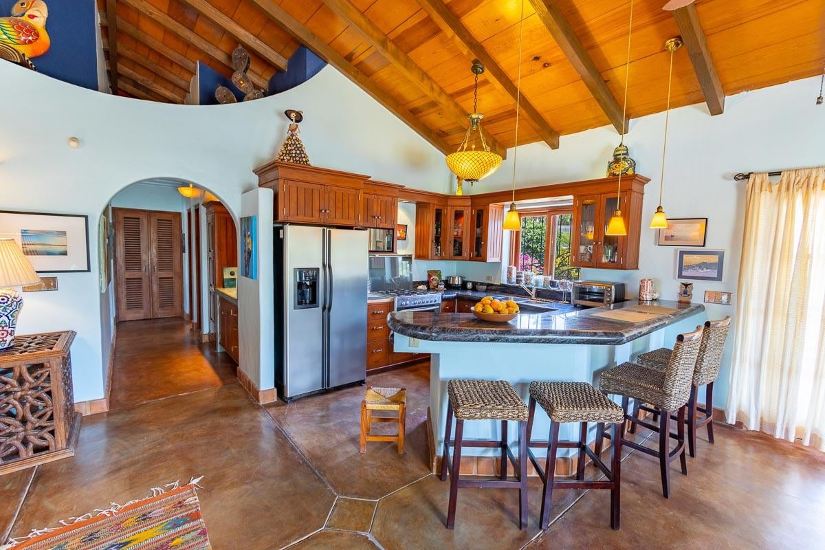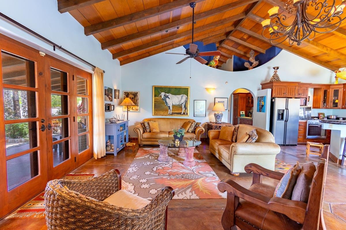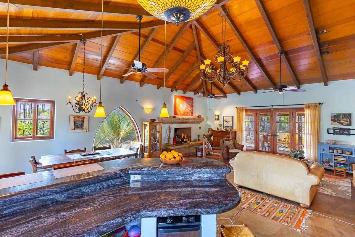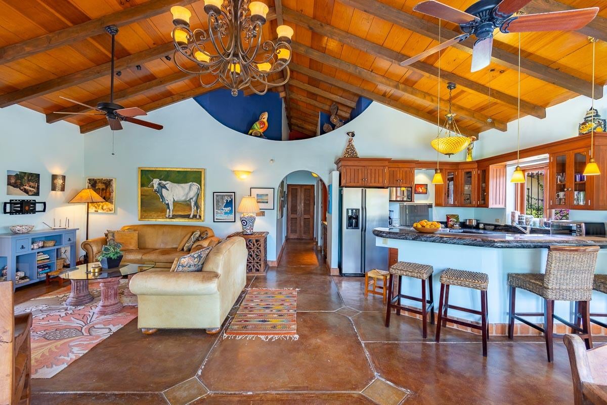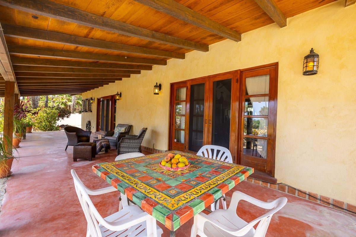 Located quiet cul-de sac, Hacienda Style home Bruce Kramer's masterpiece. Interiors with soothing warm tones,pulido finishes & colorful accents throughout. Dramatic gas fireplace log insert,offers a focal point living room.Tall vaulted wood ceilings & a wet bar. A home that's been loved, & impeccably maintained. Four sets french doors open to outside living & spacious front deck and enjoy & relax, ocean views ground level. Main bedroom boasts ensuite bath & walk-in closet. Guest bedroom w large closet, hallway full bath. Backyard built in barbeque & fountain. With over acre, there's lot of space to enjoy quiet times. Listen ocean waves pounding Pacific, whale watching, margaritas at sunset, rustling leaves of towering palm trees. Enjoy fragrant scent of mangos,plumeria jasmine, 360 views.