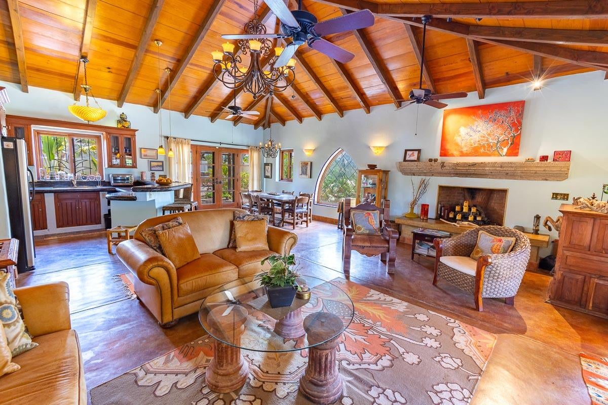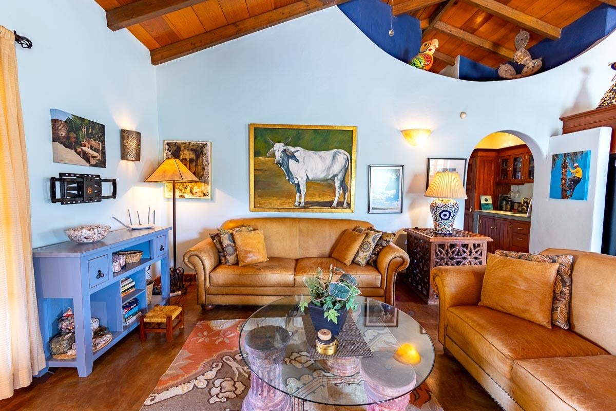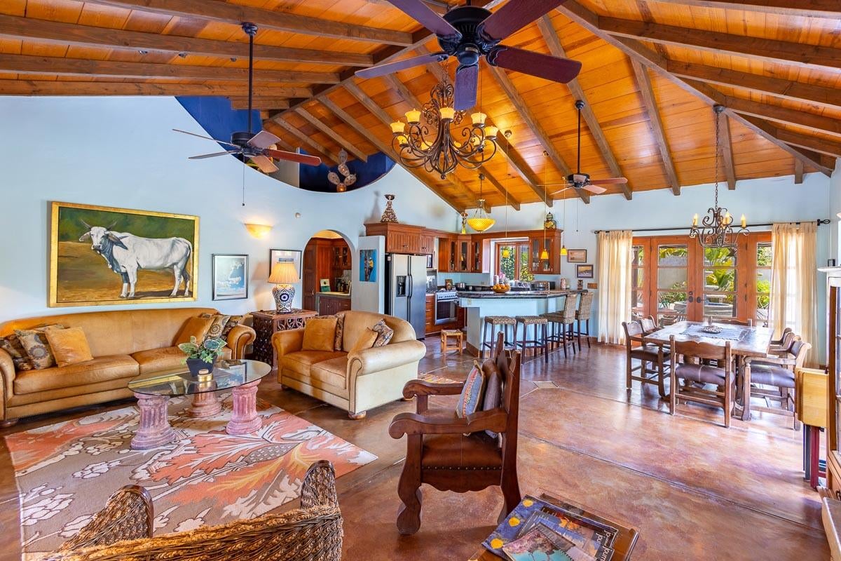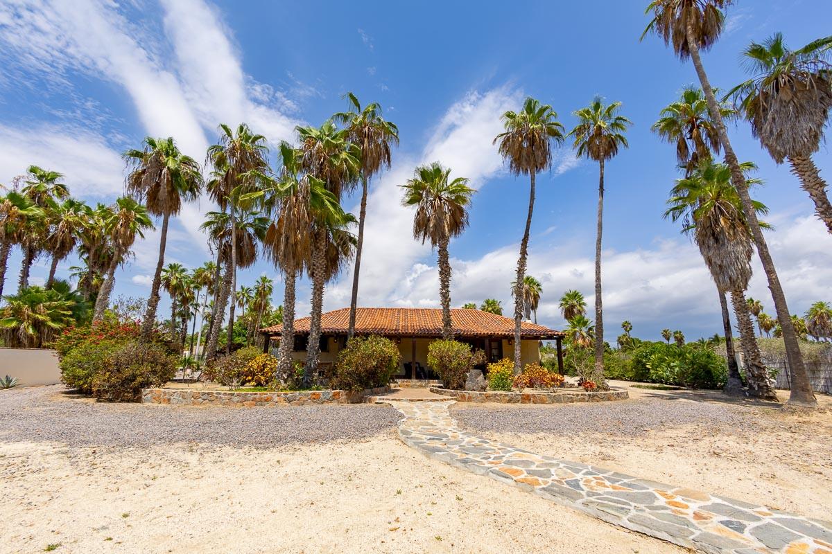 Located quiet cul-de sac, Hacienda Style home Bruce Kramer's masterpiece. Interiors with soothing warm tones,pulido finishes & colorful accents throughout. Dramatic gas fireplace log insert,offers a focal point living room.Tall vaulted wood ceilings & a wet bar. A home that's been loved, & impeccably maintained. Four sets french doors open to outside living & spacious front deck and enjoy & relax, ocean views ground level. Main bedroom boasts ensuite bath & walk-in closet. Guest bedroom w large closet, hallway full bath. Backyard built in barbeque & fountain. With over acre, there's lot of space to enjoy quiet times. Listen ocean waves pounding Pacific, whale watching, margaritas at sunset, rustling leaves of towering palm trees. Enjoy fragrant scent of mangos,plumeria jasmine, 360 views.