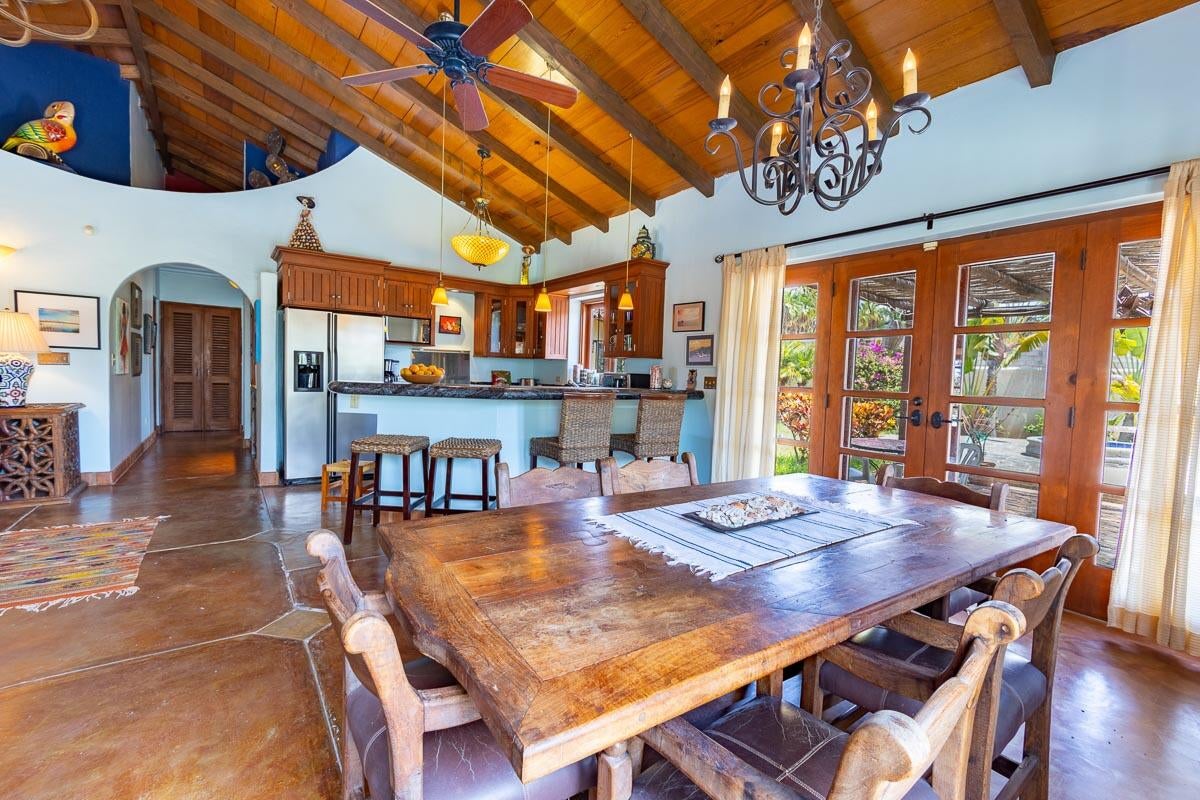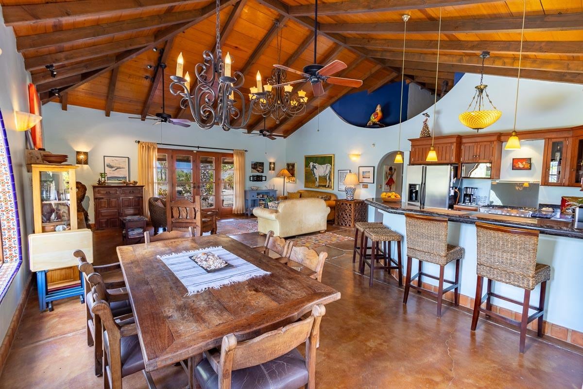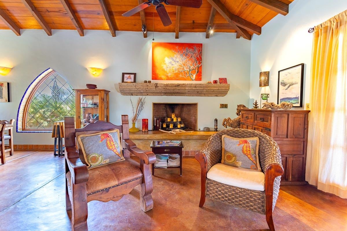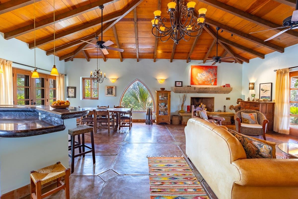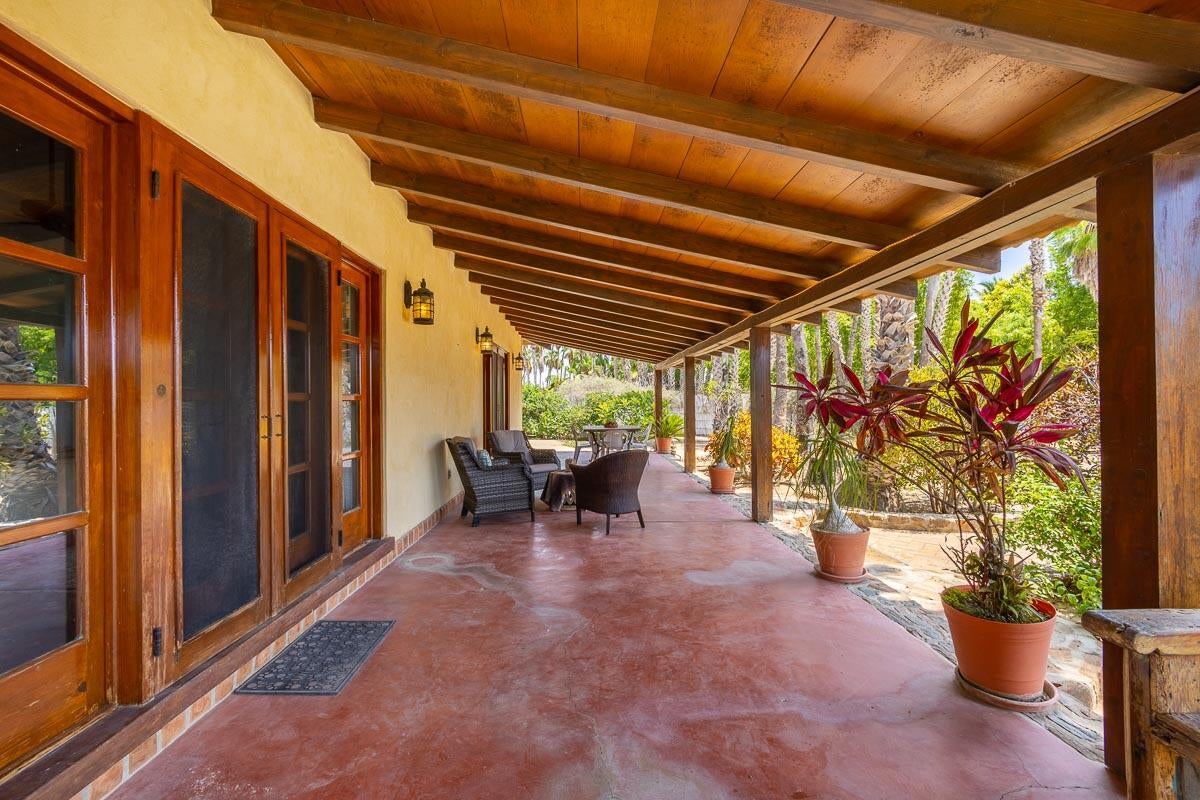 Located quiet cul-de sac, Hacienda Style home Bruce Kramer's masterpiece. Interiors with soothing warm tones,pulido finishes & colorful accents throughout. Dramatic gas fireplace log insert,offers a focal point living room.Tall vaulted wood ceilings & a wet bar. A home that's been loved, & impeccably maintained. Four sets french doors open to outside living & spacious front deck and enjoy & relax, ocean views ground level. Main bedroom boasts ensuite bath & walk-in closet. Guest bedroom w large closet, hallway full bath. Backyard built in barbeque & fountain. With over acre, there's lot of space to enjoy quiet times. Listen ocean waves pounding Pacific, whale watching, margaritas at sunset, rustling leaves of towering palm trees. Enjoy fragrant scent of mangos,plumeria jasmine, 360 views.