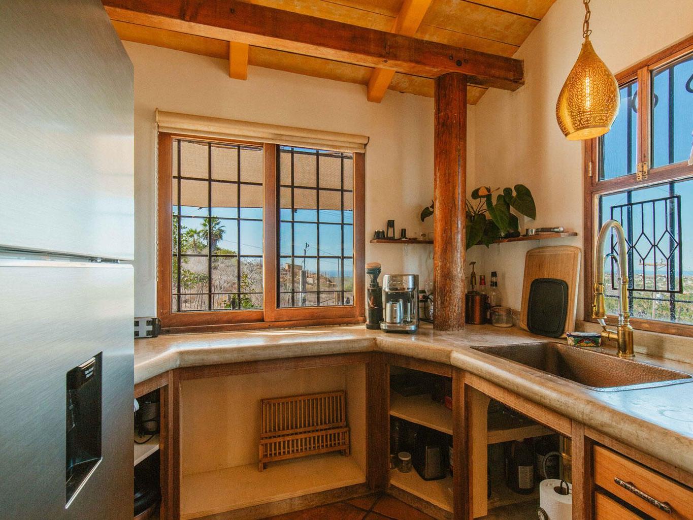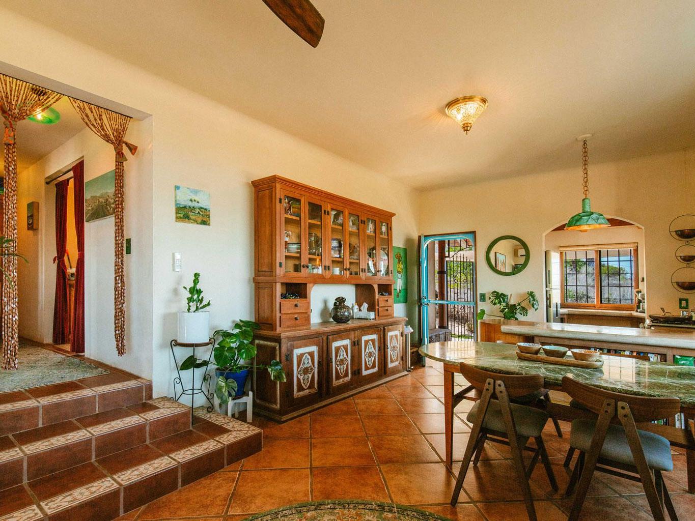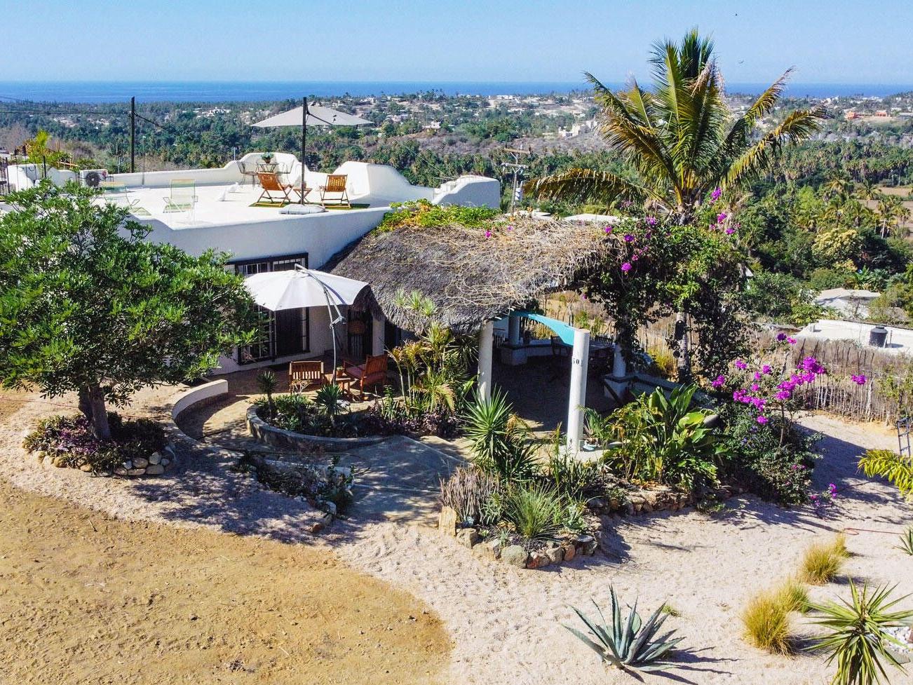 This majestic 2 bedroom 1 bath home sits atop a very private hill offering unparalleled 360 degree views of sunsets over the ocean, moon rises over the mountains, and the entire lush green huerta. Located just a quick drive or walk to downtown, 5 minute drive to the nearest beach, and within 15 minutes to both Cerritos surf spot in the South and La Pastora surf spot in the North, this thoughtfully crafted and cared for home captures everything one hopes to find in Todos Santos! Beautifully landscaped, this spacious property has mature date and fan palm trees, mango, neem, and pistachio trees, a BBQ area, four furnished patio spaces, remote controlled gated access, and plenty of storage.