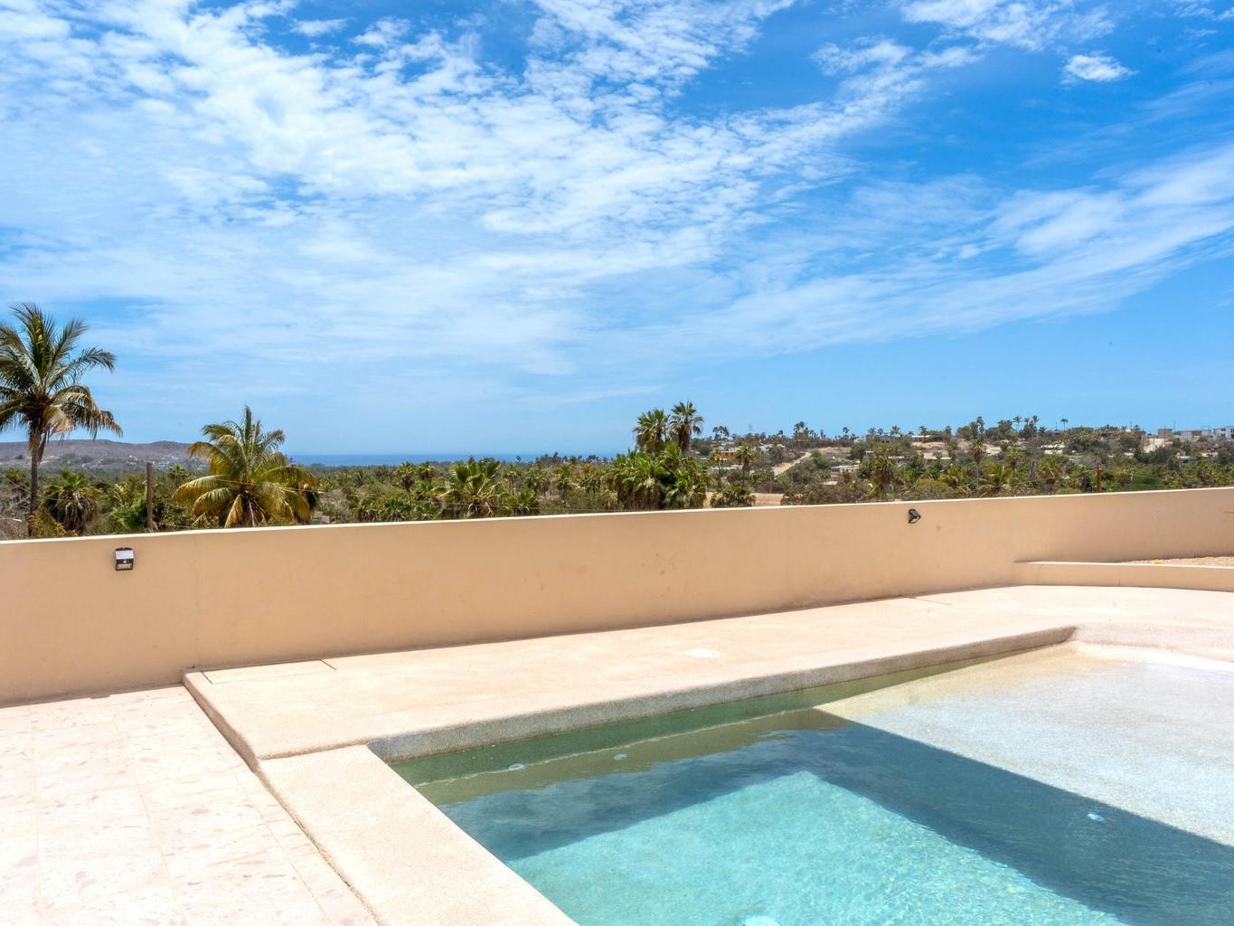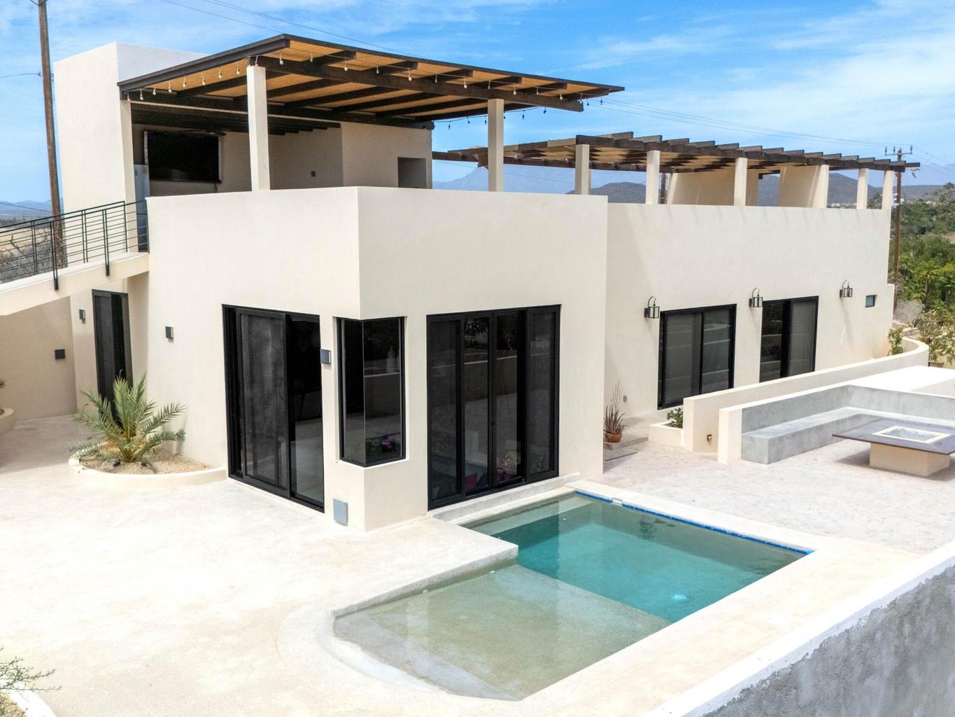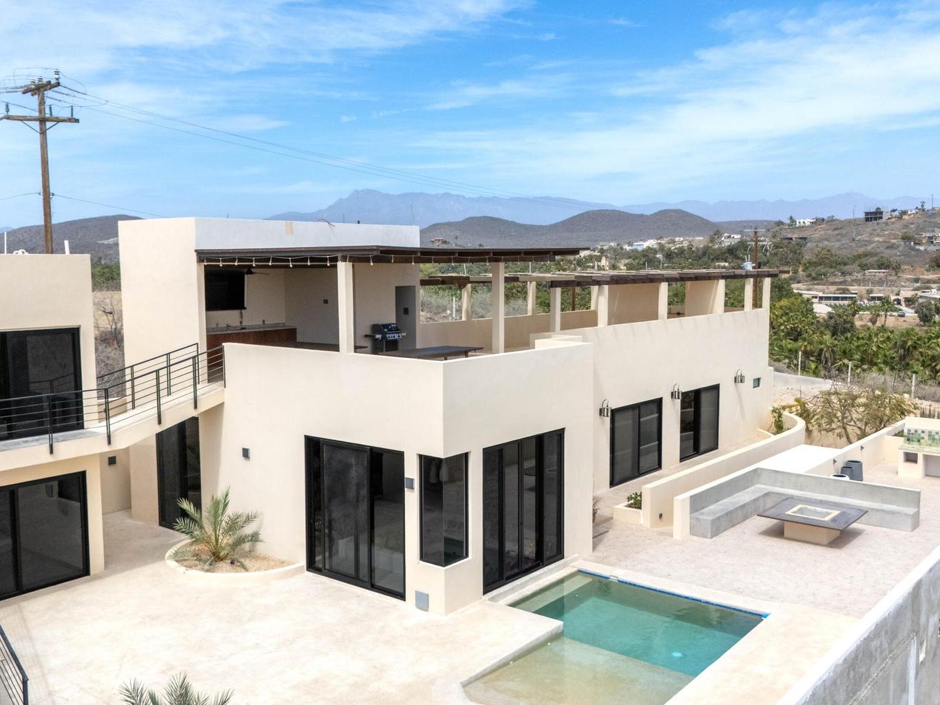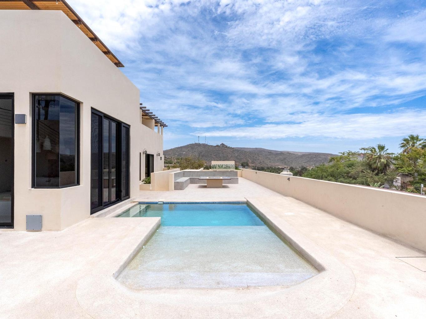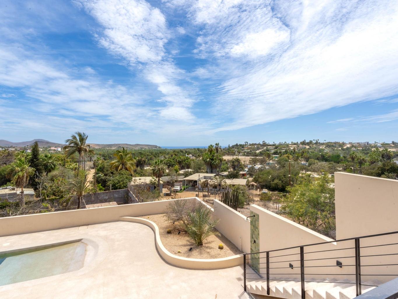 Welcome to Casa Lola, a modern hillside retreat in the Las Flores neighbourhood of Todos Santos, with sweeping views of lush palm groves to the Pacific ocean. This thoughtfully designed compound includes a 3500 sqf home with sunken living room with floor-to-ceiling glass that opens to the pool and patio, a gourmet kitchen ideal for entertaining, a luxurious primary suite with a spa like en-suite, large walk-in closet and private hot-tub garden escape. Two separate guest casitas with full en suites offer comfort and privacy for guests, while the giant rooftop patio with kitchen and dining space invites sunset gatherings with friends. The oversized garage and maid's quarters add flexibility. Minutes from town, Dolce Cuarenta and highway 19, Casa Lola is a must see property in todays market.