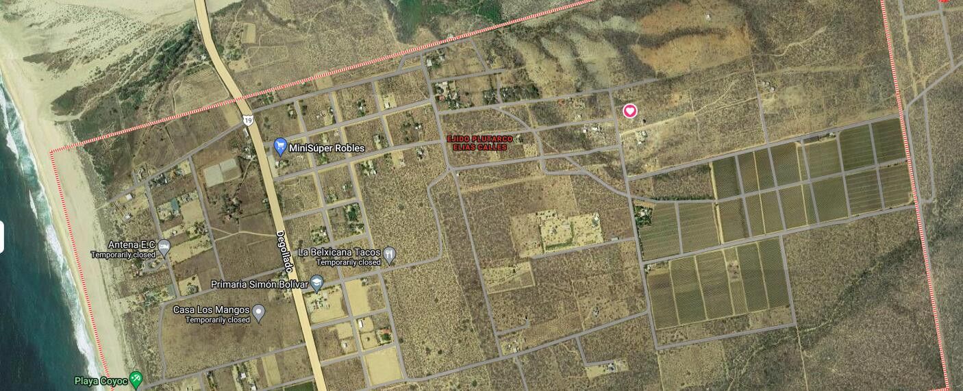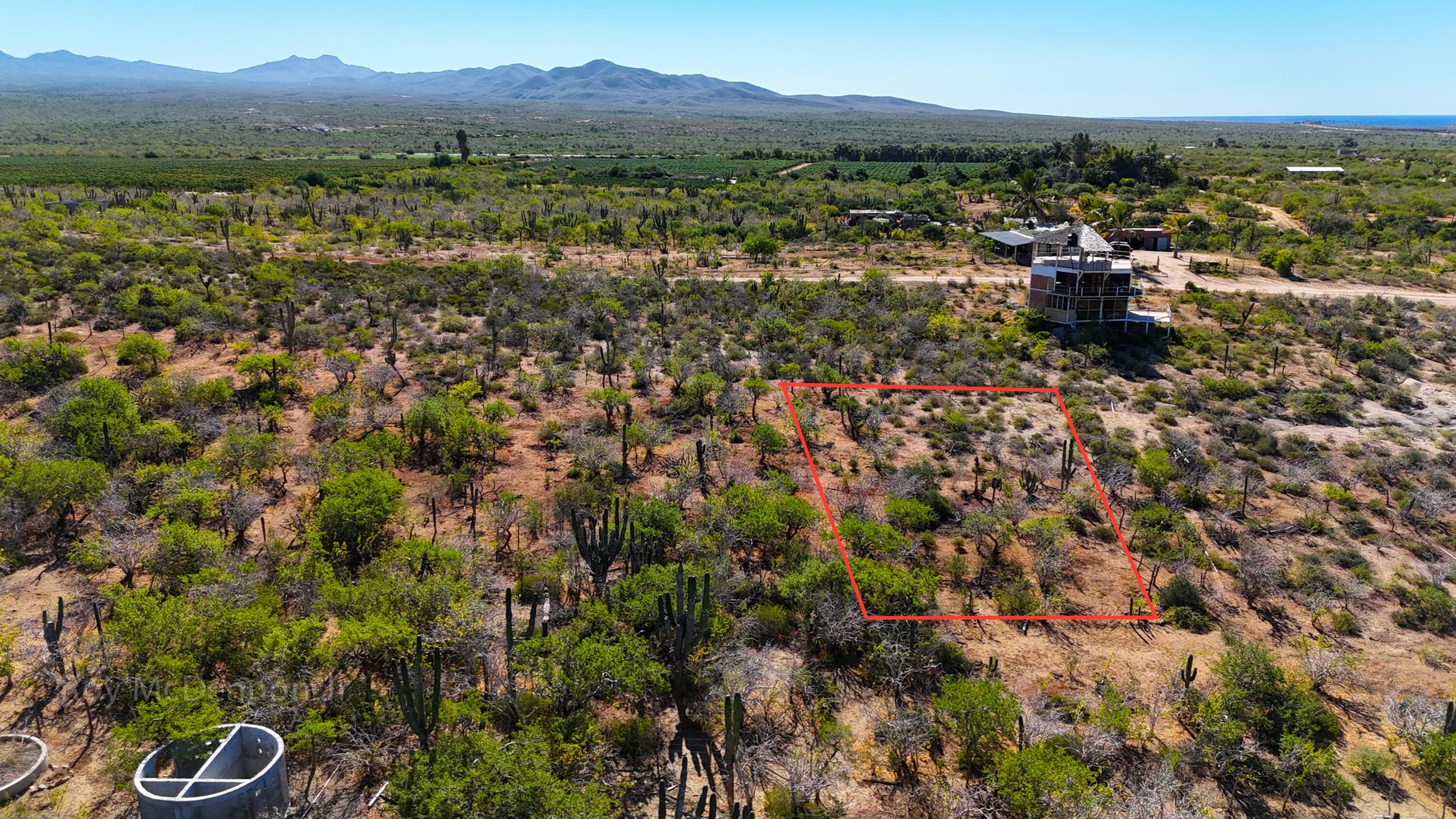 Large, flat lot with ocean views in the tranquil up and coming area of Elias Calles. Panoramic ocean views through the arroyo and across the farm lands of this peaceful community. This lot has a great backdrop of the Sierra de la Laguna mountains. Only 15 minutes from Pescadero, 25 from Todo Santos and 50 mins from Cabo. This is an off grid community.