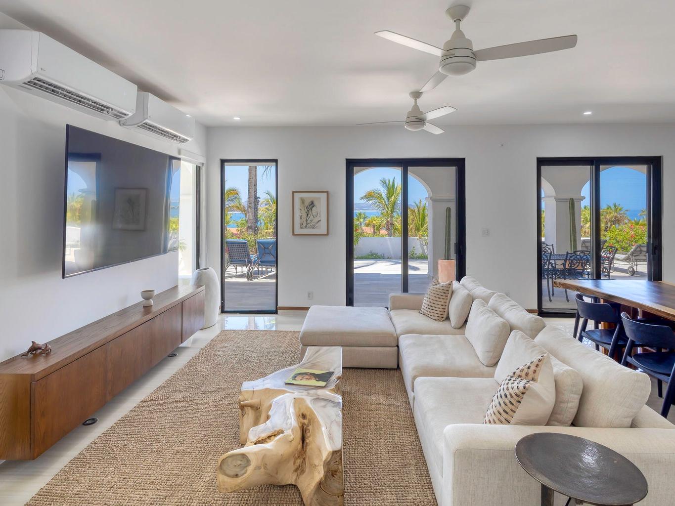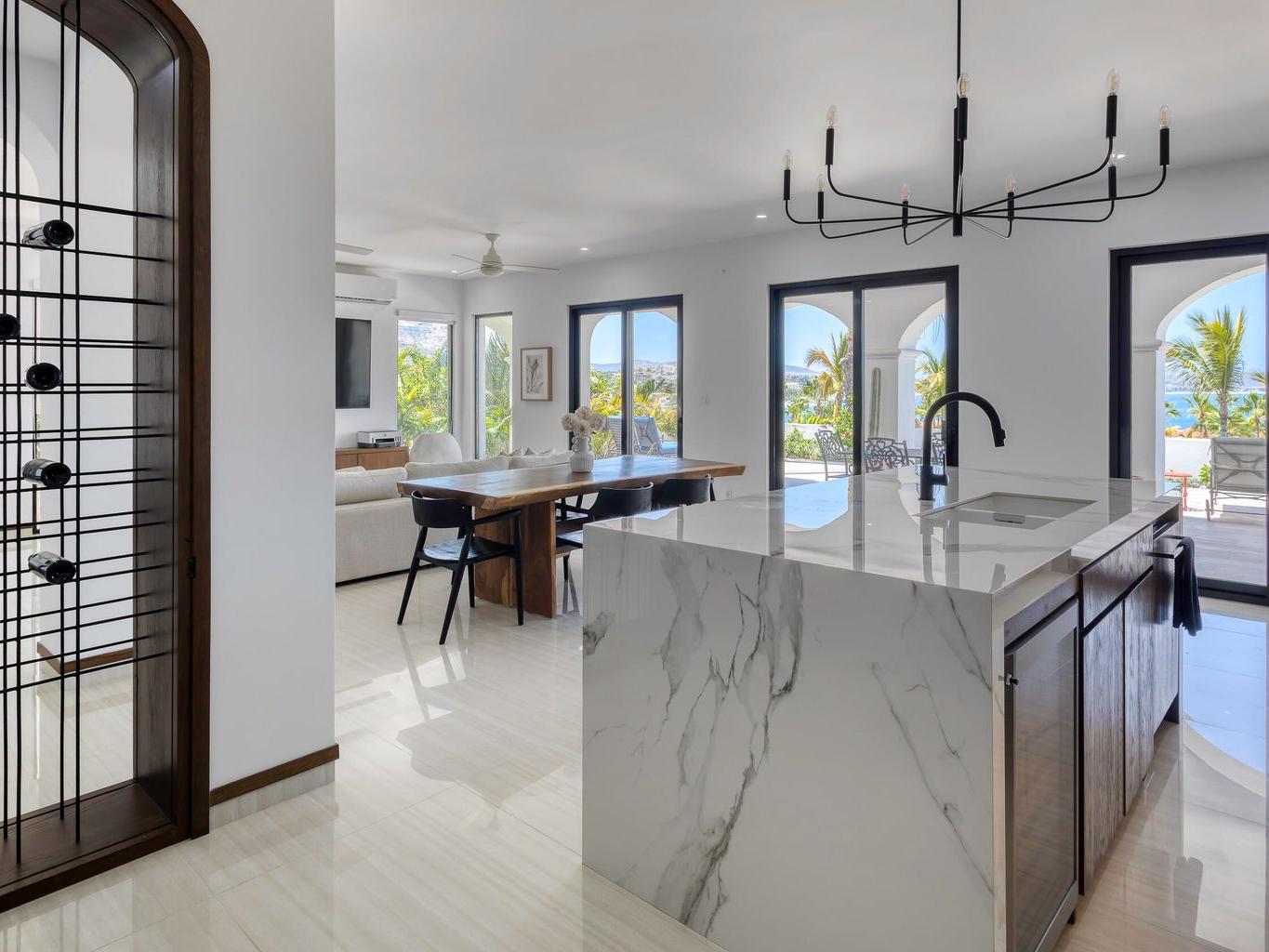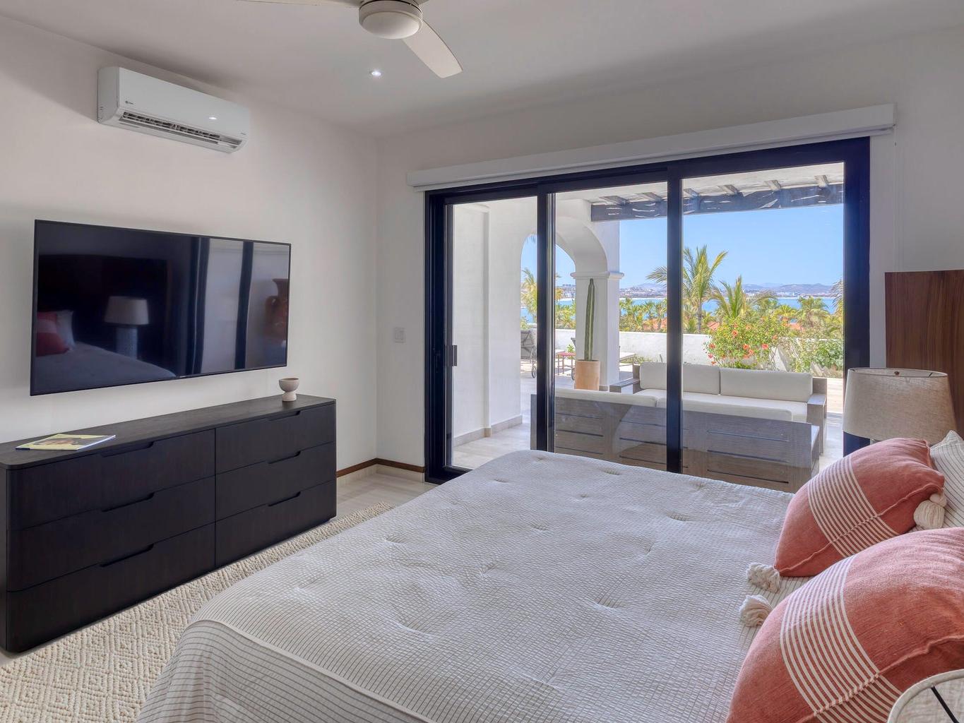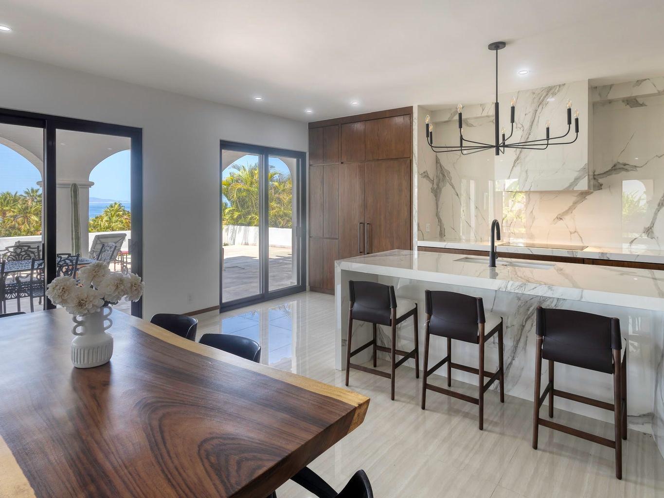 Iconic Palmilla Bay ocean and mountain views from this newly renovated villa. Styled to a high spec and modern palate with attention to detail and comfort being paramount. This three-bedroom, three bath condo is truly sumptuous. An open kitchen living plan overlooks a massive terrace patio with both covered and full sun areas. Third bedroom with a full ensuite bathroom has been seamlessly incorporated for your family and guest comfort. Master suite and bathroom feature an air-conditioned wet room with raised roman bathtub. All this comes with the enviable Palmilla lifestyle a double garage and views sure to please the most discriminating. A full $600,000 renovation has created this sleek modern view home on the ground floor