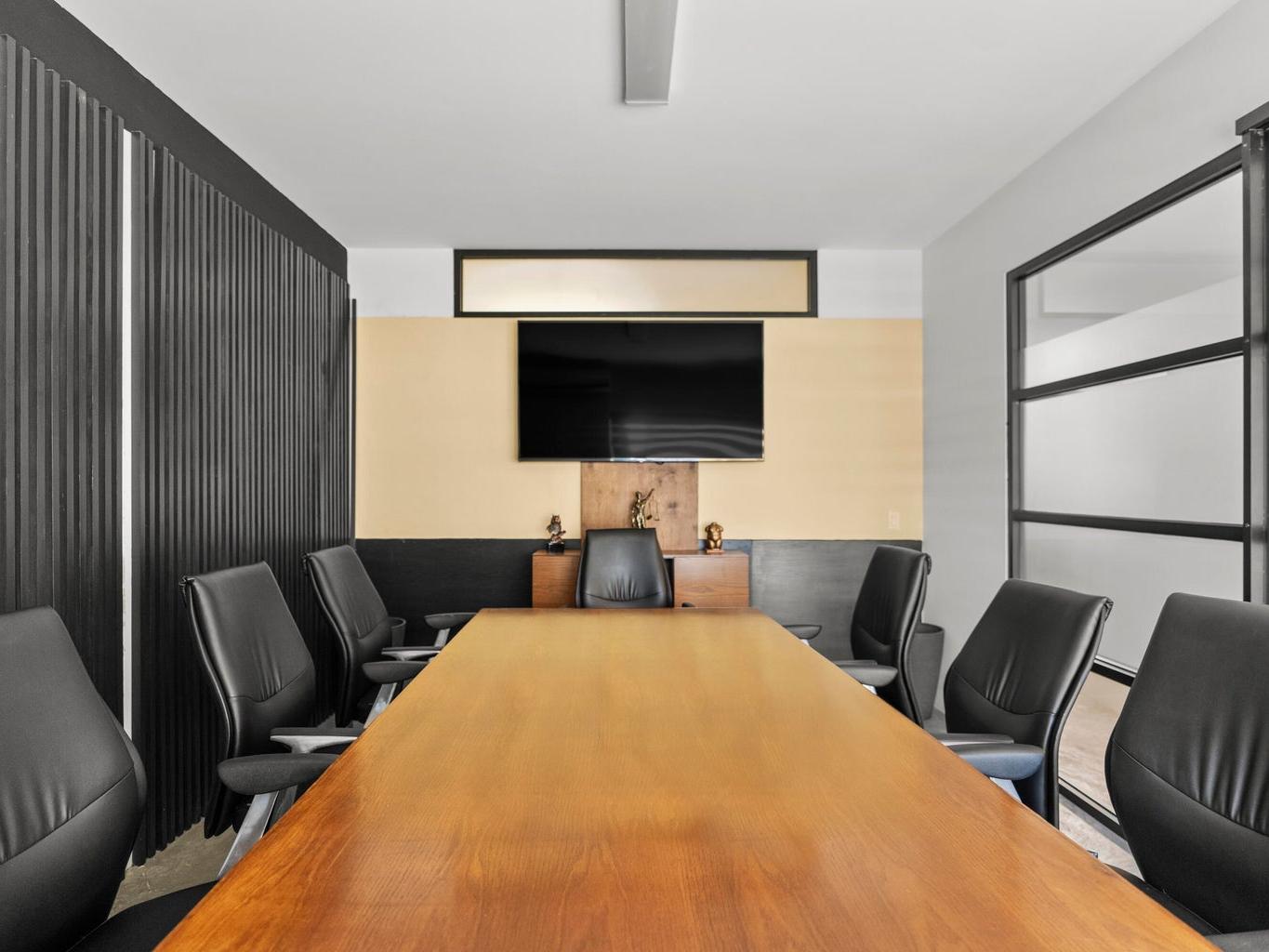The interior features a versatile industrial design with a thoughtfully planned layout. A spacious reception area welcomes guests upon entry, with a private office located to the right and a conference room to the left. Toward the rear of the space is an open work area currently configured with cubicles and a kitchenette break room, while two executive suites are positioned at either end.