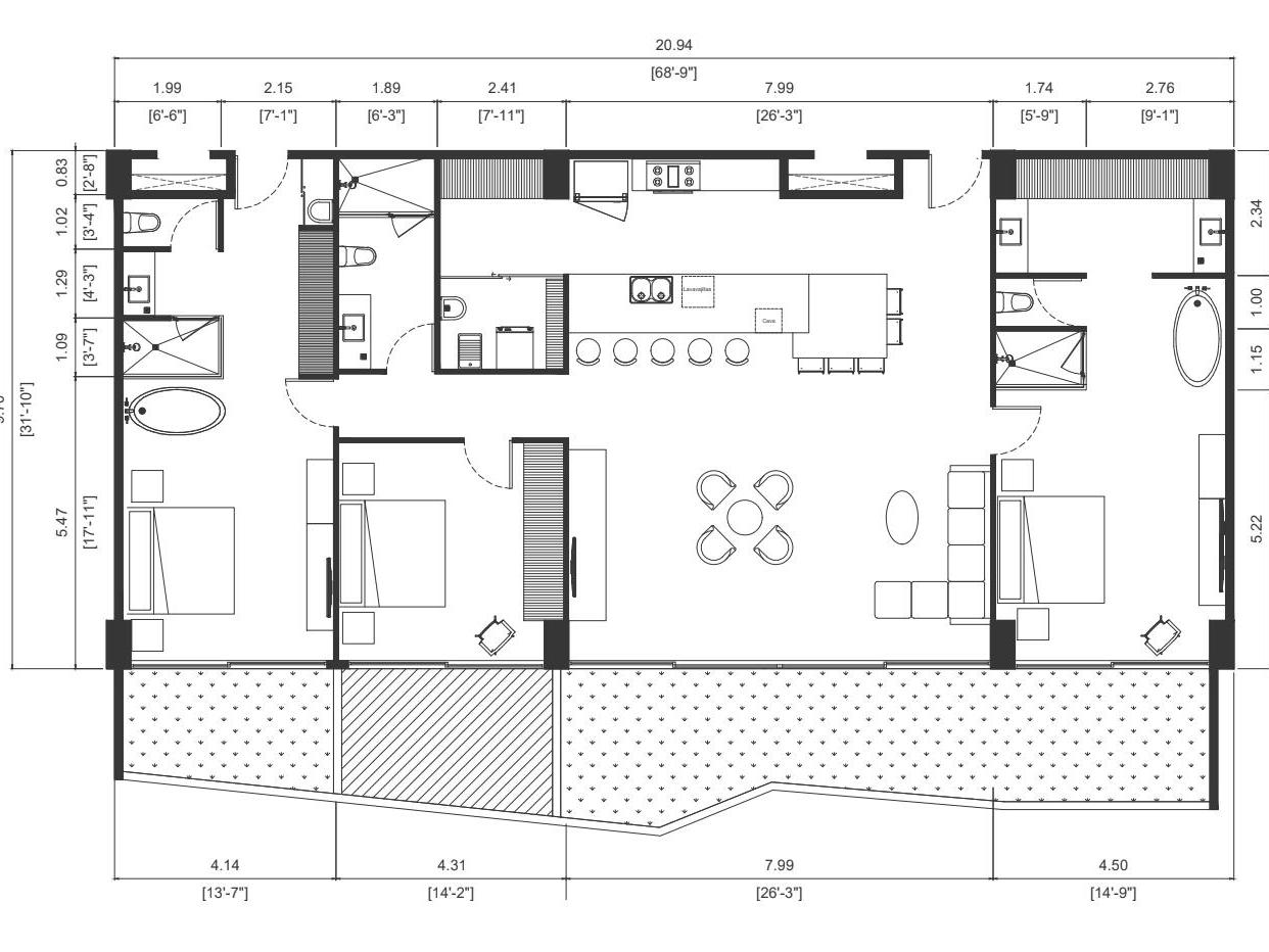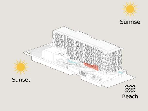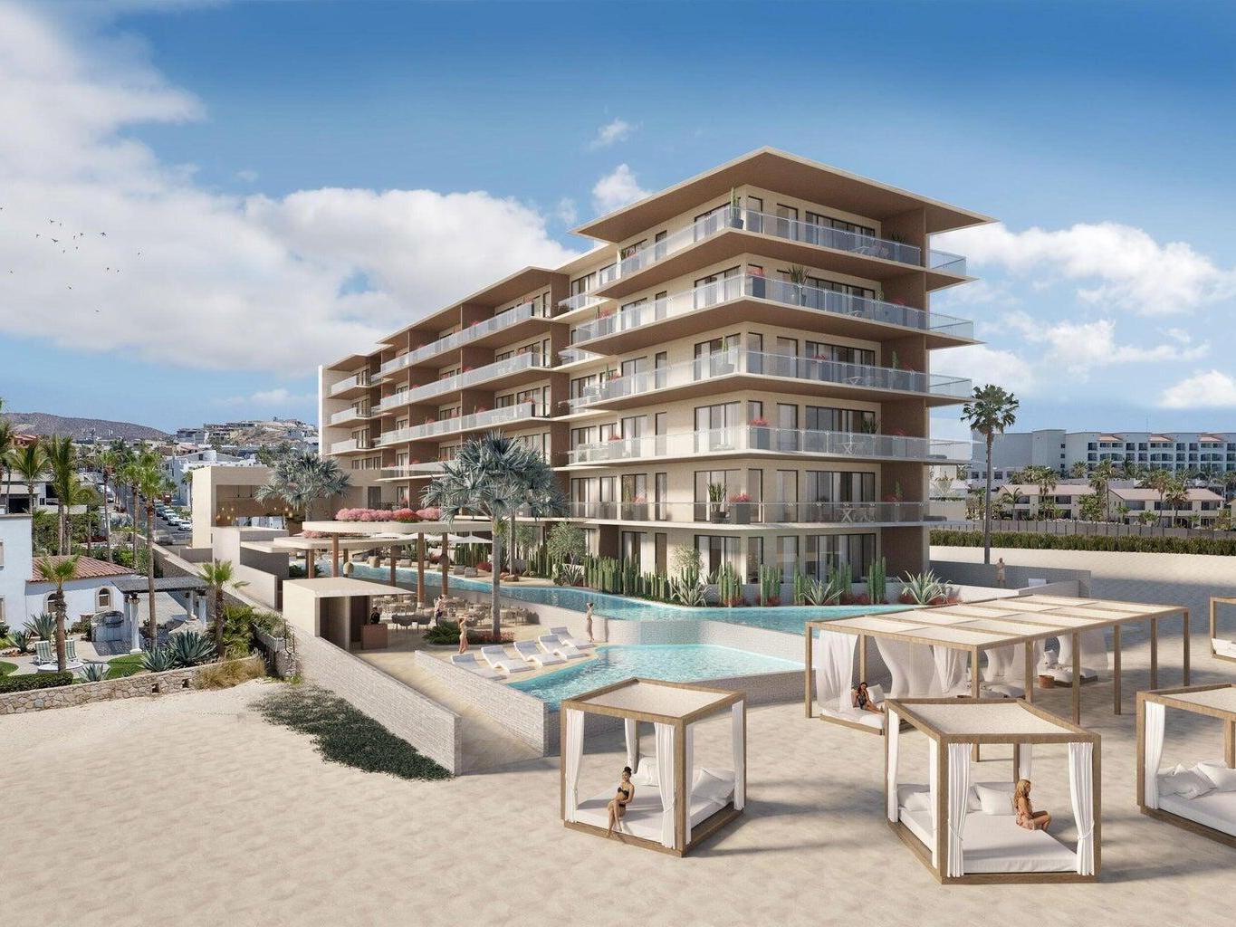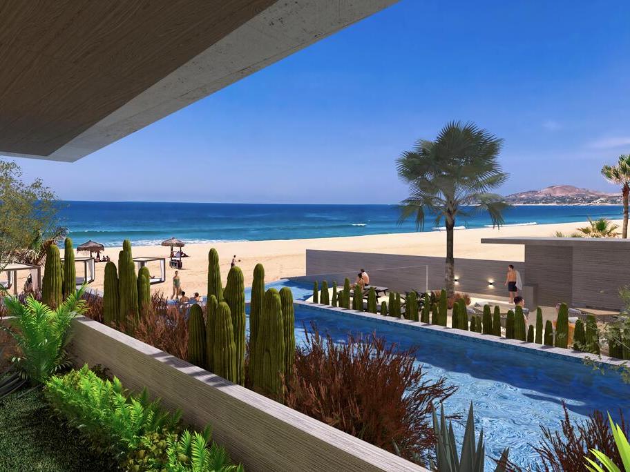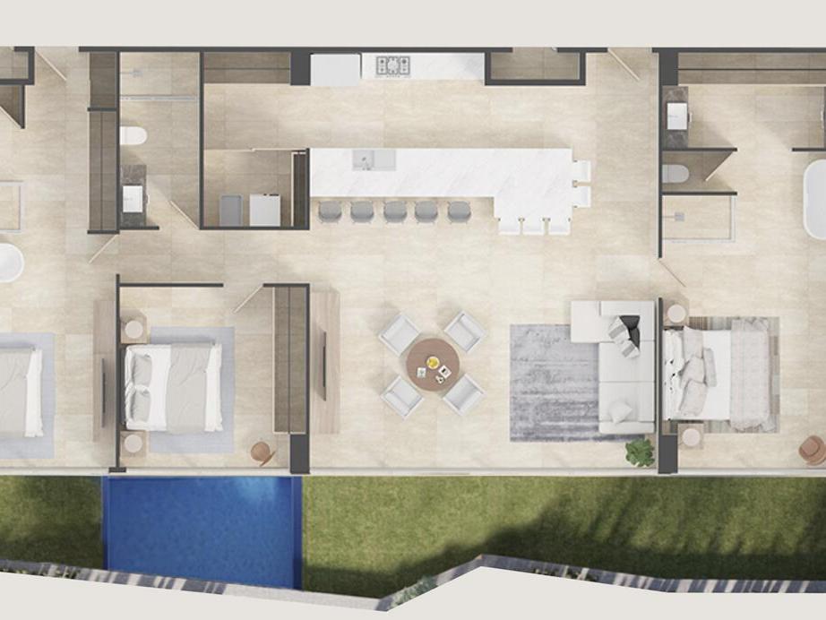 The three-bedroom residence at ALBALUZ, with a hotel-suite lock-off option, features a 108 sqft private pool, bathtubs, and spectacular ocean and beachfront views of San José Bay from all bedrooms and the dining room. The two master bedrooms include ensuite bathrooms and bathtubs. The rooms are arranged around a fully equipped open-concept kitchen, with an additional room that can function as an office and a shared bathroom for guests, a laundry room, a dining room, and a living room with a sofa that can be adapted to create a fourth room if needed.