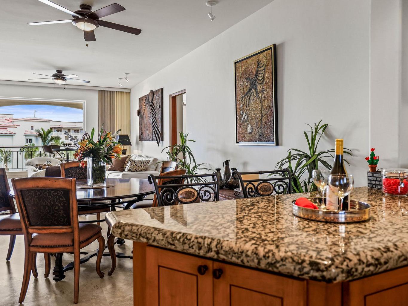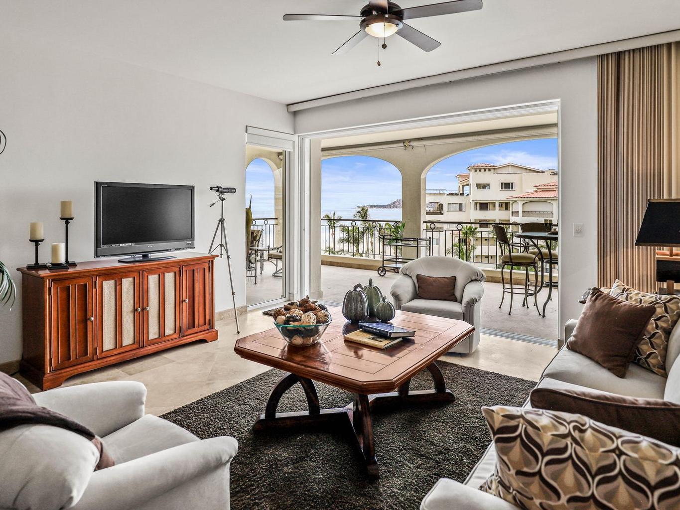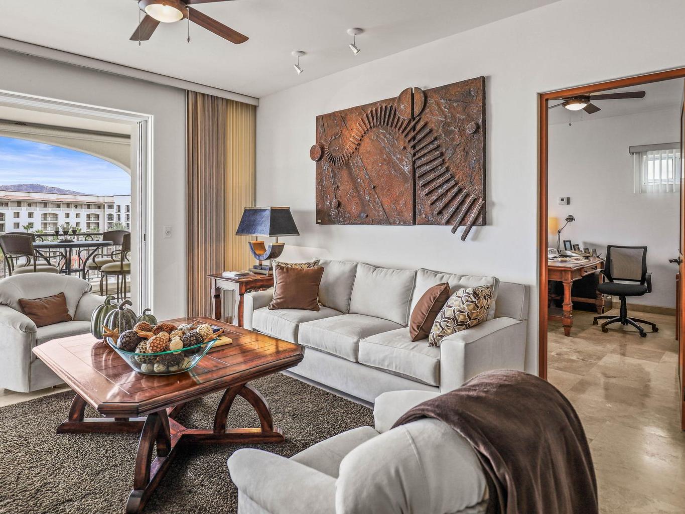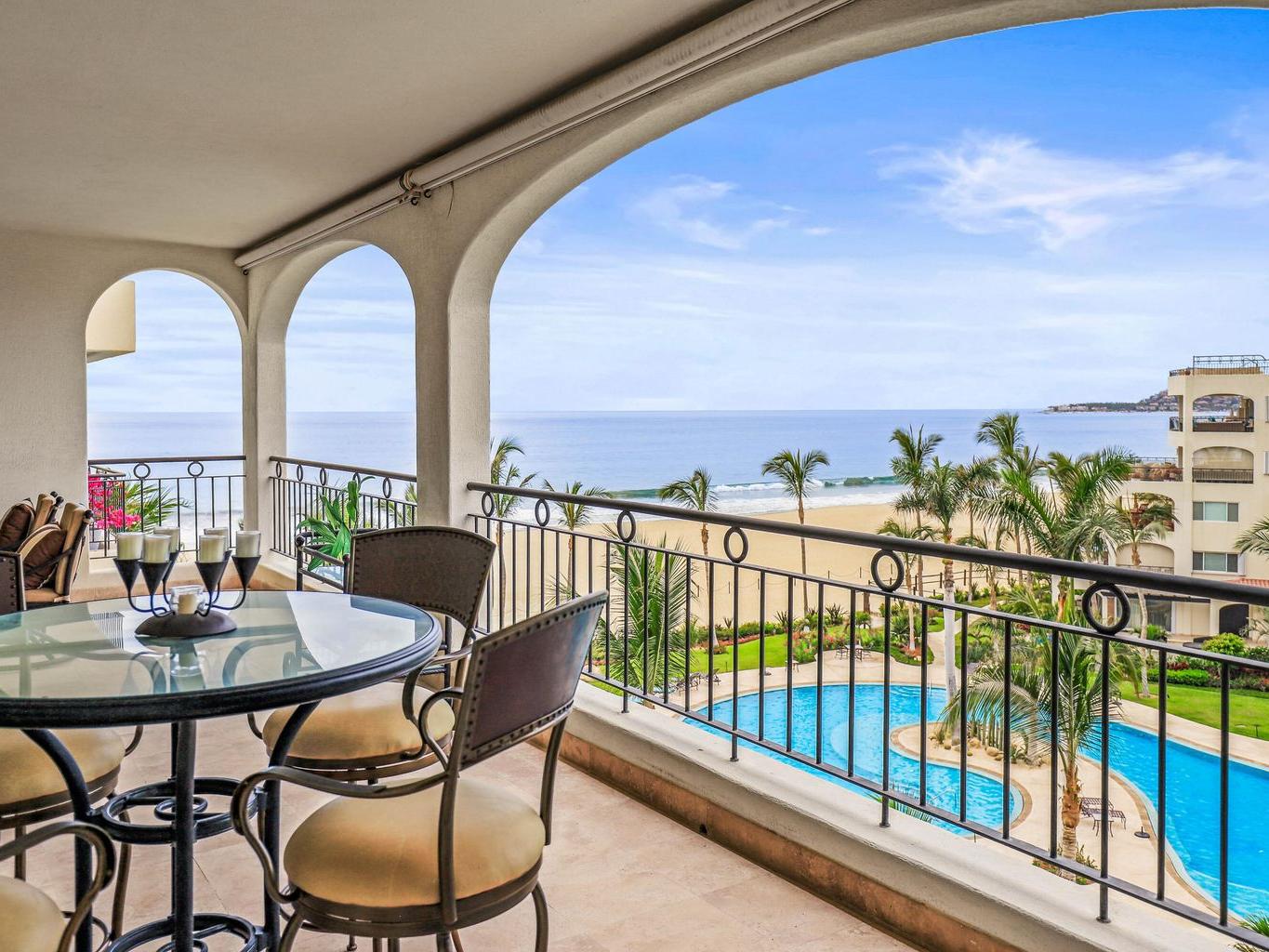 Location is everything at upscale, BEACHFRONT, TORTUGA BAY. #1503 is a 2 BD/2BA on the 5th floor of the 1st phase of this exclusive enclave of 33 luxury condominiums, Generous 2000 sq ft floor plan is bright and airy. Pocket doors open indoors out to the covered patio. Perfect for year round enjoyment. Views to the west & Palmilla point. Open concept great room. Modern kitchen w/ Viking,Sub-Zero, appliances, custom walk in pantry. Large primary suite has a dedicated office space & ensuite BA has a walk in closet.