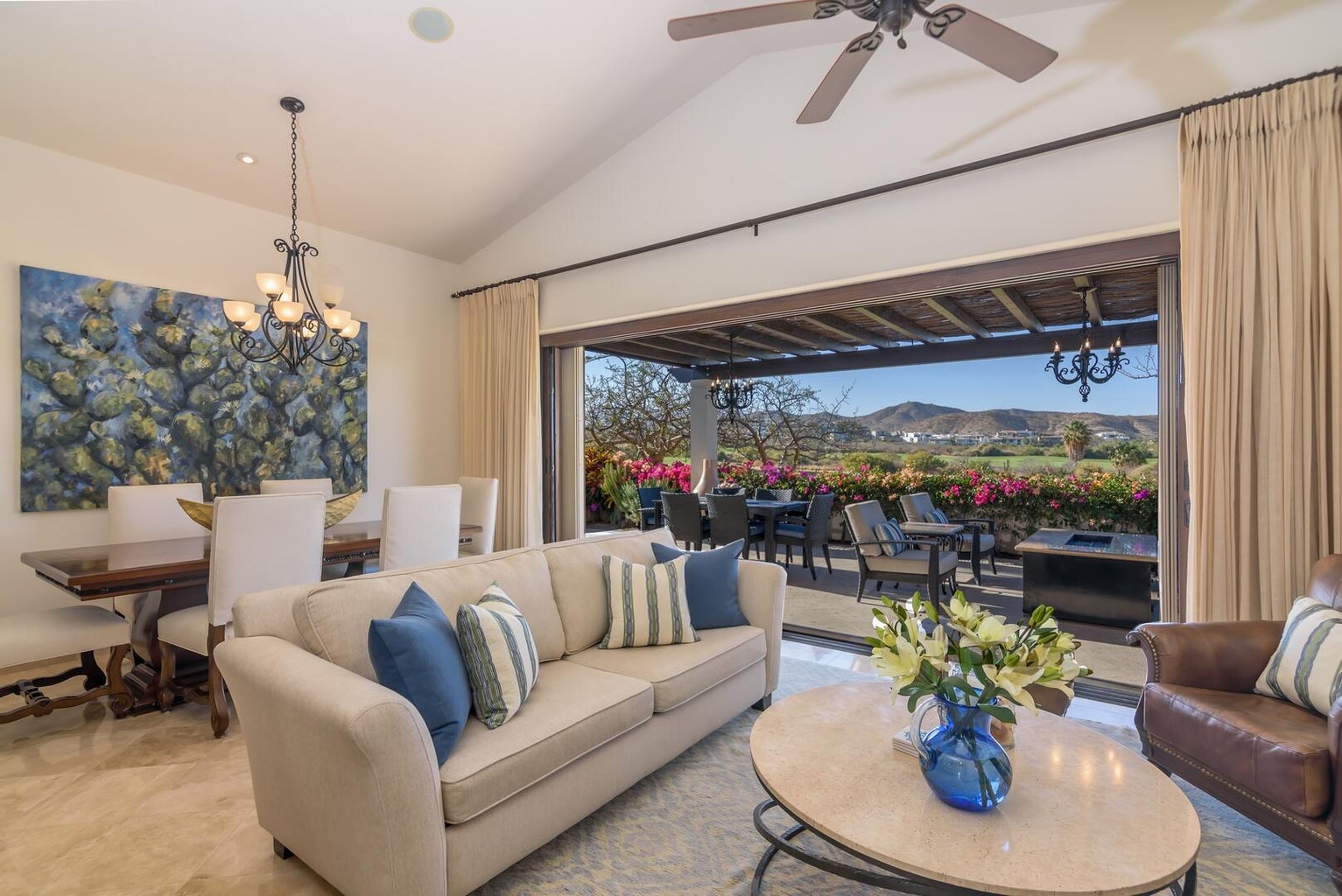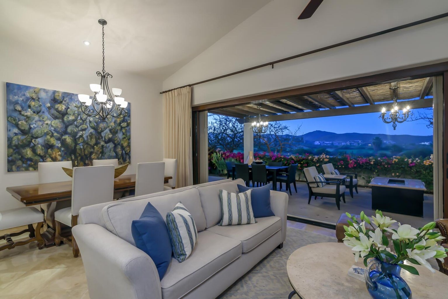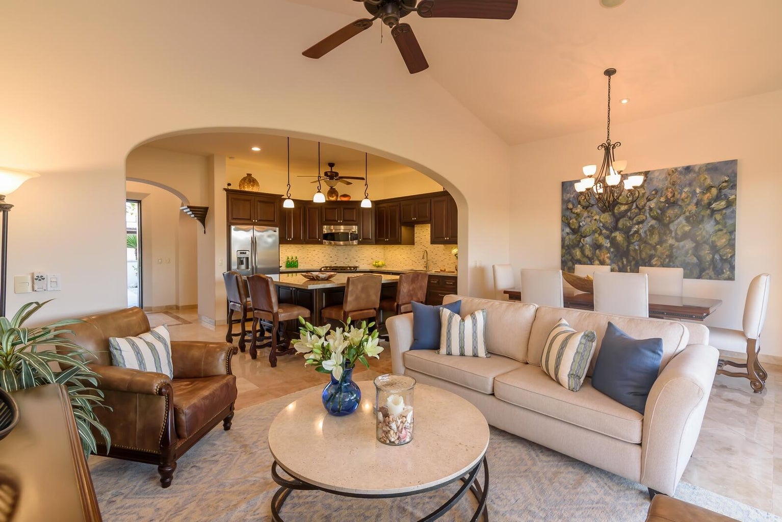 Enjoy a warm, welcoming community just a short walk to the beach and private Beach Club. Set fairway front, on the 13th fairway of the Nicklaus Design Golf course in the gated, master planned Club Campestre community, Hacienda Campestre 20 is an immaculately maintained, beautifully furnished, single-level turn key home with many fabulous upgrades. Enjoy golf and sea views by day and stargazing at night from the rooftop viewing lounge. 3 BR / 3 Bath home. Master suite with custom designed bathroom, spa-style walk in marble shower and plenty of closet space. Guest suite with en suite bath, third bedroom currently used as an office, includes sofa/sleeper with queen mattress for the comfort of your guests. Full third bath doubles as guest bath. Open concept gourmet kitchen with