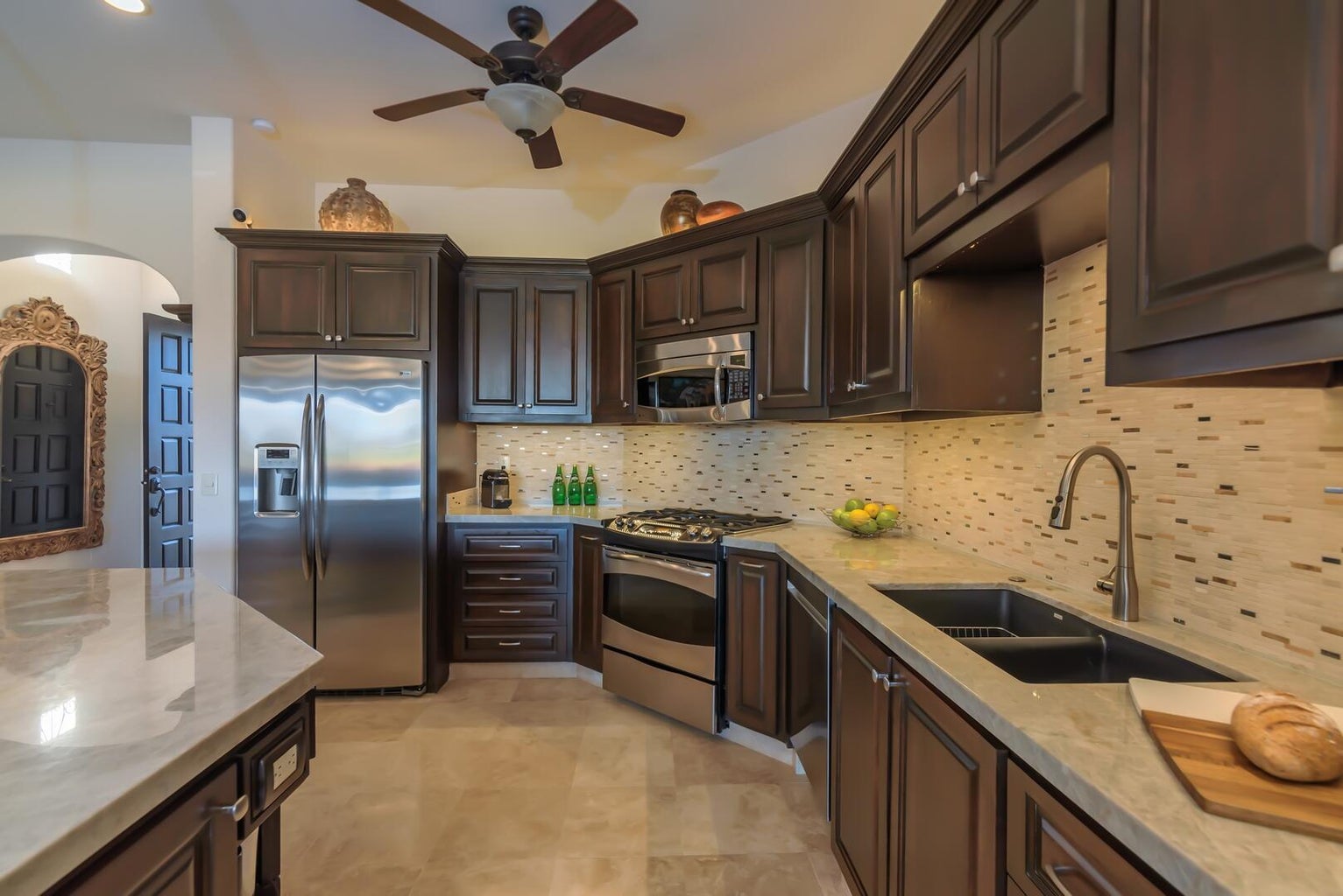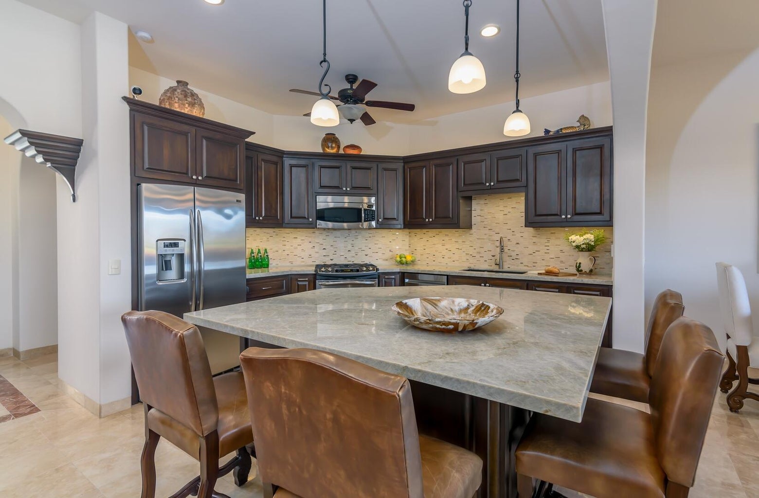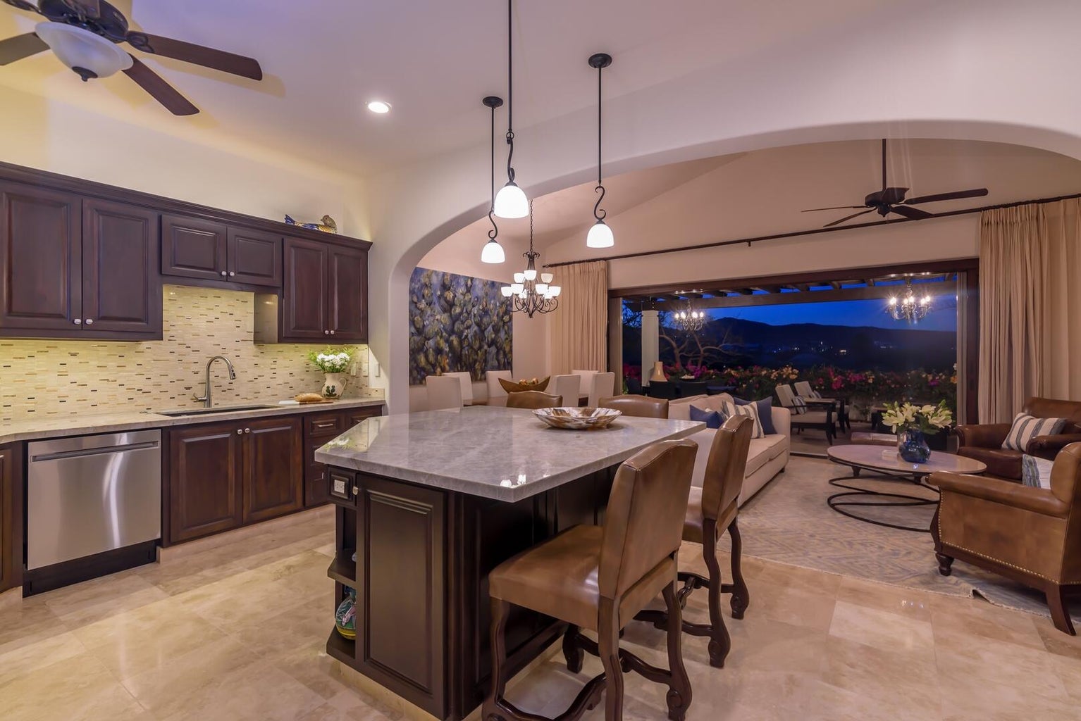Enjoy a warm, welcoming community just a short walk to the beach and private Beach Club. Set fairway front, on the 13th fairway of the Nicklaus Design Golf course in the gated, master planned Club Campestre community, Hacienda Campestre 20 is an immaculately maintained, beautifully furnished, single-level turn key home with many fabulous upgrades. Enjoy golf and sea views by day and stargazing at night from the rooftop viewing lounge. 3 BR / 3 Bath home. Master suite with custom designed bathroom, spa-style walk in marble shower and plenty of closet space. Guest suite with en suite bath, third bedroom currently used as an office, includes sofa/sleeper with queen mattress for the comfort of your guests. Full third bath doubles as guest bath. Open concept gourmet kitchen with