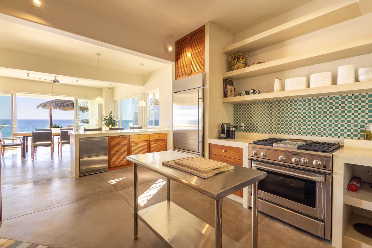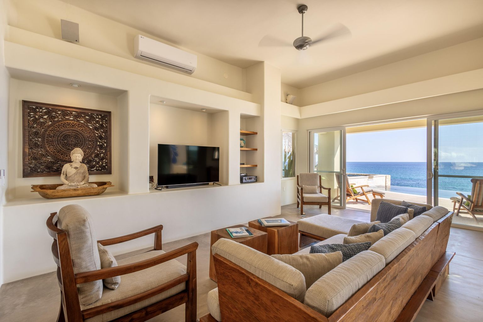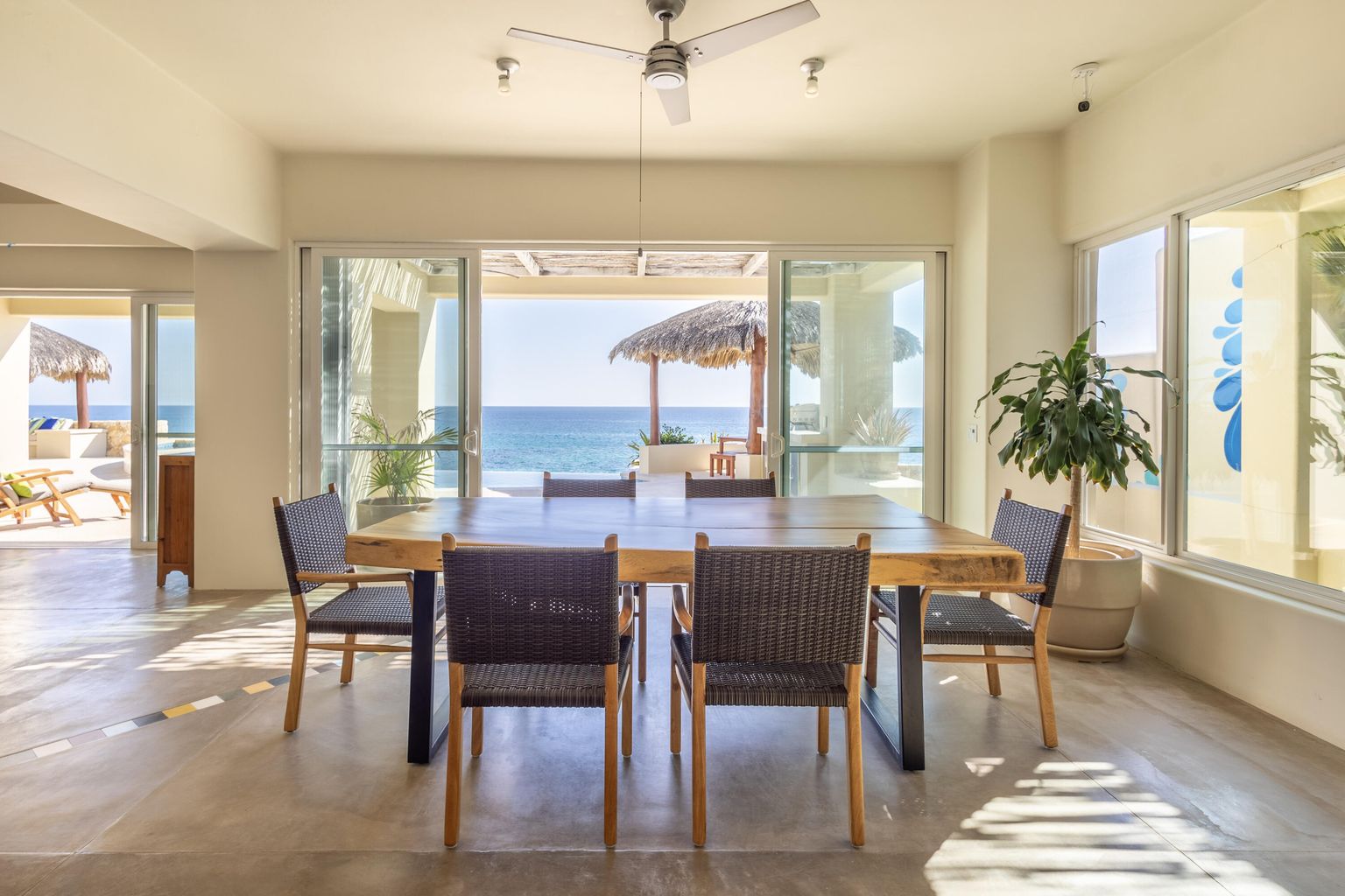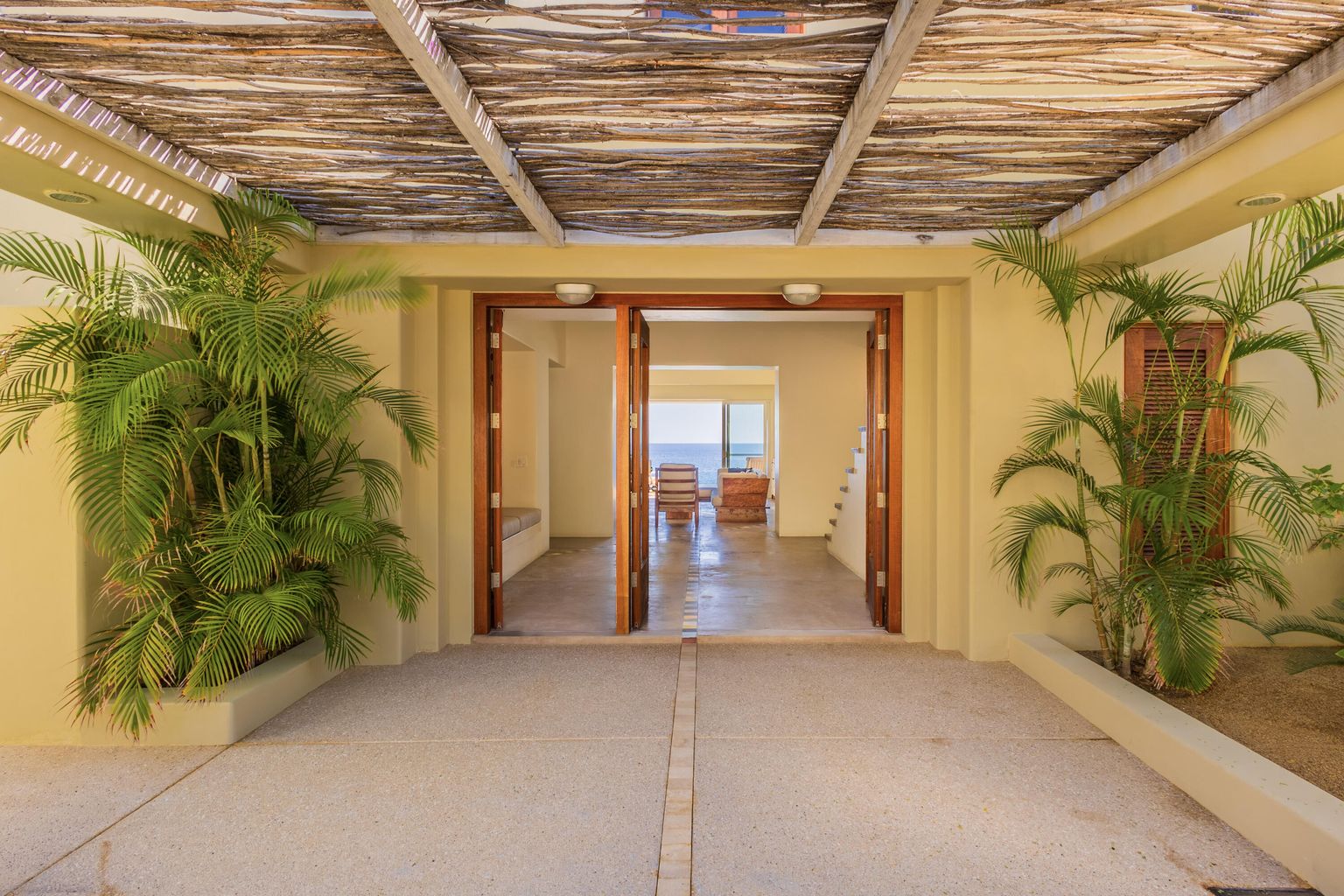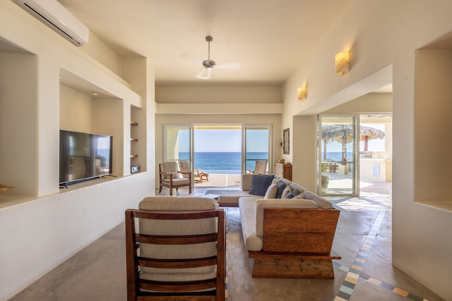 This magnificent beachfront estate offers a perfect blend of elegance, privacy, and breathtaking ocean views. This 7-bedroom property is laid out as follows: The main house features three beautifully designed bedrooms, including an extraordinary primary suite that feels like a private retreat. Complete with two terraces overlooking the ocean, a cozy TV nook, a spacious office or multipurpose room, and a private gym, the suite is a haven of comfort and sophistication. The main house opens to a resort-style pool area with palapa pergolas, a fire pit, and a large sunbathing deck, creating a seamless indoor-outdoor living experience.