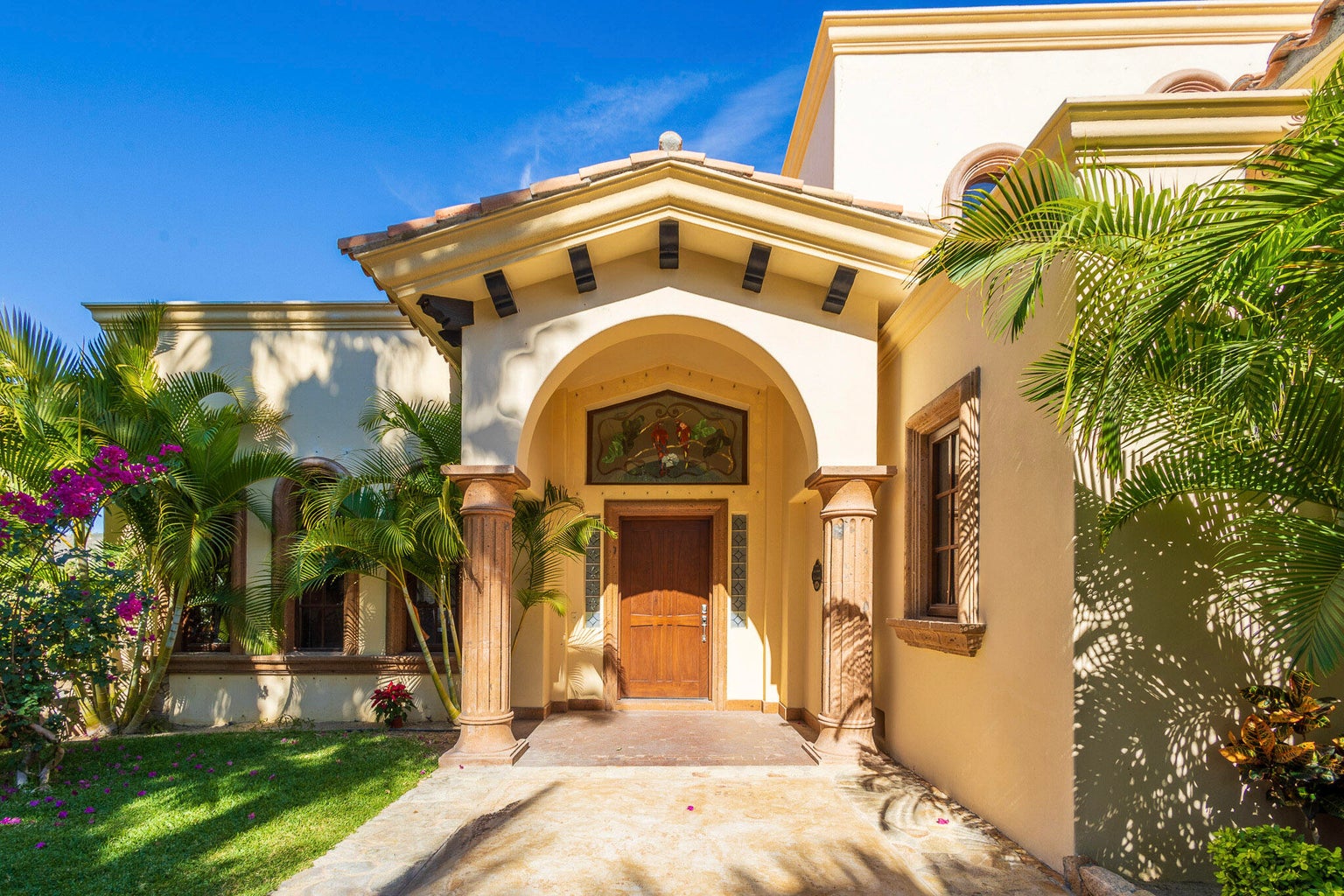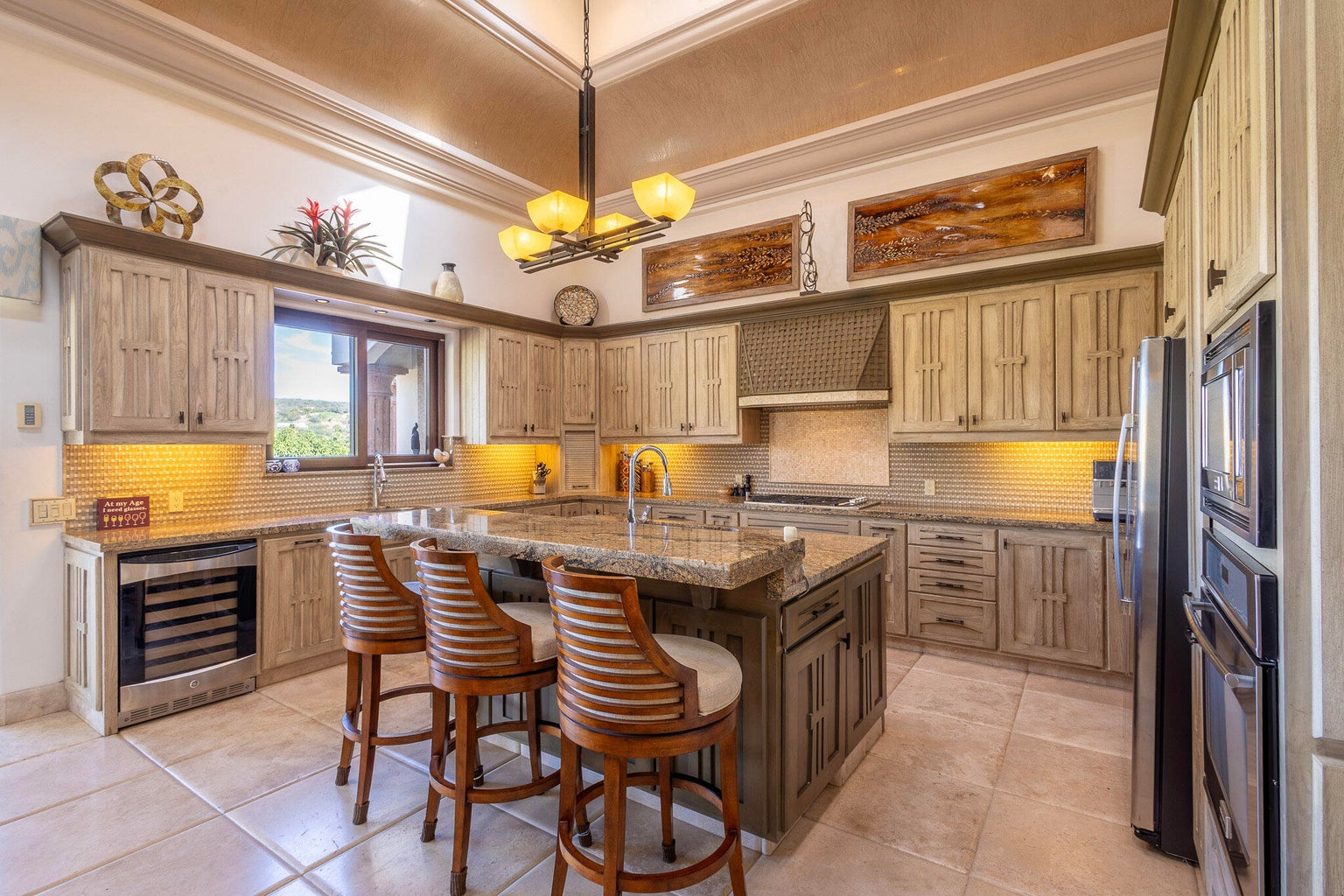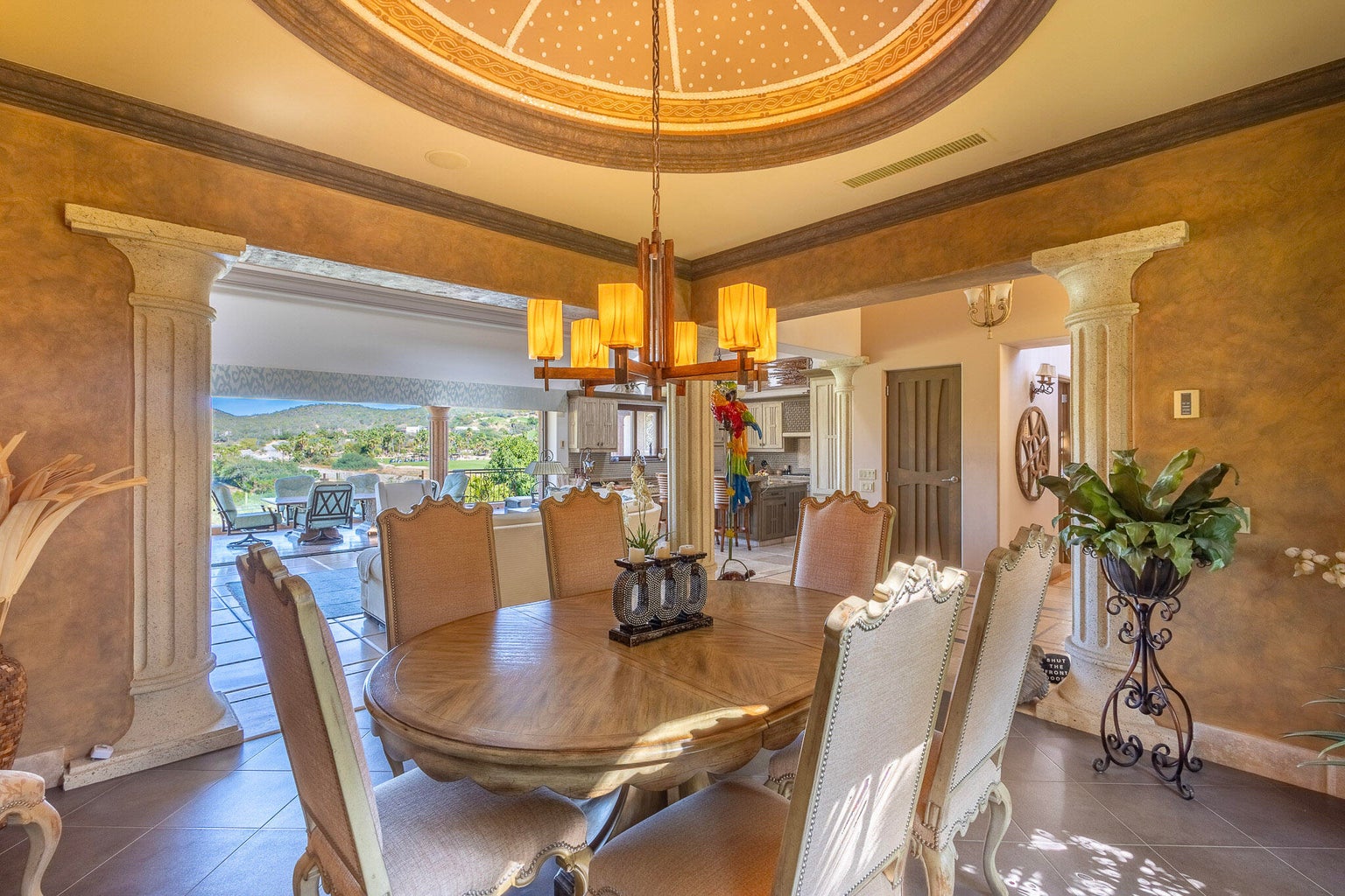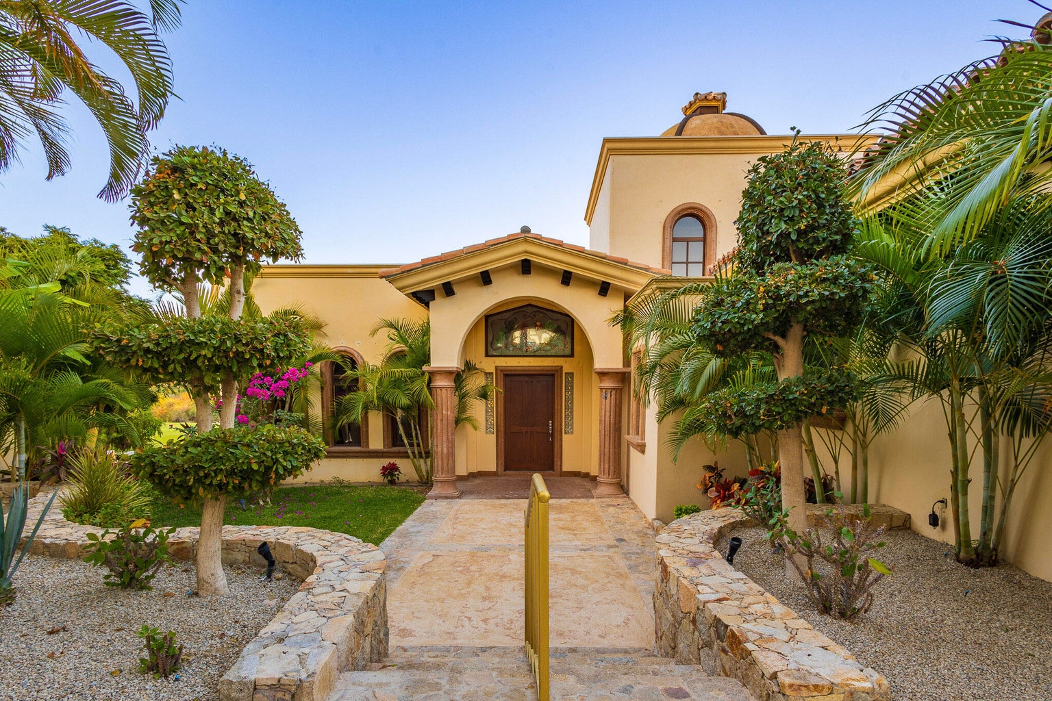 Casa Joya Escondida is a peaceful fairway front retreat in the exclusive La Noria subdivision of Puerto Los Cabos. This 4BR, 4.5BA home boasts vaulted ceilings, abundant natural light, and breathtaking views of six golf fairways. The main level, perfect for single-level living, includes a primary suite with terrace access, a luxurious bath, an open-concept living/dining area, a well-appointed kitchen, a laundry room, and an enclosed office. The lower level offers two bedrooms, a media room with projector, a kitchenette, and a covered terrace leading to the pool, jacuzzi, fire pit, and outdoor living space. Additional features: rooftop terrace with ocean views, oversized garage, generator, hurricane shutters, and cistern. Ultimate privacy and tranquility await...