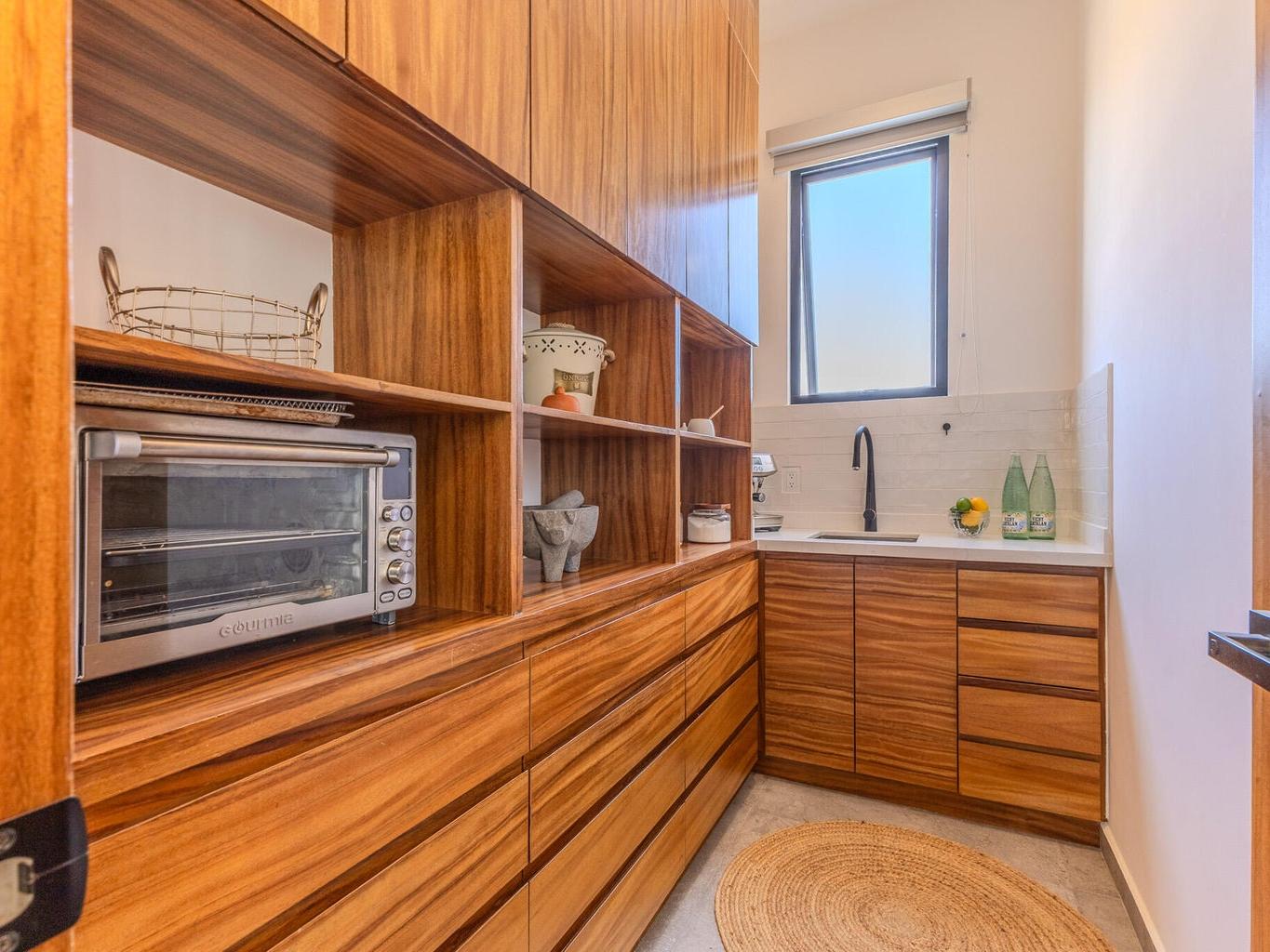 The chef's kitchen is made for entertaining, featuring premium Thermador appliances, an 8-burner gas stove, commercial-grade oven, and an 88-bottle wine fridge. Every detail is thoughtfully selected for both beauty and performance.