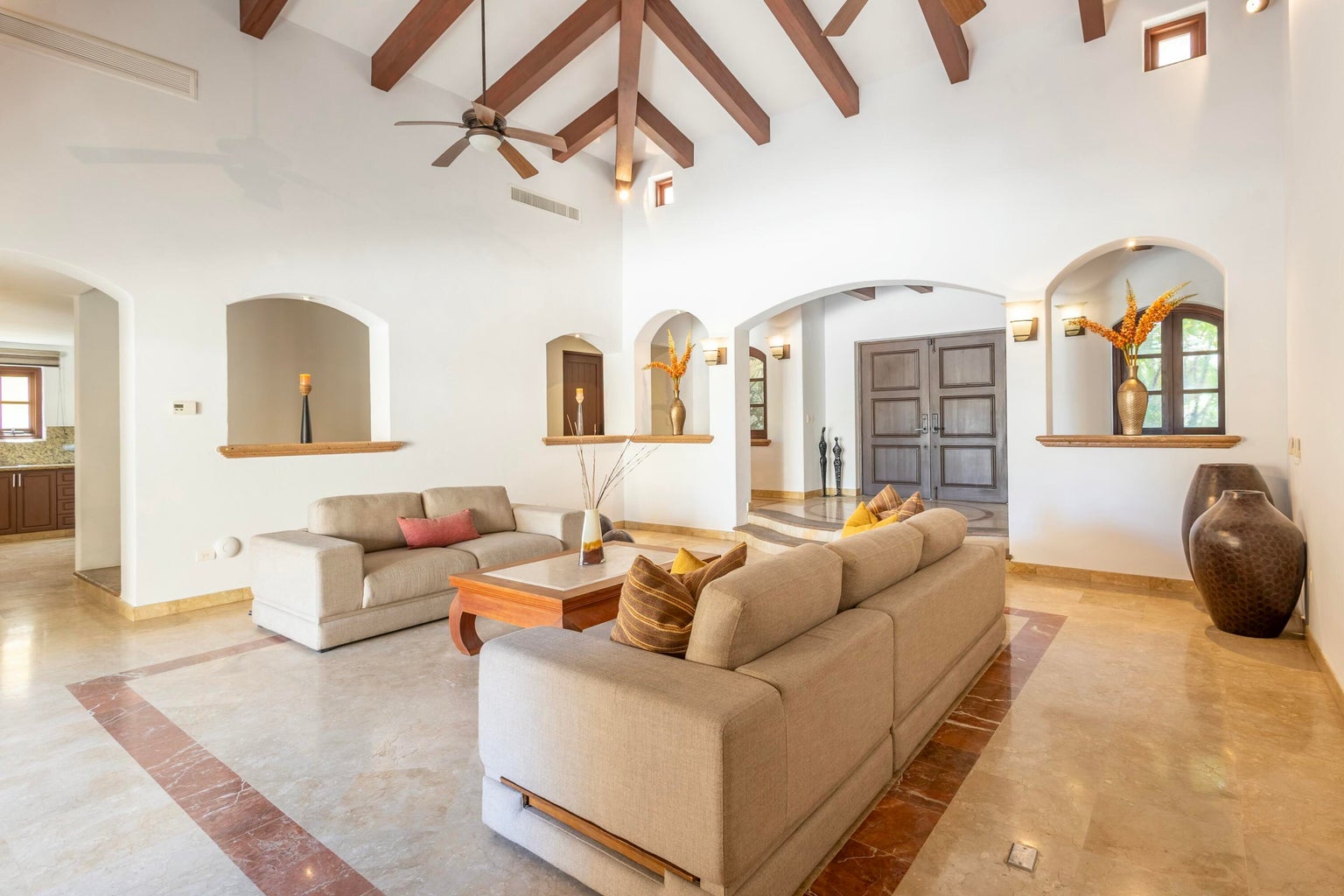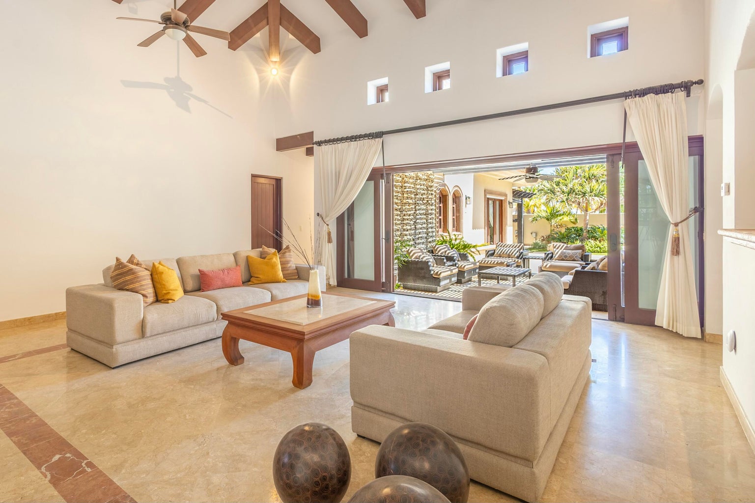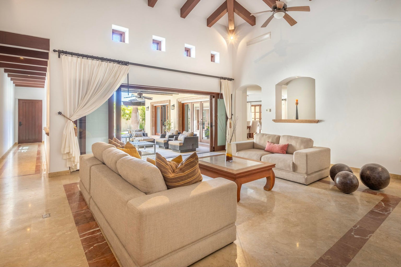 Welcome to Casa Palma, a single level 4-bedroom, 4.5-bath home in the gated community of La Jolla. This beautifully designed property offers 3 bedrooms with en-suites inside and a 4th bedroom with en-suite outside, currently set up as a TV room but perfect for a guest room or a home office.