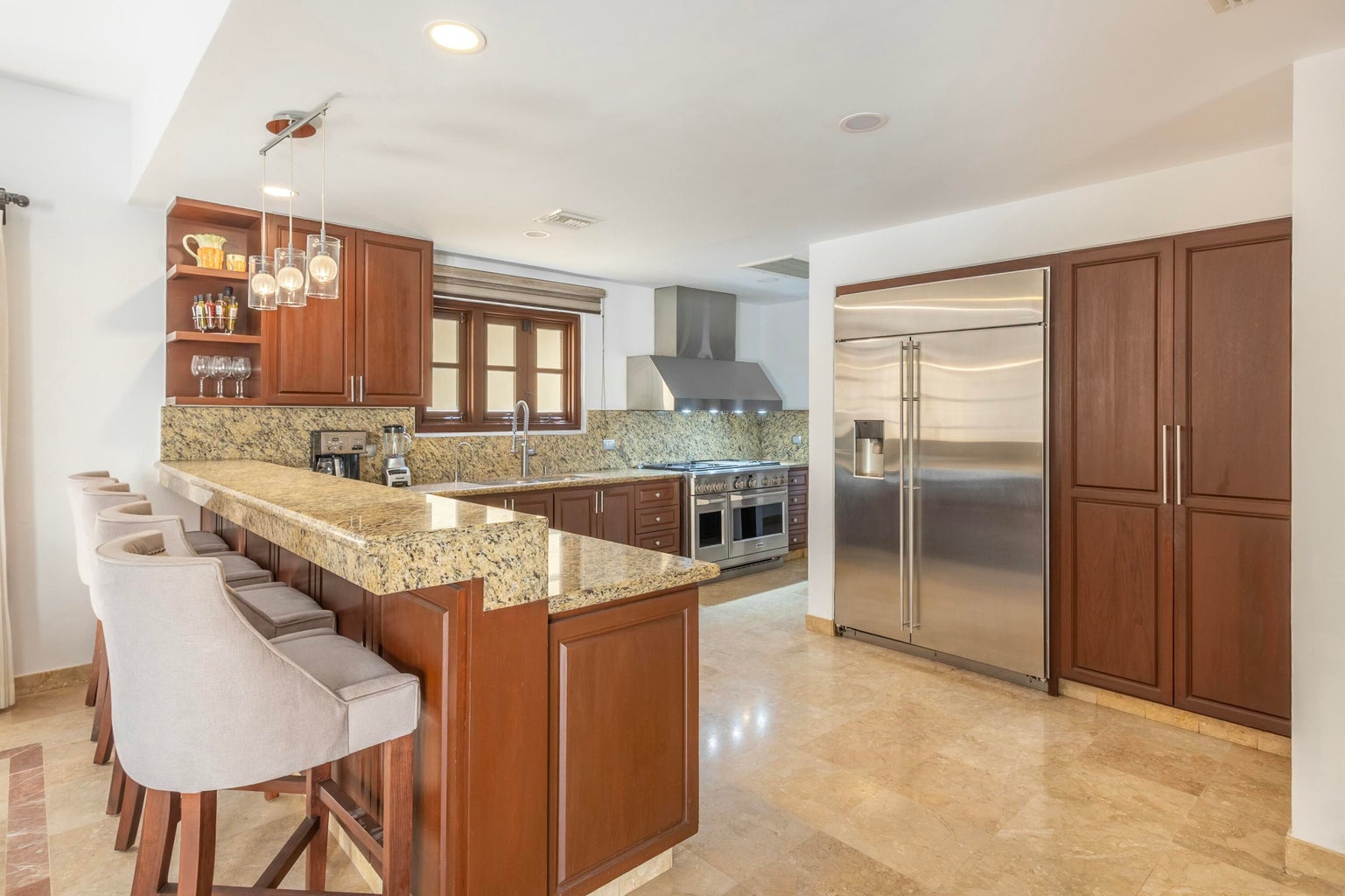 The spacious living area features vaulted beamed ceilings that open to a large exterior patio, creating a nice flow between indoor and outdoor living. The kitchen and dining area offer GE Monogram appliances, including a six-burner stove and full-size refrigerator, a purified water system, and a garbage disposal, sleek granite countertops and tons of seating for family and guest.