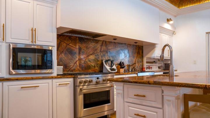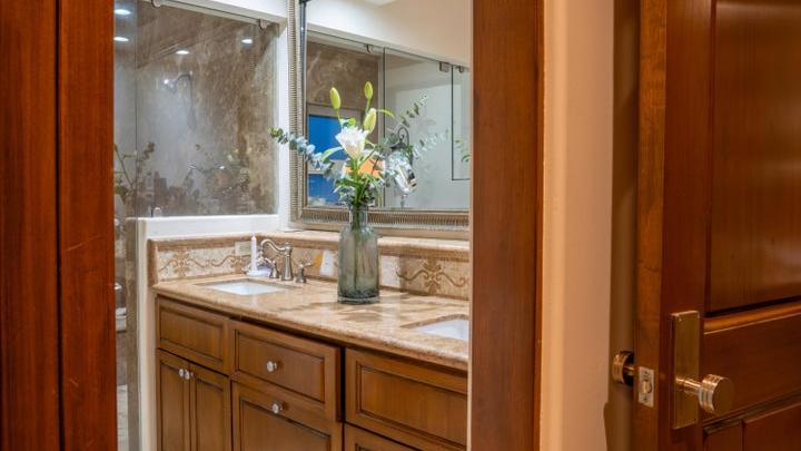 Mediterranean-style Home with a poolside bar and generously proportioned patio with its water features, putting green, p...