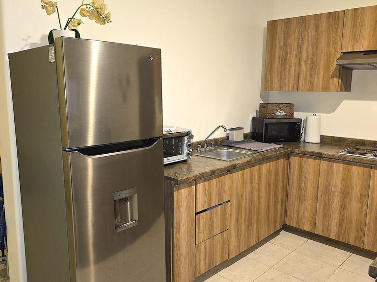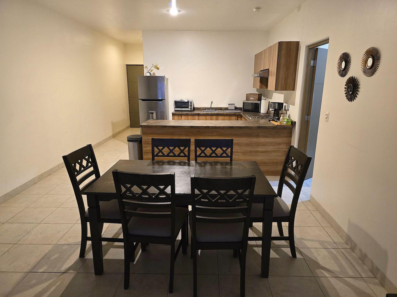 Equipped kitchen, dining area, and living room with sofa bed (ideal for 2 kids)