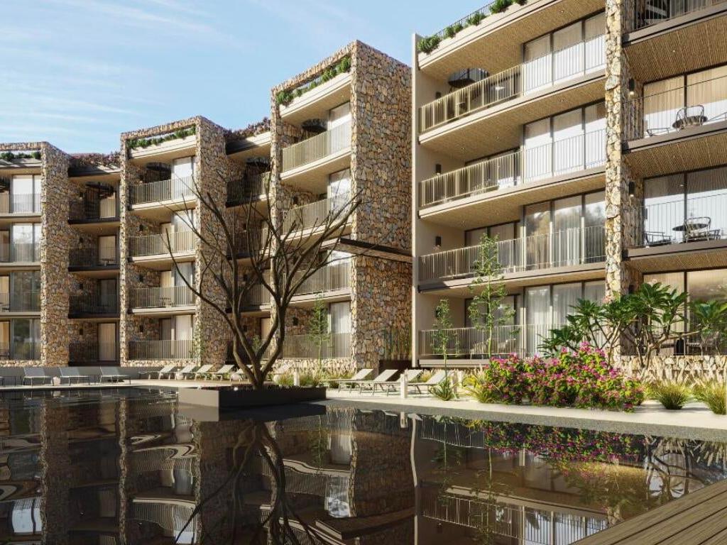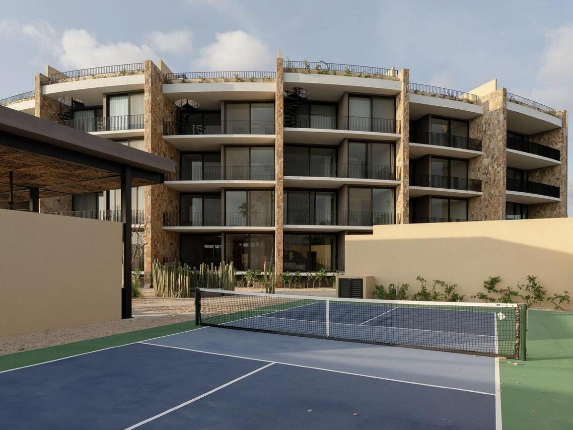 Residents enjoy resort-style amenities, including a heated semi-Olympic pool, fully equipped gym, yoga deck, spa and wellness area, pickleball court, ludoteca, business center, fire pit, and jacuzzi.