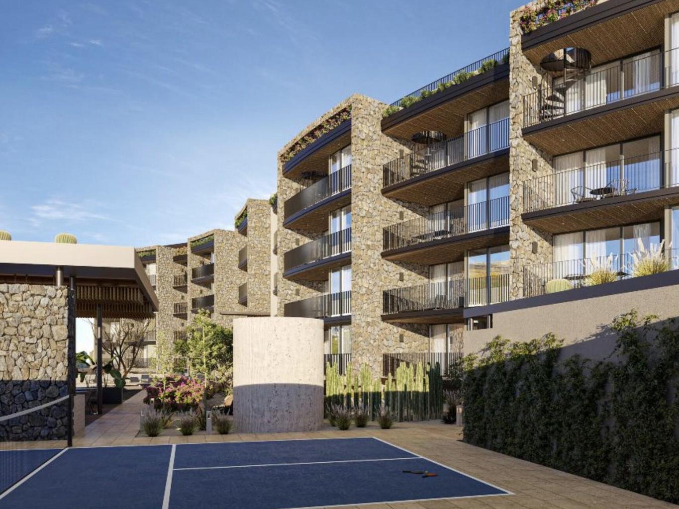 Residents enjoy resort-style amenities, including a heated semi-Olympic pool, fully equipped gym, yoga deck, spa and wellness area, pickleball court, ludoteca, business center, fire pit, and jacuzzi.