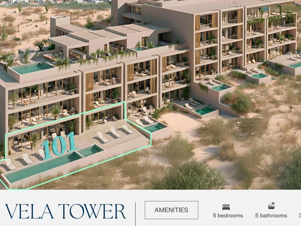 Experience effortless luxury in this brand-new 5-bedroom Garden Villa at Cabo Costa - Vela Tower. A perfect blend of modern design and natural harmony, featuring spacious interiors, a private garden, and your own dipping pool for relaxing under the Cabo sun. Enjoy stunning views of the Sea of Cortez, two elegant master suites, two stylish guest rooms, and a flexible fifth room ideal for an office or media space. Resort-style amenities include an Infinity pool, Clubhouse, Gym, Jacuzzi, Wet bar, Sundeck, Kids area, and Massage zone. Your private coastal retreat awaits—only a few remain!